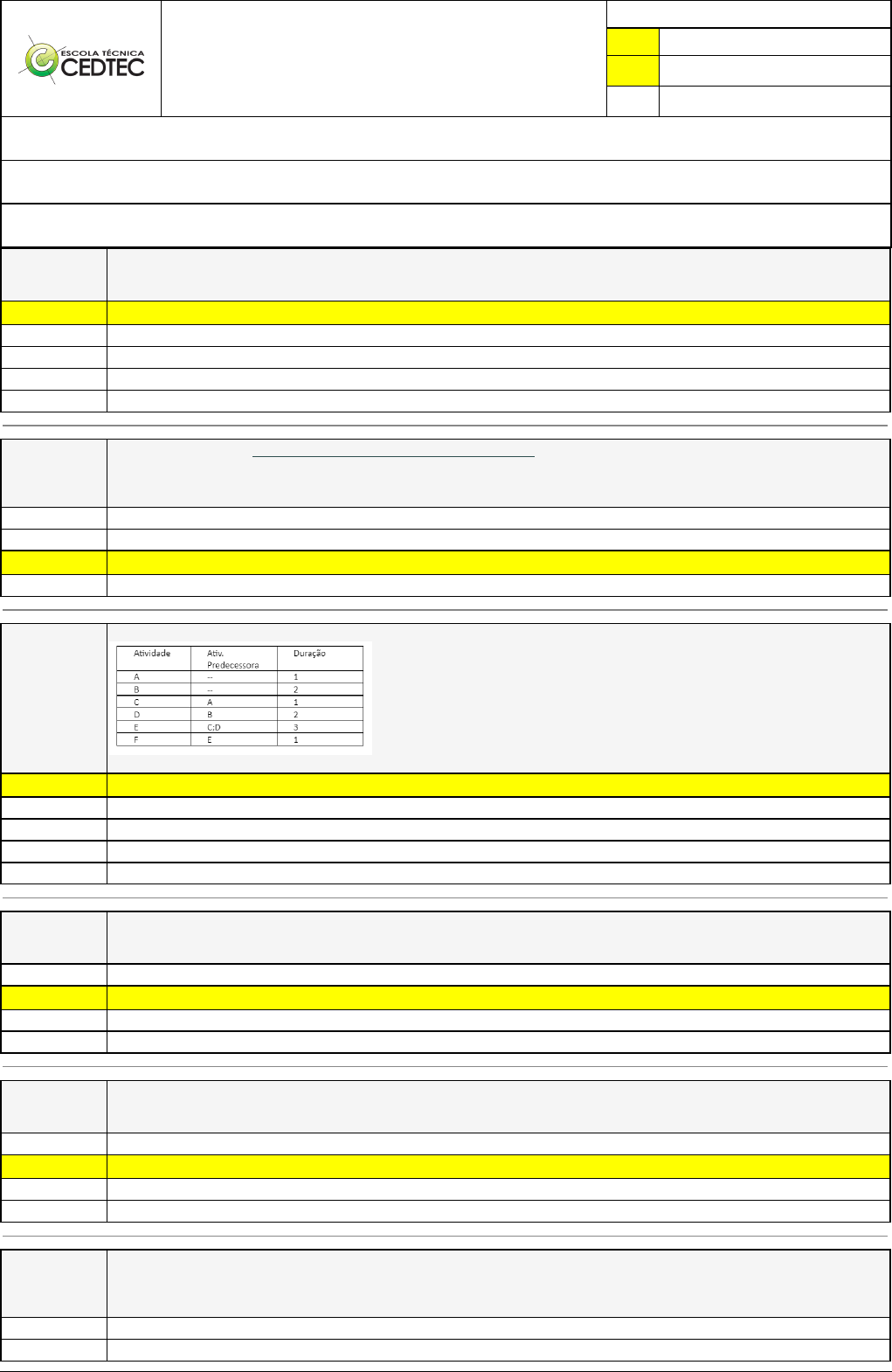Pincel Atômico - 03/11/2022 11:26:00 1/4 Avaliação Presencial (EAD) Atividade finalizada em 15/10/2022 10:33:11 (502637 / 1) LEGENDA Resposta correta na questão # Resposta correta - Questão Anulada X Resposta selecionada pelo Aluno Disciplina: PLANEJAMENTO E CONTROLE DA MANUTENÇÃO [469572] - Avaliação com 20 questões, com o peso total de 51,00 pontos [capítulos - Todos] Turma: Curso Técnico: Eletrotécnica - Grupo: EAD - JUNHO/22 - EAD ELE [68219] Aluno(a): 91321213 - GEONE OLIVEIRA SANTOS - Respondeu 18 questões corretas, obtendo um total de 45,90 pontos como nota [350150_127016] Questão 001 Na máquina em questão foi adquirida por R$ 234.000,00, e realizando o levantamento de custo, foi investido R$35.000,00 somente com manutenção. Qual o CPMR da nossa máquina? X 14,95% 6,68% 5,98% 9,80% 1,49% [350150_2202] Questão 002 TOTAL DE HH CARTEIRA (EM DIAS) CAPACIDADE DE TRAB. DIARIO DA EQUIPE (HH) Indicador que mede o tempo que uma equipe de manutenção deverá trabalhar para executar os serviços pendentes, supondo que não cheguem novas solicitações de serviços durante a execução dos mesmos, é? A Produtividade. MTBF. X Backlog. A Disponibilidade. [350150_127009] Questão 003 Considere o seguinte projeto: Qual opção corresponde ao caminho crítico do projeto? X B;D;E;F A;C;D;E;F A;C;E;F A;B;C;E;F A;B;D;E;F [350150_2195] Questão 004 Dentre os indicadores de Equipamentos, o mais importante é: Indicadores de Manutenibilidade. X Indicadores de Disponibilidade. Indicadores de Confiabilidade. Indicadores de Mantenabilidade. [350150_2193] Questão 005 A principal função dos Indicadores de Desempenho é: Indicar as falhas dos processos de trabalho. X Indicar oportunidades de melhoria dentro das organizações Indicar necessidades de serviços. Indicar possibilidades de negócio. [350150_9113] Questão 006 Ao realizar a manutenção nos freios de translado de uma ponte rolante em uma grande empresa, o operador percebeu que a polia do munhão, por onde passa o cabo de aço para içamento, não estava girando. Rapidamente o operador desatarraxou o parafuso de fixação da polia e manuteniu o sistema. A polia voltou a funcionar regularmente. Qual foi o tipo de manutenção realizada nessa ocasião? Manutenção Preditiva. Manutenção Produtiva Total. Pincel Atômico - 03/11/2022 11:26:00 2/4 Manutenção de Rotina. Manutenção Preventiva. X Manutenção Corretiva não Planejada. [350150_9122] Questão 007 Qual das alternativas abaixo, NÃO corresponde as funções de um núcleo de gestão de contratos: Fiscalizar Contratos. Gerenciar contratos. X Planejar projetos. Firmar contratos em favor de demandas. Realizar Medições. [350150_127003] Questão 008 Estratégia de mitigação de falha com o objetivo de aumentar a confiabilidade dos equipamentos, e melhorando as tratativas de falhas e defeitos, através de um questionário. TPM X MCC FMEA Ishikawa PDCA [350150_2186] Questão 009 Ciclo de vida; Incerteza; Possibilidade de Mudanças; Aumento de conhecimento com o tempo e Interfuncionalidade são. Ciclos de vida de um Projeto. Propósitos de um Projeto. X Características comuns aos Projetos. Etapas do escopo de um projeto. [350150_20491] Questão 010 Nas empresas organizadas, os Indicadores de Desempenho da Manutenção são apurados a partir dos resultados coletados mensalmente e são classificados nos seguintes grupos, EXCETO: Indicadores Administrativos Indicadores de Serviço Indicadores de Equipamentos X Indicadores de Temp Indicadores de Custos [350149_2198] Questão 011 São indicadores de Indisponibilidade Operacional: Indisponibilidade total, Indisponibilidade operacional e Indisponibilidade por parada programada. X Indisponibilidade total, Indisponibilidade por falha e Indisponibilidade por parada programada. Indisponibilidade parcial, Indisponibilidade total e Indisponibilidade por parada programada. Indisponibilidade por falha, Indisponibilidade parcial e Indisponibilidade por parada programada. [350149_7388] Questão 012 O método PERT/CPM é também chamado de: X Método do Caminho Crítico. Método de Gantt. Método de Engenharia Reversa. Método Gráfico. Método de Controle Total. [350149_9107] Questão 013 O termo H-H, está presente em quase todas as ordens de serviço de manutenção. O que significa esse termo? X Homem Hora. Hora Máquina de Trabalho. Homem – Homem para trabalho. Precisa-se de dois homens para se realizar essa atividade. Homem Máquina de trabalho. Pincel Atômico - 03/11/2022 11:26:00 3/4 [350149_2191] Questão 014 As fases: não iniciada; programada; iniciada; suspensa e encerrada, faz parte de: NRA (Nenhuma das alternativas). X OM (Ordem de Manutenção). SS (Solicitação de Serviços). Plano de Manutenção. [350149_9108] Questão 015 Quantas horas de trabalho possui um equipamento que trabalha sobre o regime Horas Calendário em um mês comercial? 744 176 184 208 X 720 [350149_2197] Questão 016 De acordo com as Condições de Utilização, o indicador .................. pode ser utilizado para controle de qualquer tipo de item- componetes, conjuntos ou partes de um equipamento, sistemas, equipamento ou instalação: Indisponibilidade operacional. X Tempo médio entre falhas. Índice de parada por falha. Taxa de falha. [350148_7384] Questão 017 Qual indicador utilizado para avaliar o número de OSs pendentes de realização (quitação)? Taxa de gravidade de acidentes X Backlog Retrabalho Índice de Preventivas Índice de Corretivas [350148_20502] Questão 018 No relatório de desempenho da equipe de 5(cinco) operadores do mês de Janeiro, foram observados quatro dias de faltas e 2 horas de atrasos, sem contar outros afastamentos a longo prazo. Considerando que a mesma equipe trabalha numa jornada comum de 8 horas/dia ou 160 horas/mês. Calcule o Indicador de Absenteísmo (ABS) desta equipe: ABS = ((homens x horas não registradas no ponto) / (homens x horas possíveis de trabalho) x 100) 5 % 4 % 3,75 % X 25 % 21,25 % [3501
