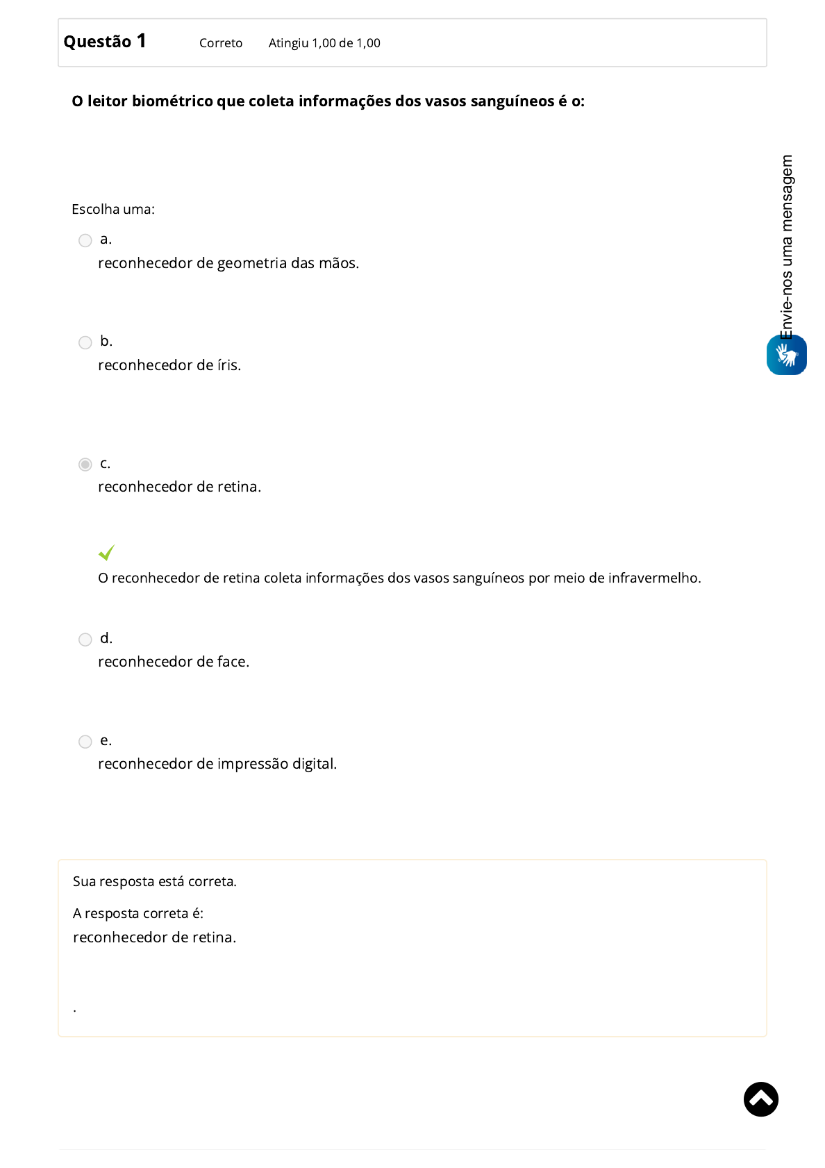 Questão 1 Correto Atingiu 1,00 de 1,00 O leitor biométrico que coleta informações dos vasos sanguíneos é o: Escolha uma: a. reconhecedor de geometria das mãos. b. reconhecedor de íris. c. reconhecedor de retina. O reconhecedor de retina coleta informações dos vasos sanguíneos por meio de infravermelho. d. reconhecedor de face. e. reconhecedor de impressão digital. Sua resposta está correta. A resposta correta é: reconhecedor de retina. . En vi e- no s um a m en sa ge m Questão 2 Correto Atingiu 1,00 de 1,00 Dentre as opções a seguir assinale aquela que apresenta um mouse com maior precisão se comparada com um mouse de precisão de 5.600 dpi. Escolha uma: a. 300 dpi b. 600 dpi c. 2.600 dpi d. 4.800 dpi e. 8.200 dpi Quanto maior o número de dpi, mais preciso é o mouse, portanto 8.200 é maior que 5.600. Sua resposta está correta. A resposta correta é: 8.200 dpi . En vi e- no s um a m en sa ge m Questão 3 Correto Atingiu 1,00 de 1,00 O dispositivo que exige maior velocidade (taxa de transmissão) de processamento é o: Escolha uma: a. Teclado b. Mouse c. Câmeras de vídeo As câmeras de vídeo são os dispositivos de entrada que podem exigir as maiores taxas de transmissão. d. Leitor de CD-ROM e. Scanner Sua resposta está correta. A resposta correta é: Câmeras de vídeo . En vi e- no s um a m en sa ge m http://ead.iesp.edu.br/mod/lti/view.php?id=45628 Questão 4 Correto Atingiu 1,00 de 1,00 Um arquivo de 27,5 GB pode ser armazenado como um arquivo completo em um: Escolha uma: a. CD-ROM dupla camada. b. DVD de duas faces e duas camadas. c. Blu-Ray de uma face. d. Blu-Ray de duas faces Resposta Correta. e. miniSD. Sua resposta está correta. A resposta correta é: Blu-Ray de duas faces . Questão 5 Incorreto Atingiu 0,00 de 1,00 Como se chama a parte da memória que os sistemas utilizam para armazenar temporariamente os dados durante um processamento de transferência de informações? Escolha uma: a. Memória RAM. A memória RAM é a principal memória do sistema. b. Bu�er. c. EEPROM. d. Memória Flash. e. CompactFlash. Sua resposta está incorreta. A resposta correta é: Bu�er. . Questão 6 Correto Atingiu 1,00 de 1,00 Com relação à hierarquia de memórias, qual é a memória mais rápida? Escolha uma: a. Memória cache. b. Memória RAM. c. Disco óptico. d. Disco magnético. e. Registrador. Resposta Correta. Sua resposta está correta. A resposta correta é: Registrador. . Questão 7 Correto Atingiu 1,00 de 1,00 Qual dos conectores a seguir é um conector somente de áudio? Escolha uma: a. HDMI. b. USB. c. DVI. d. S/PDIF. O S/PDIF só transmite áudio de alta qualidade. e. SCSI. Sua resposta está correta. A resposta correta é: S/PDIF. . Questão 8 Incorreto Atingiu 0,00 de 1,00 O que as caixas acústicas utilizam como principal meio de conversão da corrente elétrica em som? Escolha uma: a. Um cone de papelão. b. A interação entre dois campos magnéticos. c. Um ímã. O ímã provê um dos campos magnéticos, mas não faz a conversão. d. A sublimação. e. O ar. Sua resposta está incorreta. A resposta correta é: A interação entre dois campos magnéticos. . Questão 9 Correto Atingiu 1,00 de 1,00 Na sigla CYMK, o K representa a cor? Escolha uma: a. Preta. O K representa o blacK. b. Ciano. c. Magenta. d. Amarela. e. Vermelha. Sua resposta está correta. A resposta correta é: Preta. . Questão 10 Correto Atingiu 1,00 de 1,00 Uma impressora que utiliza a tecnologia de impacto é a impressora? Escolha uma: a. Térmica. b. Laser. c. InkJet. d. Matricial. A impressora térmica é uma impressora de não impacto. e. À cera. Sua resposta está correta. A resposta correta é: Matricial. .