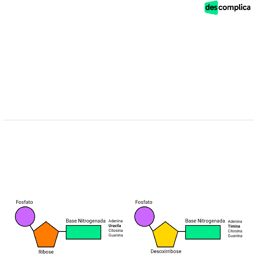 Biologia Anabolismo nuclear e síntese proteica Curiosidade Na célula procarionte, a transcrição e tradução ocorrem no citoplasma, uma vez que tal célula não possui núcleo. Teoria Antes de começarmos a aprender sobre síntese de proteínas, vamos relembrar algumas informações e conceitos importantes relacionados aos ácidos nucleicos. O DNA e o RNA são polímeros formados por monômeros denominados nucleotídeos. Os nucleotídeos são formados por: ● Bases nitrogenadas: podem ser timina (T), guanina (G), adenina (A), citosina (C) e uracila (U). A uracila está presente somente no RNA – substituindo a timina, que é exclusiva do DNA; ● Pentose: no RNA é a ribose, e no DNA é a desoxirribose; ● Radical fosfato: o único componente que não muda (𝑃𝑂4 3−). O pareamento das bases nitrogenadas na molécula de DNA se dá entre adenina e timina e entre citosina e guanina. Já no RNA, como há substituição de timina por uracila, o pareamento é entre adenina e uracila e entre citosina e guanina. Citosina e guanina são unidas por três ligações de hidrogênio, enquanto adenina e timina apenas por duas – sendo, então, mais fácil romper a ligação entre elas. As bases também são classificadas de acordo com a quantidade de anéis carbônicos, podendo ser púricas (adenina e guanina) ou pirimídicas (timina, uracila e citosina). O anabolismo celular e a síntese de proteínas ocorrem em todas as células nucleadas existentes em nosso organismo. Esses processos têm as seguintes etapas: Biologia Autoduplicação ou replicação É o processo pelo qual, a partir de uma molécula de DNA, é formada outra molécula de DNA. As principais enzimas que atuam nesse processo são a DNA-girase, DNA-helicase e DNA-polimerase. A autoduplicação é semiconservativa, pois na duplicação uma fita de DNA-mãe é conservada. Ilustração por Rebeca Khouri. No processo de autoduplicação, a DNA-girase (topoisomerase) faz com que o DNA fique em linha reta para atuação da DNA-helicase, que quebra as ligações de hidrogênio entre as duas fitas, abrindo o DNA. Assim, a DNA-polimerase atua na formação de outra fita de DNA. O sentido da replicação é 5’ → 3’, por conta do posicionamento das ligações dos carbonos da pentose (como vimos na aula sobre ácidos nucleicos). Em uma das fitas, a autoduplicação é direta e ocorre de maneira contínua – chamada de fita contínua, ou fita líder. Como as fitas são antiparalelas, o sentido 5’ → 3’ delas está em direções opostas. Por conta disso, a outra fita é replicada com ajuda de fragmentos, os chamados Fragmentos de Okazaki. Nessa fita – chamada de fita descontínua, fita tardia ou fita atrasada –, a DNA polimerase se liga ao primer formado pela DNA- primase e faz a síntese de DNA em pequenos pedaços, que são ligados entre si posteriormente pela DNA- ligase. Esquema da autoduplicação, com a fita líder sendo construída de maneira contínua no sentido 5’ → 3’ e a fita atrasada sendo construída em partes a partir dos Fragmentos de Okazaki. A forquilha de replicação é a separação entre as fitas de DNA, feita pela DNA-helicase. Fonte: Planeta Biologia. Disponível em: https://planetabiologia.com/replicacao-do-dna/. Acessado em 18/09/2021. https://planetabiologia.com/replicacao-do-dna/ Biologia Transcrição Processo no qual uma fita de DNA serve como molde para a produção de um RNA. A enzima RNA-polimerase faz a leitura do DNA e, por meio do pareamento de bases nitrogenadas, define a sequência que integra a fita única de RNAm que será formada. Ocorre no núcleo das células eucariontes e no citoplasma das células procariontes. Ilustração de um fragmento de DNA que tem duas fitas, uma em cor azul e a outra em rosa. No meio desse fragmento de DNA ocorre uma abertura das fitas, que se separam. A enzima RNA polimerase se liga à fita rosa e passa a sintetizar o RNA. Ilustração por Rebeca Khouri Existem três tipos de RNA que podem ser formados no processo de transcrição: 1. RNAm (mensageiro): é o que se traduz em proteínas no ribossomo, pois contém os códons que se pareiam aos anticódons levados pelo RNAt, juntamente com a sequência de aminoácidos na proteína em formação; 2. RNAr (ribossomal): é o que se junta a determinadas proteínas e forma o ribossomo para a síntese de proteínas; 3. RNAt (transportador): é o que transporta os anticódons a se parear com os códons do RNAm. Além disso, transporta os aminoácidos, que são utilizados na síntese de proteínas, para o ribossomo. Ilustração por Rebeca Khouri Biologia Splicing Processo no qual há a remoção de íntrons de um RNA, permanecendo somente os éxons, para a tradução em proteínas. Os seres procariontes não realizam esse processo. Ilustração de um fragmento de DNA, com partes em cor preta e partes em cor azul. Esse DNA forma um pré-RNA, com partes em cor preta (que são os éxons) e partes em cor azul, que são os íntrons. No momento da transcrição, os íntrons são retirados da fita de RNA e ficam somente os éxons. Após isso ocorre a tradução desse RNAm e a produção de proteína. Ilustração por Rebeca Khouri Splicing alternativo Processo que cria muitas proteínas diferentes, ao variar a composição do RNA maduro de acordo com os éxons do RNA. Ilustração por Rebeca Khouri Biologia Tradução Processo pelo qual o RNA é traduzido em proteínas. Para isso, é necessário que haja um ribossomo, para realizar a tradução, vários RNAt (transportador), que transportam aminoácidos ao ribossomo, e o RNAm (mensageiro), que traz a mensagem do núcleo (sequência de códons), determinando a proteína que será formada. Ocorre no citoplasma das células. Imagem que representa a tradução na formação de proteínas. Fonte: Cola da Web. Disponível em: https://www.coladaweb.com/biologia/genetica/duplicacao-do-dna-transcricao- e-traducao. Acessado em 18/09/2021. Cada códon possui três bases ni