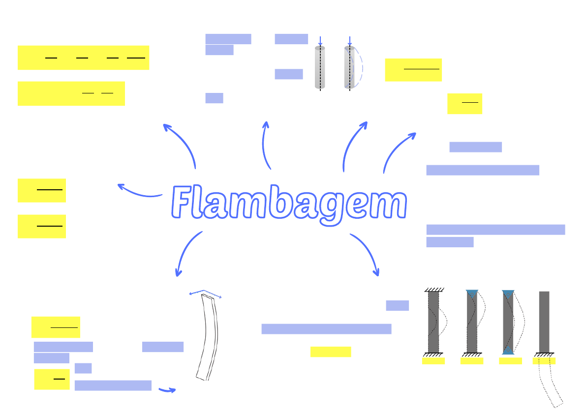 O que é? Flambagem é a deflexão lateral que pode ocorrer em elementos compridos ou esbeltos, como pilares! Presença de uma carga axial aplicada ao pilar. Carga Crítica Carga axial máxima que um pilar ou coluna suporta quando está no limite antes de ocorrer a flambagem. Caso uma coluna esteja submetida a uma carga crítica Pcr e além dela uma carga P, ela certamente sofrerá flambagem. *É a componente Pcr da fórmula da flambagem! Tensão crítica Para deformação: σcr = π² * E (L/r)² Para deformação plástica: σcr = π² * Et (K*L/r)² Fórmula da Flambagem Pcr = π² * E *I L² E = módulo de elasticidade Le = comprimento efetivo I = momento de inércia OBS.: Pcr é a carga crítica! P = Pcr F.S Carga admissível: Fórmulas da secante Para tensão: σ máx = P [ 1 + e * sec ( L P ) A r² 2r E*A √ Para deflexão máxima: υ máx = e [sec ( P * L) ] E * I 2 -1 √ e = excentricidade r = raio de giração P = carga crítica FlambagemFlambagem @bcc_rodrigues Comprimento efetivo Considera os diferentes tipos de apoio que uma coluna pode ter! Estes apoios influenciam em sua deformação na flambagem. 2 engastes engaste+pino 2 pinos extremidade livre K = 0,5 K = 0,7 K = 1 K = 2 Le = K * L Esbeltez Relação entre o comprimento e o raio de giração da coluna. Esb = K * L r K = índice do comp. efetivo L = comprimento r = raio de giração Raio de giração: relaciona o momento de inércia com a área: r = I A√ ab flambagem em torno de a OBS.: a flambagem sempre ocorre em torno do eixo da seção transversal de menor momento de inércia!