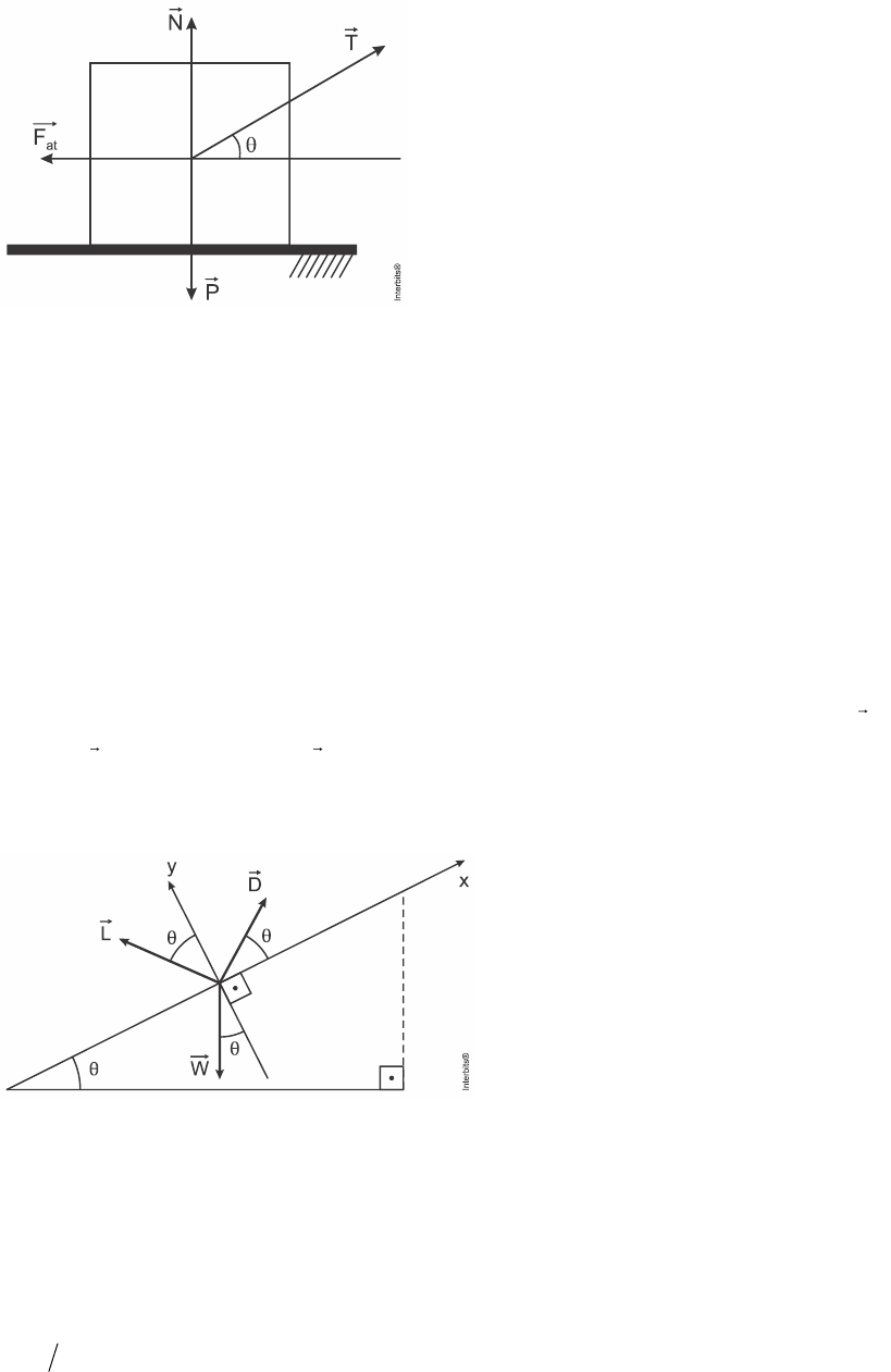 1. Uma força de tração T é aplicada em um ângulo 0 90θ sobre um bloco de peso P, que permanece em repouso. Estão agindo também a força normal N e uma força de atrito atF , conforme mostrado no diagrama: Indique a alternativa que relaciona corretamente as forças F, P, N e atF : Note e Adote: Assuma as direções e sentidos das forças conforme desenhado, mas as magnitudes são arbitrárias e não representadas em escala. a) atT F e N P b) atT F e N P= c) atT F= e N P= d) atT F= e N P e) atT F e N P 2. Um avião comercial no procedimento final, ou seja, no momento próximo da aterrissagem, atinge um ângulo chamado de “glade slope”, no qual o avião começa a descer com uma velocidade constante e sob ação, unicamente, de três forças chamadas de: peso (W), de arrasto (D) e de sustentação (L), conforme apresentado na figura a seguir. Das alternativas abaixo, assinale aquela em que está corretamente descrita a relação de condição de equilíbrio dinâmico, em relação ao eixo x. a) W D senθ= b) W sen D senθ θ= c) W L cos D senθ θ= + d) L sen W sen D cosθ θ θ+ = 3. Uma mola ideal está presa a parede e apoiada sobre um plano inclinado. Quando um bloco de massa igual a 5 kg é preso a extremidade dessa mola, esta sofre uma distensão de 20 cm, conforme o desenho. Considerando que o módulo da aceleração da gravidade no local vale 210 m s e desprezando qualquer tipo de atrito, qual o valor da constante elástica da mola em N m? a) 50 b) 100 c) 125 d) 250 4. Ao descer uma ladeira plana e inclinada 23,5 em relação à horizontal, um ciclista mantém sua velocidade constante acionando os freios da bicicleta. Considerando que a massa do ciclista e da bicicleta, juntos, seja 70 kg, que a aceleração gravitacional no local seja 210 m s , que sen23,5 0,40 = e que cos23,5 0,92, = a intensidade da resultante das forças de resistência ao movimento que atuam sobre o conjunto ciclista mais bicicleta, na direção paralela ao plano da ladeira, é a) 280 N. b) nula. c) 640 N. d) 760 N. e) 1.750 N. 5. Uma empresa testou quatro molas para utilização em um sistema de fechamento automático de portas. Para avaliar sua eficiência, elas foram fixadas a uma haste horizontal e, em suas extremidades livres, foram fixados corpos com diferentes massas. Observe na tabela os valores tanto das constantes elásticas K das molas quanto das massas dos corpos. MOLA K (N cm) MASSA DO CORPO FIXADO (kg) I 0,9 0,9 II 0,8 1,2 III 0,6 1,8 IV 0,7 1,4 Para que o sistema de fechamento funcione com mais eficiência, a mola a ser utilizada deve ser a que apresentou maior deformação no teste. Essa mola está identificada pelo seguinte número: a) I b) II c) III d) IV 6. Em um local em que a aceleração gravitacional vale 210 m s , uma pessoa eleva um objeto de peso 400 N por meio de uma roldana fixa, conforme mostra a figura, utilizando uma corda que suporta, no máximo, uma tração igual a 520 N. A máxima aceleração que a pessoa pode imprimir ao objeto durante a subida, sem que a corda se rompa, é a) 26,0 m s . b) 213 m s . c) 28,0 m s . d) 22,0 m s . e) 23,0 m s . 7. No sistema mostrado na figura a seguir, a polia e o fio são ideais (massas desprezíveis e o fio inextensível) e não deve ser considerado nenhuma forma de atrito. Sabendo-se que os corpos A e B têm massa respectivamente iguais a 4 kg e 2 kg e que o corpo A desce verticalmente a uma aceleração constante de 25 m s , qual o valor do ângulo ,θ que o plano inclinado forma com a horizontal? Adote o módulo da aceleração da gravidade igual a 210 m s . a) 45 b) 60 c) rad 4 π d) rad 6 π 8. O sistema de polias, sendo uma fixa e três móveis, encontra-se em equilíbrio estático, conforme mostra o desenho. A constante elástica da mola, ideal, de peso desprezível, é igual a 50 N cm e a força F na extremidade da corda é de intensidade igual a 100 N. Os fios e as polias, iguais, são ideais. O valor do peso do corpo X e a deformação sofrida pela mola são, respectivamente, a) 800 N e 16 cm. b) 400 N e 8 cm. c) 600 N e 7 cm. d) 800 N e 8 cm. e) 950 N e 10 cm. 9. Em um parque temático, um trator traciona dois vagões idênticos, 01 e 02, de massa M cada um. Os eixos das rodas desses vagões são livres de atritos. Em uma das viagens, o vagão 01 seguiu completamente vazio enquanto o vagão 02 estava completamente ocupado por turistas que, juntos, somavam uma massa m. No início dessa viagem, o trator imprimiu ao vagão 01 uma força constante F, conferindo ao conjunto trator- vagões uma aceleração a. Nessa situação, a intensidade da força de tração T sobre o engate entre os dois vagões era a) 2m F M m + b) (M m) F M m + + c) 2M m F d) M m M F + e) (M m) F 2M m + + 10. Três pessoas A, B e C elevam , cada uma delas, uma caixa de massa igual a 22 kg a uma altura de 2,0 m. A pessoa A eleva a caixa com uma velocidade constante de 4,0 m s. B eleva a caixa com uma velocidade constante de 2,0 m s e C eleva a caixa com uma aceleração constante de 22,0 m s . Considerando desprezíveis as resistências do ar em cada caixa e denominando de A BF , F e CF as forças verticais exercidas , respectivamente , pelas pessoas A, B e C, tem-se que a) A B CF F F .= = b) A B CF F F .= c) A B CF F F . = d) A B CF F F . = 11. Considere um bloco sujeito a duas forças, 1F e 2F , conforme ilustra o esquema. O bloco parte do repouso em movimento uniformemente acelerado e percorre uma distância de 20 m sobre o plano horizontal liso em 4 s. O valor da massa do bloco é igual a 3 kg e o da intensidade da força 2F a 50 N. A intensidade da força 1F , em newtons, equivale a: a) 57,5 b) 42,5 c) 26,5 d) 15,5 12. Em um experimento, os blocos I e II, de massas iguais a 10 kg e a 6 kg, respectivamente, estão interligados por um fio ideal. Em um primeiro momento, uma força de intensidade F igual a 64 N é aplicada no bloco I, gerando no fio uma tração AT . Em seguida, uma força de mesma intensidade F é aplicada no bloco II, produzindo a t