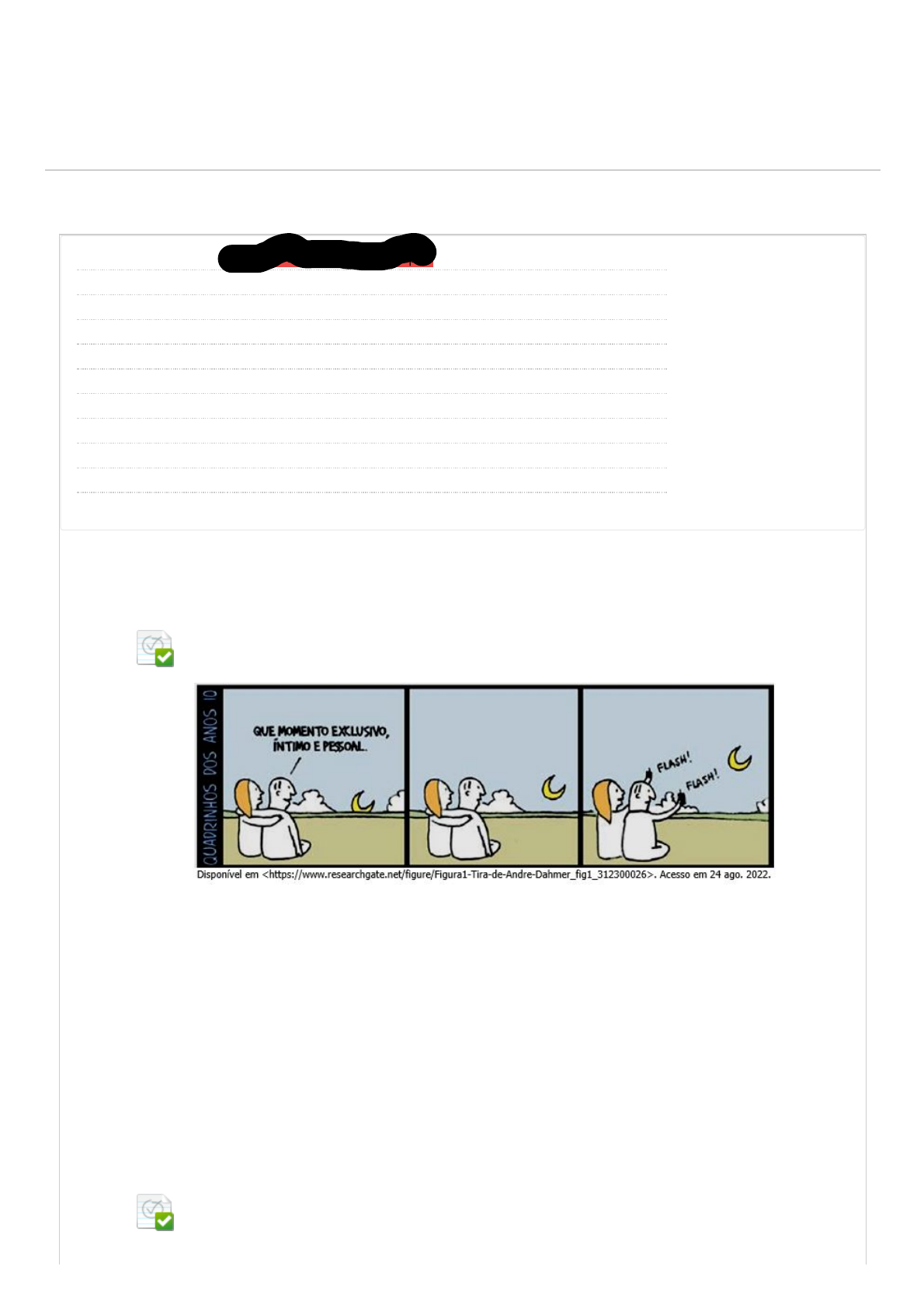 06/11/2022 20:41 Revisar envio do teste: PSA 2022/2 – PSA - CIÊNCIAS ... https://ava.ead.unip.br/webapps/assessment/review/review.jsp?attempt_id=_87975739_1&course_id=_255449_1&content_id=_3095971_1&ret… 1/16 Revisar envio do teste: PSA 2022/2PSA - CIÊNCIAS CONTÁBEIS 6937-CT CONTEÚDO Usuário mayara.souza27 @aluno.unip.br Curso PSA - CIÊNCIAS CONTÁBEIS Teste PSA 2022/2 Iniciado 06/11/22 17:50 Enviado 06/11/22 20:38 Data de vencimento 08/11/22 01:00 Status Completada Resultado da tentativa 6 em 10 pontos Tempo decorrido 2 horas, 48 minutos Autoteste O aluno responde e o resultado do aluno não é visível ao professor. Resultados exibidos Respostas enviadas, Perguntas respondidas incorretamente Pergunta 1 Resposta Selecionada: c. Observe os quadrinhos. O objetivo do texto é criticar a necessidade de registro e de exposição dos momentos íntimos nas redes. Pergunta 2 Leia os quadrinhos. UNIP EAD BIBLIOTECAS MURAL DO ALUNO TUTORIAISCONTEÚDOS ACADÊMICOS 0,5 em 0,5 pontos 0,5 em 0,5 pontos 06/11/2022 20:41 Revisar envio do teste: PSA 2022/2 – PSA - CIÊNCIAS ... https://ava.ead.unip.br/webapps/assessment/review/review.jsp?attempt_id=_87975739_1&course_id=_255449_1&content_id=_3095971_1&ret… 2/16 Resposta Selecionada: d. Com base na leitura, avalie as asserções e a relação entre elas. I. O objetivo dos quadrinhos é mostrar que as opiniões e as experiências pessoais devem prevalecer em relação ao conhecimento técnico-científico. PORQUE II. Um mesmo fato pode ser avaliado de diferentes maneiras. A respeito dessas asserções, assinale a opção correta. A primeira asserção é falsa, e a segunda é verdadeira. Pergunta 3 Leia o texto a seguir, publicado em 29 de julho de 2022, no portal Terra, e a charge. Metaverso chega ao ambiente corporativo: isso vai mudar tudo Especialista explica como o metaverso está sendo utilizado pelas empresas Desde os primeiros rumores do surgimento do metaverso até os primeiros ambientes concretizados, o assunto é destaque em praticamente todos os setores e tem sido considerado uma das principais tendências tecnológicas para os próximos anos, apesar de não ser uma tecnologia nova. Contudo, o custo elevado de criação, assim como o número restrito de profissionais capacitados para o desenvolvimento desses ambientes virtuais, ainda torna a pluralização do metaverso mais lenta. Por ser um ambiente digital imersivo, o metaverso é fundamentado em tecnologias como realidade aumentada, realidade virtual e hologramas. Ou seja, ele é uma espécie de nova camada de realidade, sendo capaz de unir os mundos real e virtual em uma única experiência. Por isso, o metaverso é uma excelente opção para as empresas desenvolverem ambientes de treinamento, interação social, aprimoramento da experiência do home office e reuniões. Outra opção que vem sendo muito explorada é a utilização do metaverso em congressos, summits e encontros em geral, que anteriormente aconteciam apenas em plataformas de videoconferências. “Como especialista reconhecida mundialmente em Smart Cities e varejo, participo de diversos congressos e prêmios internacionais que debatem o tema. Percebo que há uma tendência de que estes eventos ocorram simultaneamente no metaverso, colocando em prática os conceitos do ‘�gital’, a mistura do mundo físico e do digital, e que também sejam um canal de vendas”, explica Regiane Relva Romana, diretora do Smart Lab Facens. (...) 0 em 0,5 pontos 06/11/2022 20:41 Revisar envio do teste: PSA 2022/2 – PSA - CIÊNCIAS ... https://ava.ead.unip.br/webapps/assessment/review/review.jsp?attempt_id=_87975739_1&course_id=_255449_1&content_id=_3095971_1&ret… 3/16 Resposta Selecionada: b. I. A charge e o texto mostram que o metaverso cria a realidade virtual, que equivale à realidade física em todos os aspectos. II. A charge e o texto evidenciam as vantagens do metaverso como uma ferramenta tecnológica para a realização de bons negócios. Regiane destaca ainda que, no Brasil, já existem empresas investindo de forma substancial no metaverso e que o LIGA Facens (Laboratório de Inovações, Games e Apps do Centro Universitário Facens) já desenvolveu alguns projetos de metaverso para fins de treinamentos industriais e educacionais, que podem ser levados para todas as salas de aulas das redes públicas e privadas. Disponível em <https://www.terra.com.br/economia/dinheiro-em-dia/meu-negocio/metaverso-chega-ao-ambiente- corpo rativo-isso-vai-mudar-tudo,e61fcf4c72608c5d7d46ecf2b56bddc2mwo2qioz.html>. Acesso em 04 ago. 2022 (com adaptações). Com base na leitura, avalie as asserções e a relação proposta entre elas. PORQUE A respeito dessas asserções, assinale a opção correta. As asserções I e II são verdadeiras, e a asserção II não justifica a I. Pergunta 4 A IMPORTÂNCIA DA SEGURANÇA ALIMENTAR: QUE FATORES A PÕEM EM PERIGO? Leia o texto a seguir. O combate contra a fome é um desafio global. É o que determina a própria Organização das Nações Unidas (ONU) nos seus Objetivos de Desenvolvimento Sustentável (ODS). O ODS 2 defende o fim de todas as formas da fome e desnutrição até 2030, especialmente aquela que afeta a infância, destacando a importância da agricultura sustentável. Tal como alerta a Organização das Nações Unidas para a Agricultura e a Alimentação (FAO), ocorrem situações paradoxais no mundo. Um exemplo disso é que, 0,5 em 0,5 pontos 06/11/2022 20:41 Revisar envio do teste: PSA 2022/2 – PSA - CIÊNCIAS ... https://ava.ead.unip.br/webapps/assessment/review/review.jsp?attempt_id=_87975739_1&course_id=_255449_1&content_id=_3095971_1&ret… 4/16 Resposta Selecionada: c. O QUE É A SEGURANÇA ALIMENTAR IMPORTÂNCIA DA SEGURANÇA ALIMENTAR nos últimos anos, aumentou a fome de forma paralela com outras formas de má nutrição, como é o caso da obesidade. O conceito de segurança alimentar nasceu na década de 70. Sua evolução, até a definição atual, incluiu diferent