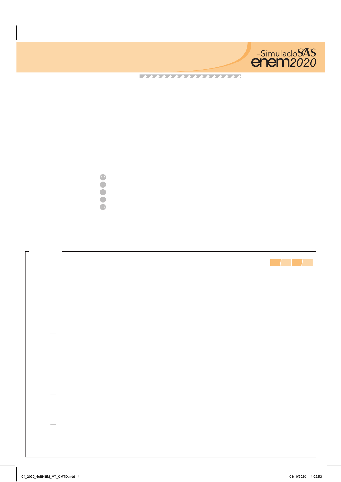 Impresso por skillnovo789, E-mail skillnovo789@gmail.com para uso pessoal e privado. Este material pode ser protegido por direitos autorais e não pode ser reproduzido ou repassado para terceiros. 01/11/2022 00:27:53 MATEMÁTICA E SUAS TECNOLOGIAS Questões de 136 a 180 7o Resolução QUESTÃO 139 Três casais, C , C e C 1 2 3 , resolveram passear de pedalinho em uma lagoa de sua cidade. Chegando na lagoa, tiveram que escolher um entre três trajetos possíveis, e cada um deles escolheu um trajeto diferente. Sabe-se que os três casais saíram juntos do mesmo ponto de partida e que cada um deles finalizou o trajeto escolhido e retornou ao ponto inicial após, respectivamente, 2, 3 e 8 minutos. Considere que os três casais realizaram o trajeto escolhido, repetidamente, até que se reencontrassem pela primeira vez no ponto de partida. Dessa forma, o total de trajetos realizados pelos três casais foi 13. 23. 24. 46. 48. 139. Resposta correta: B C 1 H 3 a) (F) Possivelmente, o aluno considerou, equivocadamente, que o total de trajetos é dado pela soma entre o tempo de realiza- ção do trajeto escolhido por cada um dos casais, obtendo 2 + 3 + 8 = 13. b) (V) Os três casais se reencontraram pela primeira vez, no ponto de partida, após m.m.c.(2, 3, 8) = 24 min da saída. Assim, a quantidade de trajetos realizados por cada casal até que houvesse esse reencontro foi: C1: 24 2 12= C2: 24 3 8= C3: 24 8 3= Portanto, o total de trajetos realizados pelos três casais até se reencontrarem, pela primeira vez, no ponto de partida foi: 12 + 8 + 3 = 23 c) (F) Possivelmente, o aluno considerou, equivocadamente, que m.m.c.(2, 3, 8) = 24 é o total de trajetos realizados pelos três casais até se reencontrarem, pela primeira vez, no ponto de partida. d) (F) Possivelmente, o aluno considerou, incorretamente, que os três casais se reencontraram, pela primeira vez, no ponto de partida após 2 3 ⋅ ⋅ 8 = 48 min da saída. Assim, concluiu que a quantidade de trajetos realizados por cada casal até que houvesse esse reencontro foi: C1: 48 2 24= C2: 48 3 16= C3: 48 8 6= Dessa forma, constatou que o total de trajetos realizados pelos três casais foi 24 + 16 + 6 = 46. e) (F) Possivelmente, o aluno considerou, equivocadamente, que 2 3 ⋅ ⋅ 8 = 48 é o total de trajetos realizados pelos três casais até se reencontrarem, pela primeira vez, no ponto de partida. 04_2020_6oENEM_MT_CMTD.indd 4 01/10/2020 14:02:53