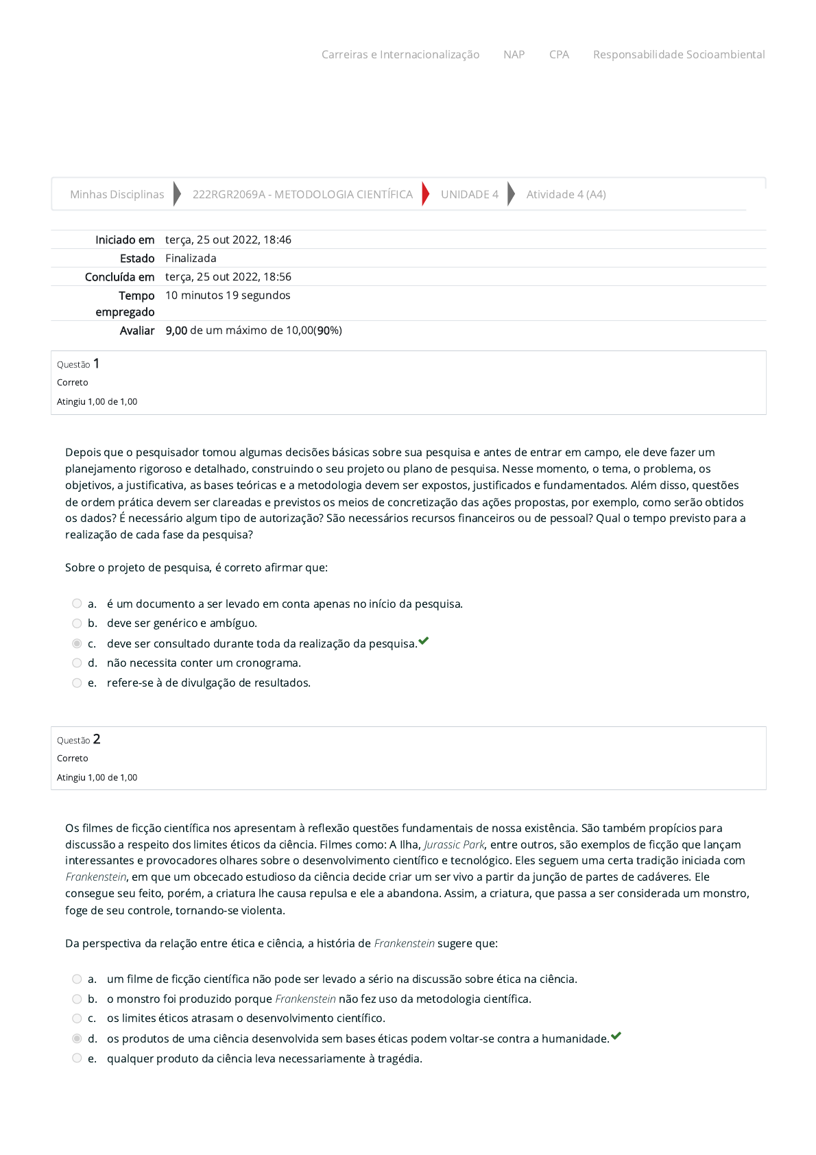 07/11/2022 13:11 Atividade 4 (A4): Revisão da tentativa https://ambienteacademico.com.br/mod/quiz/review.php?attempt=1223823&cmid=484313 1/6 Minhas Disciplinas 222RGR2069A - METODOLOGIA CIENTÍFICA UNIDADE 4 Atividade 4 (A4) Iniciado em terça, 25 out 2022, 18:46 Estado Finalizada Concluída em terça, 25 out 2022, 18:56 Tempo empregado 10 minutos 19 segundos Avaliar 9,00 de um máximo de 10,00(90%) Questão 1 Correto Atingiu 1,00 de 1,00 Questão 2 Correto Atingiu 1,00 de 1,00 Depois que o pesquisador tomou algumas decisões básicas sobre sua pesquisa e antes de entrar em campo, ele deve fazer um planejamento rigoroso e detalhado, construindo o seu projeto ou plano de pesquisa. Nesse momento, o tema, o problema, os objetivos, a justi�cativa, as bases teóricas e a metodologia devem ser expostos, justi�cados e fundamentados. Além disso, questões de ordem prática devem ser clareadas e previstos os meios de concretização das ações propostas, por exemplo, como serão obtidos os dados? É necessário algum tipo de autorização? São necessários recursos �nanceiros ou de pessoal? Qual o tempo previsto para a realização de cada fase da pesquisa? Sobre o projeto de pesquisa, é correto a�rmar que: a. é um documento a ser levado em conta apenas no início da pesquisa. b. deve ser genérico e ambíguo. c. deve ser consultado durante toda da realização da pesquisa. d. não necessita conter um cronograma. e. refere-se à de divulgação de resultados. Os �lmes de �cção cientí�ca nos apresentam à re�exão questões fundamentais de nossa existência. São também propícios para discussão a respeito dos limites éticos da ciência. Filmes como: A Ilha, Jurassic Park, entre outros, são exemplos de �cção que lançam interessantes e provocadores olhares sobre o desenvolvimento cientí�co e tecnológico. Eles seguem uma certa tradição iniciada com Frankenstein, em que um obcecado estudioso da ciência decide criar um ser vivo a partir da junção de partes de cadáveres. Ele consegue seu feito, porém, a criatura lhe causa repulsa e ele a abandona. Assim, a criatura, que passa a ser considerada um monstro, foge de seu controle, tornando-se violenta. Da perspectiva da relação entre ética e ciência, a história de Frankenstein sugere que: a. um �lme de �cção cientí�ca não pode ser levado a sério na discussão sobre ética na ciência. b. o monstro foi produzido porque Frankenstein não fez uso da metodologia cientí�ca. c. os limites éticos atrasam o desenvolvimento cientí�co. d. os produtos de uma ciência desenvolvida sem bases éticas podem voltar-se contra a humanidade. e. qualquer produto da ciência leva necessariamente à tragédia. Carreiras e Internacionalização NAP CPA Responsabilidade Socioambiental https://ambienteacademico.com.br/my/ https://ambienteacademico.com.br/course/view.php?id=17690 https://ambienteacademico.com.br/course/view.php?id=17690§ion=6 https://ambienteacademico.com.br/mod/quiz/view.php?id=484313 https://informa.fmu.br/carreiras/ https://codely-fmu-content.s3.amazonaws.com/Moodle/NAP/inicial/nap/fmu/index.html https://codely-fmu-content.s3.amazonaws.com/Moodle/CPA/landing_CPA/index.html https://portal.fmu.br/sustentabilidade 07/11/2022 13:11 Atividade 4 (A4): Revisão da tentativa https://ambienteacademico.com.br/mod/quiz/review.php?attempt=1223823&cmid=484313 2/6 Questão 3 Correto Atingiu 1,00 de 1,00 Questão 4 Correto Atingiu 1,00 de 1,00 “No uso dos termos ética e moral, a sinonímia original deve prevalecer como pano de fundo para as diversas nuances de significação. Isso, antes de mais nada, porque a ideia de um bem desejado remete sempre a uma certa normatividade, e, por outro lado, toda normatividade sempre faz referência a uma certa ideia de bem. Em termos gerais, se quero algo, devo algo; se devo algo, quero algo. O que não se pode é tratar os termos como antônimos. Tal uso é superficial e contraditório: é contraditório defender, por exemplo, uma ética sem moral, ou uma moral sem ética. Enquanto a sinonímia é, em geral, mais adequada: é perfeitamente legítimo falar, por exemplo, de uma ética universal de Kant ou uma moral das virtudes de Aristóteles. Quando filósofos utilizam distintas nuances de significação, geralmente o fazem para denotar diferentes aspectos da vida moral ou da reflexão moral, isto é, diferentes dimensões de um mesmo fenômeno. É evidente que uma parte considerável da vida em comum exprime- se mais adequadamente através das ideias de obrigação e do dever, enquanto outra se expressa por aspirações.” GONTIJO, E. D. Os termos 'Ética' e 'Moral'. Mental, v.4, n.7, p. 127-135, 2006. A esse respeito, são feitas as seguintes afirmações: I – A distinção entre ética e moral é simples e clara. II – Os termos ética e moral apresentaram, na história da filosofia, diferentes significações. III – Segundo o autor, na discussão histórica da ética e da moral, é mais adequado tratar os termos como sinônimos que como antônimos. De acordo com o texto, é correto o que se afirma em: a. I e III, apenas. b. I, II e III. c. I, apenas. d. II e III, apenas. e. I e II, apenas. Considere a seguinte situação hipotética: no parágrafo de um Trabalho de Conclusão de Curso, o trecho em negrito foi copiado de um blog e apresentado sem indicação de fonte. "O conhecimento seria possível se tivéssemos certeza da tudo? Certamente, porém, nada mais haveria a ser aprendido. O mundo mudaria, mas o conhecimento permaneceria o mesmo. Não existiria possibilidade de existência da ciência. Como já dizia Freud "nunca tenha certeza de nada". Mas, o conhecimento seria possível se não tivéssemos certeza de nada? Sem alguma estabilidade não há como prosseguir." É correto a�rmar que o trecho em destaque: a. não é plágio, pois, os textos que estão na internet não possuem autoria. b. não é plágio, pois, o blog não é detentor dos direitos aut