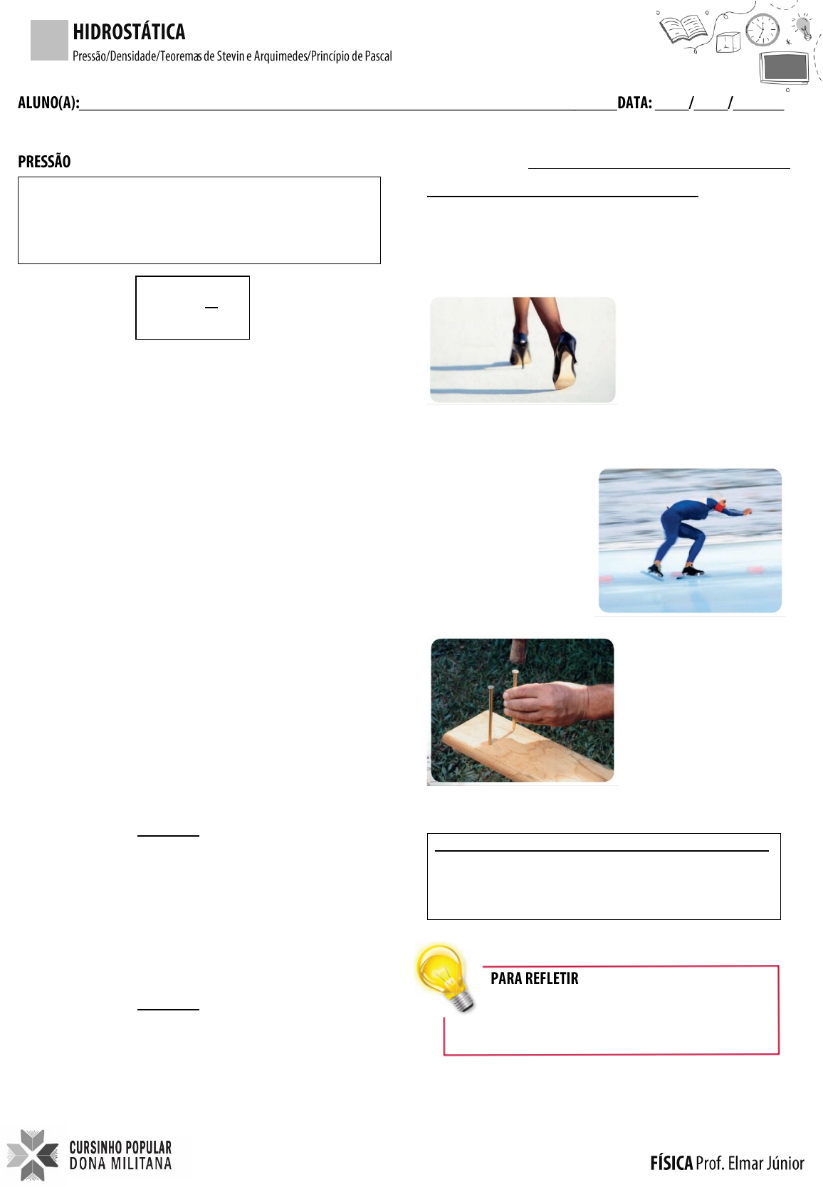 1 -Em que: p – pressão (em N/m² ou Pascal – Pa); F – força (em Newton – N); A – área (em metro quadrado – m²). -A unidade de pressão no Sistema Internacional de Unidades (SI) é o newton por metro quadrado (N/m²), também denominada pascal (Pa). -Existe também a unidade bar/atm. As relações entre essas unidades são: 1 bar = 1 atm = 1,013 x 105 Pa -Por exemplo, se uma força de intensidade 10 N estiver distribuída perpendicularmente à área de 0,4 m2, a pressão sobre ela será: 𝒑 = 𝟏𝟎 𝑵 𝟎, 𝟒 𝒎² = 𝟐𝟓 𝑵/𝒎² -Distribuindo-se a mesma força numa área de apenas 0,2 m2, a pressão exercida será: 𝒑 = 𝟏𝟎 𝑵 𝟎, 𝟐 𝒎² = 𝟓𝟎 𝑵/𝒎² -Observe que a mesma força exerce maior pressão no segundo caso, onde a área é menor. -Os aparelhos que medem pressão são denominados manômetros. -Alguns exemplos cotidianos: Sapatos de salto alto possuem pequena área de contato, logo, exercem uma pressão maior que os de solado normal. A pressão que a patinadora exerce sobre o gelo é grande, pois é pequena a área da lâmina dos patins. A ponta afilada do prego garante elevada pressão, facilitando sua penetração na madeira. -Portanto, Pressão e área são inversamente proporcionais. Logo, quanto menor a área, maior a pressão, e vice e versa. A grandeza dada pela relação entre a intensidade da força que atua perpendicularmente e a área em que ela se distribui é denominada pressão (p). 𝒑 = 𝑭 𝑨 Para um carro atravessar um terreno arenoso e fofo, por que é conveniente esvaziar um pouco os pneus? 2 -Como você sabe, o ar atmosférico é constituído por partículas que se movem caoticamente em todas as direções. -Sendo assim, todos os corpos imersos na atmosfera ficam sujeitos às forças de impacto dessas partículas. A pressão atmosférica (patm) é, portanto, a soma das pressões que as partículas do ar exercem sobre um objeto que se acha imerso na atmosfera -Em outras palavras, é a pressão exercida pela coluna de ar que está acima de cada ponto da superfície terrestre. -A pressão atmosférica depende da altitude do local. -A figura a seguir mostra a variação da pressão atmosférica com a altitude. Observe que, para altitude de 10 km, típica de aviões de grande porte, a pressão atmosférica é, aproximadamente, 0,4 atm, e por isso o interior desses aviões deve ser pressurizado. -Em 1664, o italiano Evangelista Torricelli mediu a pressão atmosférica ao nível do mar por meio de uma experiência extraordinariamente simples. -Torricelli encheu um longo tubo de ensaio com mercúrio. Em seguida, com o dedo, ele fechou a boca do tubo, colocou-o de cabeça para baixo e mergulhou-o em uma bacia também com mercúrio. -Retirando o dedo, ele observou que a coluna de mercúrio desceu um pouco, estabilizando-se a uma altura de 760 mm, conforme mostra a figura abaixo. -Como no espaço vazio criado pela descida do mercúrio no tubo havia vácuo, Torricelli concluiu que a pressão exercida pela coluna de 760 mm de mercúrio foi equilibrada pela pressão atmosférica exercida pelo ar sobre a superfície livre do mercúrio na bacia. -Repetindo a experiência acima do nível do mar, Torricelli verificou que a coluna equilibrada era menor do que 760 mm, revelando que a pressão atmosférica é máxima ao nível do mar, e que ela diminuía com a altitude. 3 -Tendo em vista que a pressão atmosférica ao nível do mar é suficiente para sustentar uma coluna de mercúrio com 76 cm de altura, define-se outra unidade de pressão, denominada atmosfera (atm). -Assim, uma atmosfera é a pressão hidrostática que exerce na base uma coluna de mercúrio com 76 cm de altura, a 0 °C e num local onde g = 9,8 m/s². Assim: 1 atm = 760 mmHg -Quando a pressão atmosférica é igual a 1 atmosfera, ela é denominada pressão normal: pnormal = 1 atm -Ao nível do mar, a pressão atmosférica é igual, em média, à pressão normal. -O manômetro usado para medir a pressão atmosférica é denominado barômetro. O mais simples dos barômetros, aparelho usado para medir a pressão atmosférica, é baseado na montagem da figura anterior. -A densidade (d), também denominada massa específica, é uma propriedade física intensiva da matéria que indica o quanto a massa de uma substância se acha compactada em dado volume. -Por exemplo, à temperatura ambiente, a densidade do chumbo é 11,3 g/cm³, e a do carvalho (um tipo de madeira) cerca de 0,70 g/cm³. Esses valores indicam que um volume de 1 cm³ de chumbo tem massa de 11,3 g, enquanto 1 cm³ de madeira tem massa de apenas 0,70 g. -Considere um corpo homogêneo ou não (sólido, líquido ou gasoso), de massa m e volume V. A densidade d do corpo é dada pela equação: -Em que: d – densidade (em g/cm³ ou kg/m³); m – massa (em grama ou quilograma – g ou kg) V – volume (em centímetro cúbico ou metro cúbico – cm³ ou m³). -Em relação aos sólidos, podemos ter dois tipos de corpos: maciço/homogêneo (totalmente preenchido) (B) ou oco/não- homogêneo (com vazios) (A). -Nesse caso, é preciso calcular a massa específica, definida pela relação: -Em que: u – massa específica (em g/cm³ ou kg/m³); m – massa (em grama ou quilograma – g ou kg) V – volume (em centímetro cúbico ou metro cúbico – cm³ ou m³). OBS.: Para o cálculo da massa específica, deve-se subtrair do volume total o volume de vazios. 𝒅 = 𝒎 𝑽 𝒖 = 𝒎 𝑽 4 -Se o corpo é maciço e homogêneo, a sua densidade coincide com a massa específica do material que o constitui. -Assim, por exemplo, um cubo maciço e homogêneo de alumínio, cuja massa específica é de 2,7 g/cm³, terá densidade igual a 2,7 g/cm³. -Se o cubo de alumínio for oco, sua densidade será menor que 2,7 g/cm³, isto é, menor que a massa específica do alumínio. -Para os líquidos, considerados sempre homogêneos, não é necessário fazer a distinção entre densidade e massa específica. -