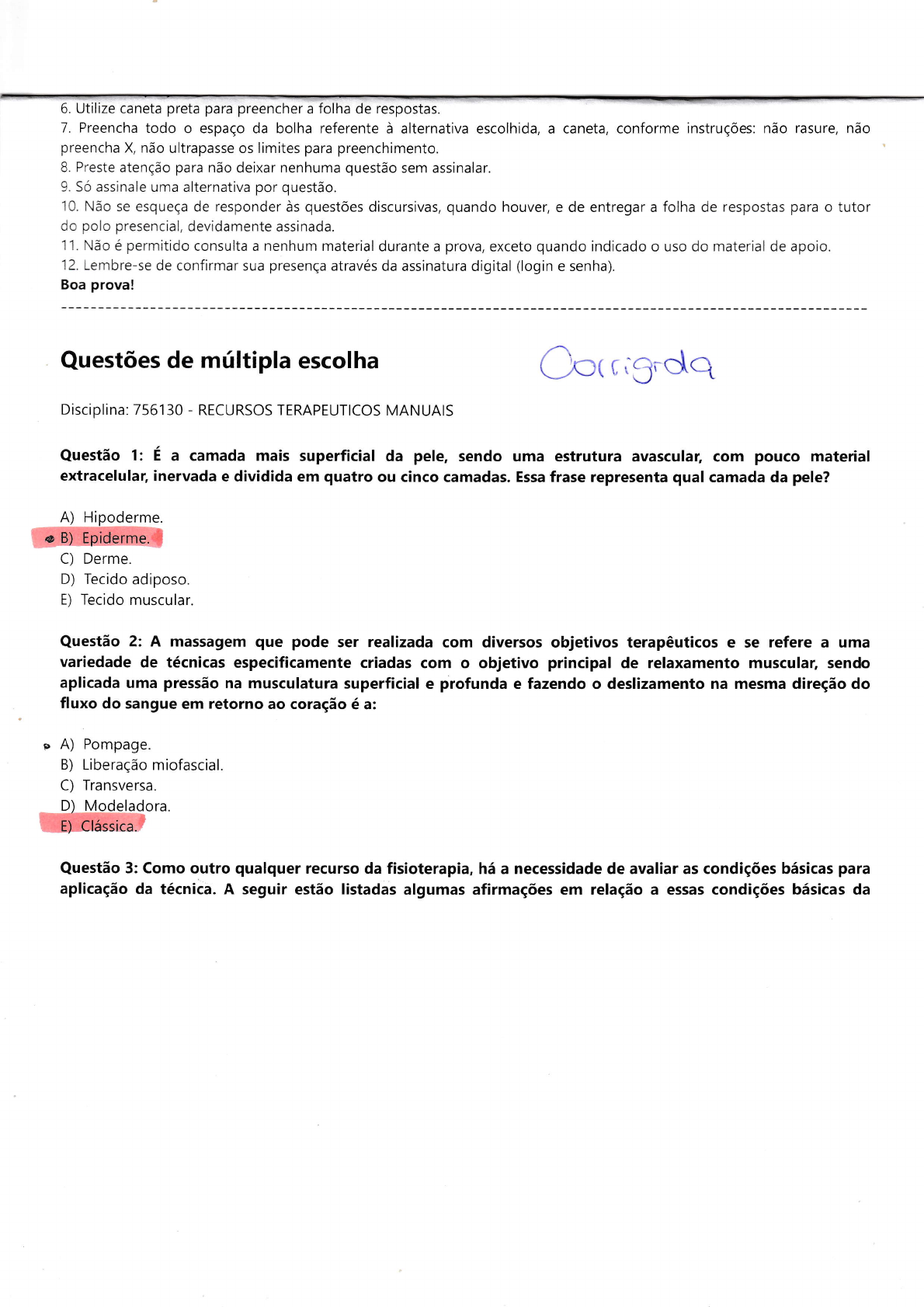 Questão 3: A massagem clássica pode ser realizada em alguns casos específicos como em gestantes. Nesse
