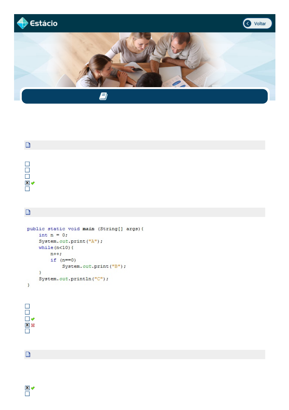 28/10/2018 EPS http://simulado.estacio.br/alunos/ 1/3 ALEX MIRANDA DA SILVA 201509121749 EAD GILBERTO GIL - BA DESENVOLVIMENTO DE SISTEMAS WEB Avaliação Parcial: CCT0764_SM_201509121749 V.1 Aluno(a): ALEX MIRANDA DA SILVA Matrícula: 201509121749 Acertos: 8,0 de 10,0 Data: 28/10/2018 14:40:16 (Finalizada) 1 a Questão (Ref.:201510239736) Acerto: 1,0 / 1,0 NÃO se trata de uma característica do PHP: gratuito e com código aberto. embutido no HTML. baseado no servidor. baseado no cliente. portábil 2 a Questão (Ref.:201509246004) Acerto: 0,0 / 1,0 Considere o código java fornecido na figura a seguir: Qual será a saída após a execução do trecho de código mostrado na figura acima? AB BC AC ABC A 3 a Questão (Ref.:201509349028) Acerto: 1,0 / 1,0 SERVLETS SÃO CLASSES JAVA, desenvolvidas de acordo com uma estrutura bem definida, e que, quando instaladas junto a um Servidor que implemente um Servlet Container (um servidor que permita a execução de Servlets, muitas vezes chamado de Servidor de Aplicações Java), podem tratar requisições recebidas de clientes. Todo Servlet segue um ciclo de vida composto de 3 fases: inicialização, atendimento às requisições e finalização. servidor de aplicação, servidor de arquivos e classes. javascript:voltar(); 28/10/2018 EPS http://simulado.estacio.br/alunos/ 2/3 JSP, Middleware e JDBC instalação, inicialização e finalização. configuração, instalação e finalização 4 a Questão (Ref.:201509376847) Acerto: 1,0 / 1,0 Qual o protocolo usado para fazer requisições ao servidor web? TCP HTTP IP JSP HTML 5 a Questão (Ref.:201509875166) Acerto: 1,0 / 1,0 Servlet é um programa que estende a funcionalidade de um web server, gerando conteúdo dinâmico e integrando com os clientes. Qual o modelo utilizado? request/request response/aplication response/response request/response request/aplication 6 a Questão (Ref.:201509846658) Acerto: 1,0 / 1,0 Uma Servlet é uma classe Java usada para estender a capacidade dos servidores que hospedam aplicações acessadas via qual modelo de programação? Requisição - Servlet Requisição - Java Classes - Servlet Requisição - Resposta Classes - subclasses Gabarito Coment. 7 a Questão (Ref.:201509875173) Acerto: 0,0 / 1,0 Podemos afirmar que uma aplicação JSP, normalmente, é uma coleção de arquivos JSP, arquivos HTML, e outras fontes. Quando o usuário carrega a página pela primeira vez, os arquivos da aplicação são traduzidos para um único arquivo fonte. Qual a extensão desse arquivo? .php .java .html .asp .jsp 8 a Questão (Ref.:201509772288) Acerto: 1,0 / 1,0 Diretivas JSP afetam a estrutura geral do Servlet resultante da compilação de uma página JSP. Entre outras coisas, diretivas podem ser usadas para definir a linguagem usada no documento JSP, arquivos a serem incluídos, bibliotecas de tags a serem usadas, etc. Diretivas são definidas entre as tags <%@ e %> ou usando a notação XML Dada as opções abaixo, identifique a que não corresponde a uma diretiva JSP. http://viz-wcs.voxeldigital.com.br/login.aspx?CodTransmissao=468273 http://viz-wcs.voxeldigital.com.br/login.aspx?CodTransmissao=468273 28/10/2018 EPS http://simulado.estacio.br/alunos/ 3/3 session isErrorJsp contentType import errorPage 9 a Questão (Ref.:201509250523) Acerto: 1,0 / 1,0 (CESGRANRIO - 2010) É característica de um arquivo JSP a: impossibilidade de inclusão de comentários. compilação em um servlet. execução exclusiva em sistemas Windows presença maciça de código Assembly. execução exclusiva em sistemas Linux. 10 a Questão (Ref.:201509747174) Acerto: 1,0 / 1,0 Na arquitetura cliente/servidor de duas camadas, a base de dados fica no servidor; e as regras e a lógica da aplicação ficam no cliente. Em relação à arquitetura cliente/servidor de três camadas, uma camada intermediária é criada entre o servidor e o cliente. Qual a função desta camada? Armazenar as regras do negócio, deixando o cliente responsável apenas pela lógica da aplicação. Armazenar as regras do negócio e a lógica da aplicação, deixando o cliente responsável apenas com a interface com o usuário. Armazenar a base de dados, passando a lógica da aplicação para o servidor. Armazenar a lógica da aplicação, deixando o servidor responsável pelas regras de negócio. Armazenar a base de dados, deixando o servidor responsável por outras tarefas mais pesadas. Gabarito Coment. http://v3.webcasters.com.br/Login.aspx?codTransmissao=422382&LoginExterno=urllogada@estacio.br&SenhaExterno=1234 http://v3.webcasters.com.br/Login.aspx?codTransmissao=422382&LoginExterno=urllogada@estacio.br&SenhaExterno=1234 javascript:abre_colabore('39066','124958510','2581751141');