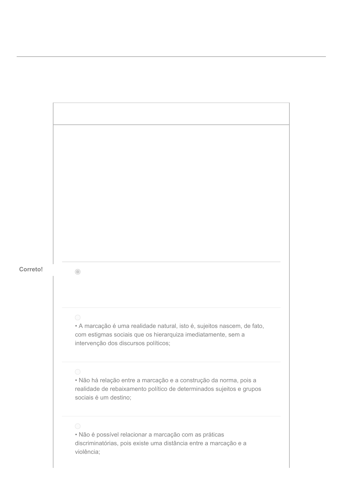 07/11/2022 23:07 Luiza Maciel da Mota, histórico de teste: Tarefa objetiva 9 https://pucminas.instructure.com/courses/109614/quizzes/346660/history?version=1 1/2 Tarefa objetiva 9 Resultados para Luiza Maciel da Mota Pontuação desta tentativa: 3 de 3 Enviado 4 out em 13:45 Esta tentativa levou 3 minutos. 3 / 3 ptsPergunta 1 Segundo Foucault, marcar significa “fazer uma cicatriz, deixar um sinal no corpo, em suma, impor a esse corpo” uma diminuição simbólica ou concreta. Logo, podemos considerar que as marcações, isto é, o conjunto de práticas discriminatórias revelam como esse corpo é coordenado dentro das relações de poder. Não há justificativa natural para a marcação, bem como para a discriminação, enquanto seu produto, pois as práticas de violência são, na verdade, fórmulas de significa o outro, de forma técnica e política, como menos humano, nas relações político-sociais. A partir dessas reflexões, assinale a alternativa correta • A marcação fabrica, por meio de instrumentos políticos, os sujeitos que devem ser vistos fora da humanidade, os outros; Correto!Correto! • A marcação é uma realidade natural, isto é, sujeitos nascem, de fato, com estigmas sociais que os hierarquiza imediatamente, sem a intervenção dos discursos políticos; • Não há relação entre a marcação e a construção da norma, pois a realidade de rebaixamento político de determinados sujeitos e grupos sociais é um destino; • Não é possível relacionar a marcação com as práticas discriminatórias, pois existe uma distância entre a marcação e a violência; 07/11/2022 23:07 Luiza Maciel da Mota, histórico de teste: Tarefa objetiva 9 https://pucminas.instructure.com/courses/109614/quizzes/346660/history?version=1 2/2 Pontuação do teste: 3 de 3