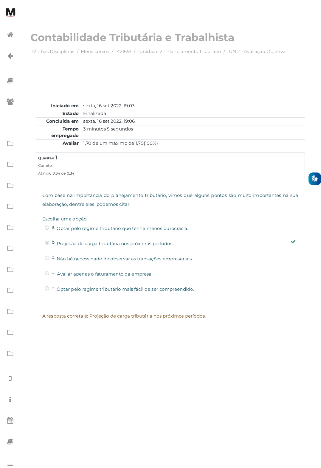 Minhas Disciplinas / Meus cursos / 421691 / Unidade 2 - Planejamento tributário / UN 2 - Avaliação Objetiva Contabilidade Tributária e Trabalhista Iniciado em sexta, 16 set 2022, 19:03 Estado Finalizada Concluída em sexta, 16 set 2022, 19:06 Tempo empregado 3 minutos 5 segundos Avaliar 1,70 de um máximo de 1,70(100%) Questão 1 Correto Atingiu 0,34 de 0,34 Com base na importância do planejamento tributário, vimos que alguns pontos são muito importantes na sua elaboração, dentre eles, podemos citar: Escolha uma opção: a. Optar pelo regime tributário que tenha menos burocracia. b. Projeção de carga tributária nos próximos períodos. c. Não há necessidade de observar as transações empresariais. d. Avaliar apenas o faturamento da empresa. e. Optar pelo regime tributário mais fácil de ser compreendido. A resposta correta é: Projeção de carga tributária nos próximos períodos. https://avap.multivix.edu.br/my/ https://avap.multivix.edu.br/course/view.php?id=19191 https://avap.multivix.edu.br/course/view.php?id=19191§ion=3 https://avap.multivix.edu.br/mod/quiz/view.php?id=1262683 https://avap.multivix.edu.br/my/ https://avap.multivix.edu.br/course/view.php?id=19191 https://avap.multivix.edu.br/user/index.php?id=19191 https://avap.multivix.edu.br/course/view.php?id=19191§ion=1 https://avap.multivix.edu.br/course/view.php?id=19191§ion=2 https://avap.multivix.edu.br/course/view.php?id=19191§ion=3 https://avap.multivix.edu.br/course/view.php?id=19191§ion=4 https://avap.multivix.edu.br/course/view.php?id=19191§ion=5 https://avap.multivix.edu.br/course/view.php?id=19191§ion=6 https://avap.multivix.edu.br/course/view.php?id=19191§ion=7 https://avap.multivix.edu.br/course/view.php?id=19191§ion=8 https://avap.multivix.edu.br/course/view.php?id=19191§ion=9 https://avap.multivix.edu.br/course/view.php?id=19191§ion=10 https://avap.multivix.edu.br/course/view.php?id=19191§ion=11 https://avap.multivix.edu.br/hooks/portal/ https://avap.multivix.edu.br/mod/page/view.php?id=1252%2F%22%20target%3D%22_blank https://avap.multivix.edu.br/calendar/view.php/ https://avap.multivix.edu.br/local/staticpage/view.php?page=biblioteca https://portalweb.multivix.edu.br/gabaritos/login.aspx https://avap.multivix.edu.br/ Questão 2 Correto Atingiu 0,34 de 0,34 Questão 3 Correto Atingiu 0,34 de 0,34 O imposto de renda pessoa jurídica e pessoa física são obrigatoriedades da receita federal do Brasil e, ao mesmo tempo, responsabilidade da União. Sobre o IRPJ, é possível a�rmar: Escolha uma opção: a. Mesmo que houver prejuízos, deve ser realizada a apuração. b. O IRPJ é recolhido anualmente assim como o IRPF, são confrontadas suas receitas e despesas e por meio das suas regras veri�ca-se se deve ser recolhido ou ressarcido. c. Os impostos incidentes nesse tipo de tributação é apenas IRPJ. d. Os impostos incidentes é apenas INSS. e. Não haverá impostos no caso de prejuízos. A resposta correta é: O IRPJ é recolhido anualmente assim como o IRPF, são confrontadas suas receitas e despesas e por meio das suas regras veri�ca-se se deve ser recolhido ou ressarcido. Considera-se contribuintes do PIS, as pessoas jurídicas de direito privado e as que lhe são equiparadas pela legislação do Imposto de Renda. Sobre o PIS, podemos a�rmar: Escolha uma opção: a. PIS e COFINS são a mesma coisa. b. O PIS é tratado no art. 239 da Constituição Federal. c. PIS tem como �nalidade o �nanciamento da seguridade social. d. PIS e Co�ns possuem base de cálculos diferentes. e. O PIS possui a mesma legislação que o COFINS. A resposta correta é: O PIS é tratado no art. 239 da Constituição Federal. https://avap.multivix.edu.br/my/ https://avap.multivix.edu.br/course/view.php?id=19191 https://avap.multivix.edu.br/user/index.php?id=19191 https://avap.multivix.edu.br/course/view.php?id=19191§ion=1 https://avap.multivix.edu.br/course/view.php?id=19191§ion=2 https://avap.multivix.edu.br/course/view.php?id=19191§ion=3 https://avap.multivix.edu.br/course/view.php?id=19191§ion=4 https://avap.multivix.edu.br/course/view.php?id=19191§ion=5 https://avap.multivix.edu.br/course/view.php?id=19191§ion=6 https://avap.multivix.edu.br/course/view.php?id=19191§ion=7 https://avap.multivix.edu.br/course/view.php?id=19191§ion=8 https://avap.multivix.edu.br/course/view.php?id=19191§ion=9 https://avap.multivix.edu.br/course/view.php?id=19191§ion=10 https://avap.multivix.edu.br/course/view.php?id=19191§ion=11 https://avap.multivix.edu.br/hooks/portal/ https://avap.multivix.edu.br/mod/page/view.php?id=1252%2F%22%20target%3D%22_blank https://avap.multivix.edu.br/calendar/view.php/ https://avap.multivix.edu.br/local/staticpage/view.php?page=biblioteca https://portalweb.multivix.edu.br/gabaritos/login.aspx https://avap.multivix.edu.br/ Questão 4 Correto Atingiu 0,34 de 0,34 Questão 5 Correto Atingiu 0,34 de 0,34 O imposto de renda pessoa jurídica e pessoa física, também fazem parte da lista de impostos sob responsabilidade da união. É importante não os confundir, quando falamos desse imposto de responsabilidade de pessoa jurídica. Sobre o IRPJ, podemos a�rmar: Escolha uma opção: a. O IRPJ permite a dedução dos créditos tributários. b. A base de cálculo para esse imposto é o faturamento bruto. c. O IRPJ possui a mesma base de cálculo do IRPF. d. O IRPJ é calculado com base na quantidade de funcionários da empresa. e. A sua base de cálculo são os rendimentos de Pessoa Física. A resposta correta é: A base de cálculo para esse imposto é o faturamento bruto. A contribuição para �nanciamento da seguridade social, conhecida como COFINS, incidente sobre a receita bruta, o art. 195 da Constituição Federal, sobre a COFINS, podemos a�rmar: Escolha uma opção: a. O COFINS é tratado no art. 239 da Constituição Federal. b. O COFINS tem como �nalidade o �nanciamento da seguridade social. c. COFINS só pode utilizar o regime não cumulativo. d. A alíquota do 