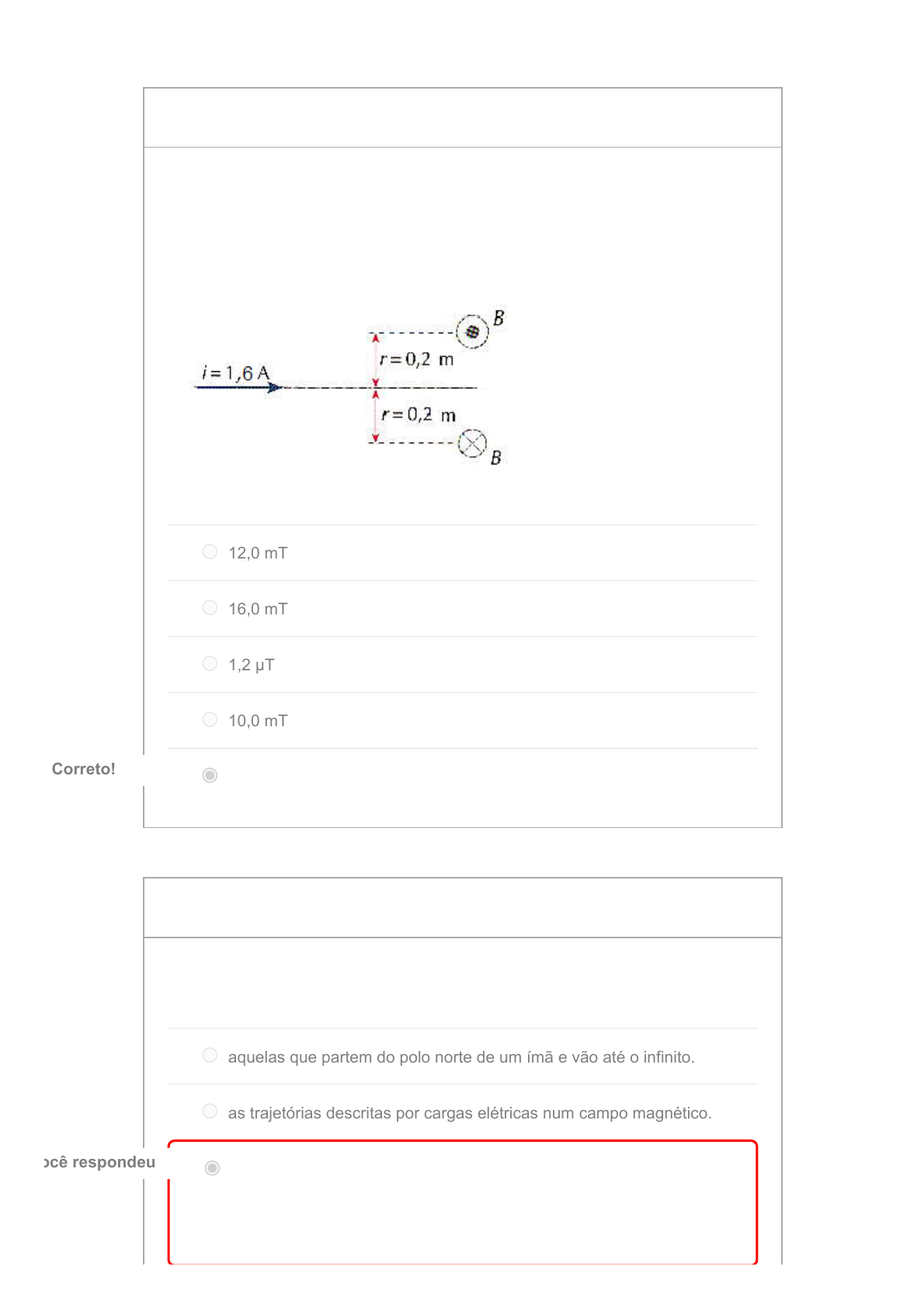 08/11/2022 12:52 Q06 - Questionário 06: 2022D - Física Geral e Experimental II (59330) - Eng. Ambiental e Sanitária https://ucaead.instructure.com/courses/59330/quizzes/101517 2/4 Esta tentativa levou Menos de 1 minuto. 0,1 / 0,1 ptsPergunta 1 Um fio de cobre reto e extenso é percorrido por uma corrente elétrica de intensidade 1,6 A. Qual é a intensidade do vetor indução magnética originado num ponto à distância 0,2 m do fio? 12,0 mT 16,0 mT 1,2 μT 10,0 mT 1,6 μT Correto!Correto! 0 / 0,1 ptsPergunta 2 As linhas de indução de um campo magnético são: aquelas que partem do polo norte de um ímã e vão até o infinito. as trajetórias descritas por cargas elétricas num campo magnético. aquelas nas quais, em todos os pontos, o vetor de indução magnética tem, a mesma intensidade, mas o sentido e a direção contrários. ocê respondeuocê respondeu 08/11/2022 12:52 Q06 - Questionário 06: 2022D - Física Geral e Experimental II (59330) - Eng. Ambiental e Sanitária https://ucaead.instructure.com/courses/59330/quizzes/101517 3/4 o lugar geométrico dos pontos, onde a intensidade do campo magnético é constante aquelas que saem do polo norte e chegam ao polo sul externamente ao ímã. esposta corretaesposta correta 0,1 / 0,1 ptsPergunta 3 Um avião inteiramente metálico, com 20 m de largura, voa horizontalmente com velocidade 540 km/h em uma região onde a componente vertical do vetor indução magnética terrestre vale 4,0 × 10 T. Qual é a força eletromotriz existente entre as extremidades das asas? −5 12000 V. 0,15 V. 0,12 V. Correto!Correto! 43200 V. 0,432 V. 08/11/2022 12:52 Q06 - Questionário 06: 2022D - Física Geral e Experimental II (59330) - Eng. Ambiental e Sanitária https://ucaead.instructure.com/courses/59330/quizzes/101517 4/4 0,1 / 0,1 ptsPergunta 4 De qual variável o fluxo magnético depende? só da área de uma região através da qual passa o campo magnético. só do campo magnético. só da orientação do campo em relação à região através da qual ele passa. do campo magnético, da superfície de área e a variação do ângulo entre o campo magnético e a região pela qual ele passa. Correto!Correto! só do campo magnético e da área de uma região através da qual o campo magnético passa. Pontuação do teste: 0,3 de 0,4