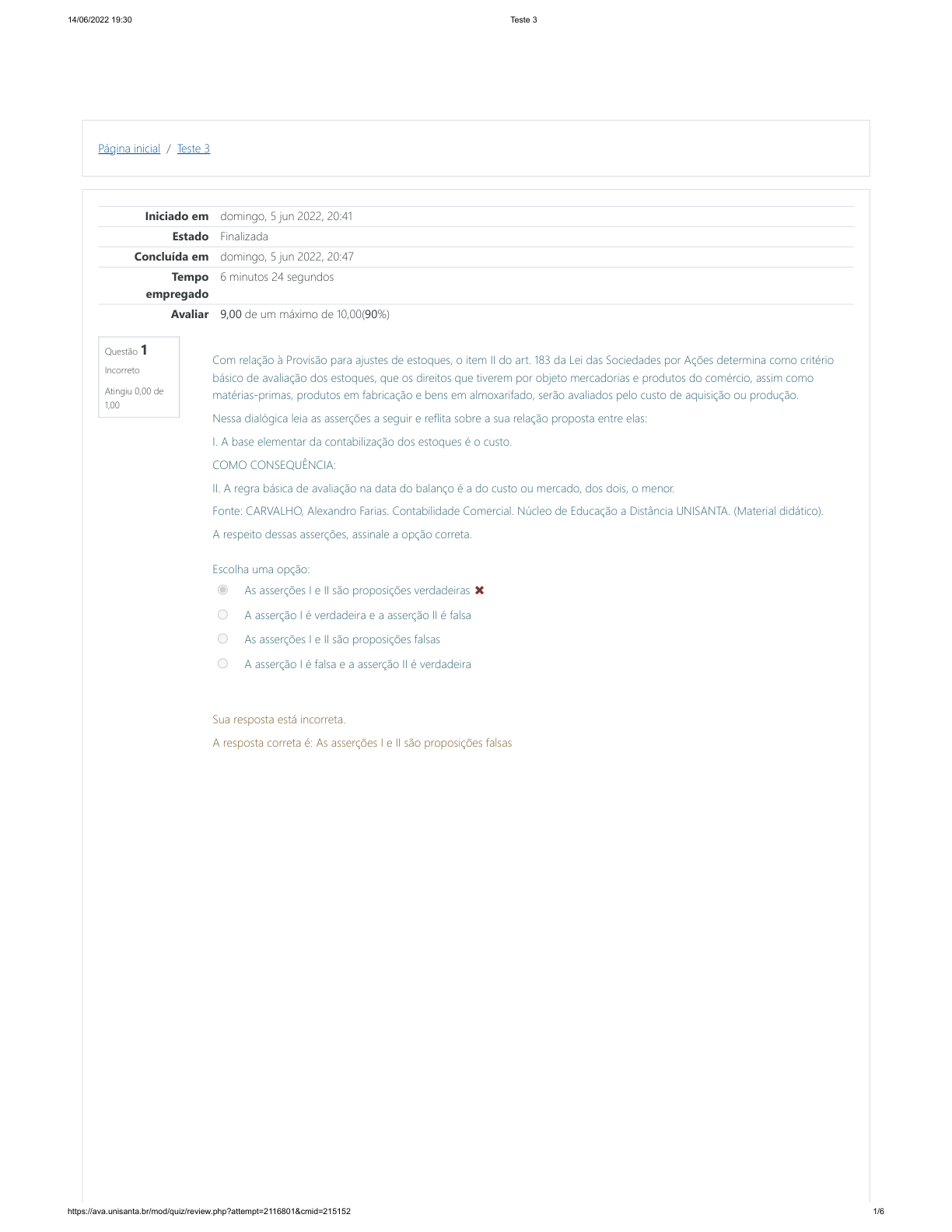 14/06/2022 19:30 Teste 3 https://ava.unisanta.br/mod/quiz/review.php?attempt=2116801&cmid=215152 1/6 Página inicial / Teste 3 Questão 1 Incorreto Atingiu 0,00 de 1,00 Iniciado em domingo, 5 jun 2022, 20:41 Estado Finalizada Concluída em domingo, 5 jun 2022, 20:47 Tempo empregado 6 minutos 24 segundos Avaliar 9,00 de um máximo de 10,00(90%) Com relação à Provisão para ajustes de estoques, o item II do art. 183 da Lei das Sociedades por Ações determina como critério básico de avaliação dos estoques, que os direitos que tiverem por objeto mercadorias e produtos do comércio, assim como matérias-primas, produtos em fabricação e bens em almoxarifado, serão avaliados pelo custo de aquisição ou produção. Nessa dialógica leia as asserções a seguir e reflita sobre a sua relação proposta entre elas: I. A base elementar da contabilização dos estoques é o custo. COMO CONSEQUÊNCIA: II. A regra básica de avaliação na data do balanço é a do custo ou mercado, dos dois, o menor. Fonte: CARVALHO, Alexandro Farias. Contabilidade Comercial. Núcleo de Educação a Distância UNISANTA. (Material didático). A respeito dessas asserções, assinale a opção correta. Escolha uma opção: As asserções I e II são proposições verdadeiras A asserção I é verdadeira e a asserção II é falsa As asserções I e II são proposições falsas A asserção I é falsa e a asserção II é verdadeira Sua resposta está incorreta. A resposta correta é: As asserções I e II são proposições falsas 14/06/2022 19:30 Teste 3 https://ava.unisanta.br/mod/quiz/review.php?attempt=2116801&cmid=215152 2/6 Questão 2 Correto Atingiu 1,00 de 1,00 Questão 3 Correto Atingiu 1,00 de 1,00 Folha de pagamento é o nome dado a uma lista da remuneração paga aos trabalhadores de uma instituição, ou ainda do conjunto de procedimentos trabalhistas efetuado pela empresa para fazer o pagamento ao empregado. Nesse contexto de termos relacionados à Folha de Pagamento, leia as afirmativas a seguir e reflita sobre a sua relação com a verdade. I. Holerite; II. Dividendos; III. Horas Extras; IV. Adicional Noturno. V. Ajuste ao Valor Presente. Escolha uma opção: Somente as afirmativas I, II e V são termos relacionados à Folha de Pagamento. Somente as afirmativas I, III e IV são termos relacionados à Folha de Pagamento Somente as afirmativas II, III e V são termos relacionados à Folha de Pagamento. Somente as afirmativas III, IV e V são termos relacionados à Folha de Pagamento. Sua resposta está correta. A resposta correta é: Somente as afirmativas I, III e IV são termos relacionados à Folha de Pagamento Observe a Figura a seguir e reflita A figura acima apresenta o Capital Social e a sua relação com Valores em Dinheiro, Bens e Direitos que podem compor a primeira situação patrimonial de uma organização. Fonte: CARVALHO, Alexandro Farias. Contabilidade Comercial. Núcleo de Educação a Distância UNISANTA. (Material didático). Nesse contexto, indique a alternativa que explica o que representa o Capital Social. Escolha uma opção: Representa o capital pessoal da pessoa física. Representa os empréstimos bancários Representa o valor do capital de terceiros Representa o valor do capital definido pelos sócios Sua resposta está correta. A resposta correta é: Representa o valor do capital definido pelos sócios 14/06/2022 19:30 Teste 3 https://ava.unisanta.br/mod/quiz/review.php?attempt=2116801&cmid=215152 3/6 Questão 4 Correto Atingiu 1,00 de 1,00 Observe o infográfico a seguir e reflita Fonte: Disponível em: <https://gauchazh.clicrbs.com.br/pioneiro/economia/noticia/2021/>. Acesso em: 20 nov. 2021. Os dados fazem parte de um entendimento que busca apontar um salário que seja ideal para uma família de 4 pessoas, considerando necessidades essenciais a vida. Nesse contexto leia as observações e a sua relação com o Infográfico apresentado: I. Educação, leitura e recreação compreendem 7,4% da fatia de um salário ideal. II. Alimentação e Habitação somam juntas 46% da fatia de um salário ideal. III. Transporte apresenta um percentual menor em relação a educação que é muito maior nessa fatia de um salário ideal. IV. Despesas gerais compreendem a menor fatia de um salário ideal. Fonte: CARVALHO, Alexandro Farias. Contabilidade Comercial. Núcleo de Educação a Distância UNISANTA. (Material didático). Com relação ao infográfico e as assertivas podemos concluir que: Escolha uma opção: Apenas a afirmativa II, está INCORRETA Apenas a afirmativa III, está INCORRETA Apenas a afirmativa IV, está INCORRETA Apenas a afirmativa I, está INCORRETA Sua resposta está correta. A resposta correta é: Apenas a afirmativa III, está INCORRETA 14/06/2022 19:30 Teste 3 https://ava.unisanta.br/mod/quiz/review.php?attempt=2116801&cmid=215152 4/6 Questão 5 Correto Atingiu 1,00 de 1,00 Questão 6 Correto Atingiu 1,00 de 1,00 Quando há incidência de Aplicações Financeiras ocorrerão, também, os acréscimos de rendimentos, que receitas financeiras que, pelo princípio contábil da competência devem ser reconhecidas no período em que foram geradas. Fonte: CARVALHO, Alexandro Farias. Contabilidade Comercial. Núcleo de Educação a Distância UNISANTA. (Material didático). Nesse contexto qual das alternativas abaixo apresenta o correto registro contábil de uma APLICAÇÃO FINANCEIRA. Escolha uma opção: Sua resposta está correta. A resposta correta é: Observe a Figura a seguir e reflita Na Contabilidade, se trata do cálculo da redução de valor dos bens corpóreos que integram o ativo permanente (geralmente o imobilizado), em decorrência de desgaste ou perda de utilidade pelo uso, ação da natureza ou obsolescência. Fonte: CARVALHO, Alexandro Farias. Contabilidade Comercial. Núcleo de Educação a Distância UNISANTA. (Material didático). Com relação ao contexto apresentado assinale a opção que corresponde ao cálculo apresentado: Escolha uma opção