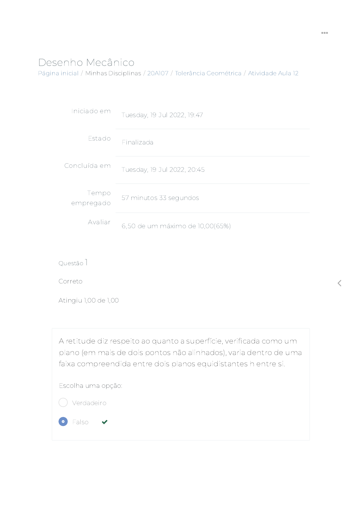 19/07/2022 20:46 Atividade Aula 12 https://ava.politecnicabr.com.br/mod/quiz/review.php?attempt=3365010 1/9 Página inicial / Minhas Disciplinas / 20A107 / Tolerância Geométrica / Atividade Aula 12 Desenho Mecânico Iniciado em Tuesday, 19 Jul 2022, 19:47 Estado Finalizada Concluída em Tuesday, 19 Jul 2022, 20:45 Tempo empregado 57 minutos 33 segundos Avaliar 6,50 de um máximo de 10,00(65%) Questão 1 Correto Atingiu 1,00 de 1,00 A retitude diz respeito ao quanto a superfície, veri�cada como um plano (em mais de dois pontos não alinhados), varia dentro de uma faixa compreendida entre dois planos equidistantes h entre si. Escolha uma opção: Verdadeiro Falso https://ava.politecnicabr.com.br/ https://ava.politecnicabr.com.br/course/view.php?id=942 https://ava.politecnicabr.com.br/course/view.php?id=942#section-14 https://ava.politecnicabr.com.br/mod/quiz/view.php?id=26321 https://ava.politecnicabr.com.br/ 19/07/2022 20:46 Atividade Aula 12 https://ava.politecnicabr.com.br/mod/quiz/review.php?attempt=3365010 2/9 Questão 2 Incorreto Atingiu 0,00 de 1,25 As tolerâncias de orientação e posição recebem uma de�nição de “elementos associados”. Indique a alternativa que justi�ca corretamente essa informação. Escolha uma opção: a. As tolerâncias de orientação e posição precisam ser representadas ao mesmo tempo em mais de um desenho, o que caracterizara e justi�ca o termo “associado”. b. As tolerâncias de orientação e de posição precisam ser representadas ambas ao mesmo tempo, associando posição e orientação. c. As tolerâncias de orientação e de posição precisam ser representadas juntamente com uma instrução descritiva extensa que faça a associação. d. As tolerâncias de orientação e posição precisam ser representadas no elemento tolerado com indicação de outro elemento de referência. e. As tolerâncias de orientação e posição precisam ser representadas ao mesmo tempo em mais de uma vista do desenho. https://ava.politecnicabr.com.br/ 19/07/2022 20:46 Atividade Aula 12 https://ava.politecnicabr.com.br/mod/quiz/review.php?attempt=3365010 3/9 Questão 3 Correto Atingiu 1,00 de 1,00 A cilindricidade diz respeito ao quanto a superfície de um eixo cilíndrico, veri�cada no seu comprimento e não apenas em uma seção, varia dentro de uma faixa compreendida entre dois limitantes cilíndricos concêntricos, cujos diâmetros variam em d. Escolha uma opção: Verdadeiro Falso https://ava.politecnicabr.com.br/ 19/07/2022 20:46 Atividade Aula 12 https://ava.politecnicabr.com.br/mod/quiz/review.php?attempt=3365010 4/9 Questão 4 Incorreto Atingiu 0,00 de 1,25 GD&T é um sistema de controle de tolerâncias geométricas que devem ser indicadas nos desenhos técnicos. Marque a opção onde se justi�ca corretamente a indicação de tolerância geométrica nos desenhos. Escolha uma opção: a. As tolerâncias geométricas são indicadas para substituir o sistema de cotagem dimensional, que não é tão e�ciente. b. A indicação de características geométricas implica na necessidade de instrumentos de precisão milesimal. c. É opção do desenhista aplicar ou não a simbologia de GD&T, pois não há critério normativo para isso. d. A simbologia é empregada para caracterizar o desenho, diferenciando o desenho técnico mecânico dos desenhos de outras áreas. e. As tolerâncias geométricas no desenho devem evidenciar a necessidade de controle de características que não são controladas pelo controle dimensional. https://ava.politecnicabr.com.br/ 19/07/2022 20:46 Atividade Aula 12 https://ava.politecnicabr.com.br/mod/quiz/review.php?attempt=3365010 5/9 Questão 5 Incorreto Atingiu 0,00 de 1,00 Planeza refere-se à linearidade em uma superfície da peça, sendo medido, num determinado comprimento, o quanto a linha super�cial real varia dentro de uma faixa imaginária de ordem h, que representa a tolerância admitida. Escolha uma opção: Questão 6 Correto Atingiu 1,00 de 1,00 Circularidade refere-se ao quanto um eixo cilíndrico varia em seu diâmetro real, sendo medida numa determinada posição do seu comprimento, considerando admissível o valor compreendido entre dois círculos imaginários concêntricos, cujos diâmetros variam em d. Escolha uma opção: Verdadeiro Falso Verdadeiro Falso https://ava.politecnicabr.com.br/ 19/07/2022 20:46 Atividade Aula 12 https://ava.politecnicabr.com.br/mod/quiz/review.php?attempt=3365010 6/9 Questão 7 Correto Atingiu 1,25 de 1,25 Mesmo com as medidas projetadas dentro dos limites, uma peça pode não montar no conjunto ou ter seu uso comprometido por variações de forma. Quanto à simbologia de forma usada em desenho técnico, é correto a�rmar: Escolha uma opção: a. Uma superfície não plana pode admitir variações importantes no seu formato, como cilindricidade, por exemplo, e emprega simbologia apropriada. b. A medida admitida na tolerância de circularidade independe do diâmetro e é representada por um losango. c. Os símbolos de GD&T empregados em desenho mecânico são os mesmos empregados para rugosidade. d. A regularidade no alinhamento de uma aresta é irrelevante, mesmo que se indique no desenho o símbolo de retitude. e. Inexistem normas e simbologias que sugerem planicidade em uma superfície. https://ava.politecnicabr.com.br/ 19/07/2022 20:46 Atividade Aula 12 https://ava.politecnicabr.com.br/mod/quiz/review.php?attempt=3365010 7/9 Questão 8 Correto Atingiu 1,25 de 1,25 Indique a alternativa em que se relaciona corretamente a simbologia com a característica tolerada a que se refere. Escolha uma opção: a. Concentricidade diz respeito ao quanto um cilindro está desalinhado com relação ao seu próprio eixo central. b. Posição é a tolerância permitida para uma faixa, onde setores perpendiculares podem apresentar certa inclinação. c. Paralelismo indica que linhas ou superfícies estejam equidistantes a um ponto comum, mesmo que sejam concorrentes. d. Simetria neces