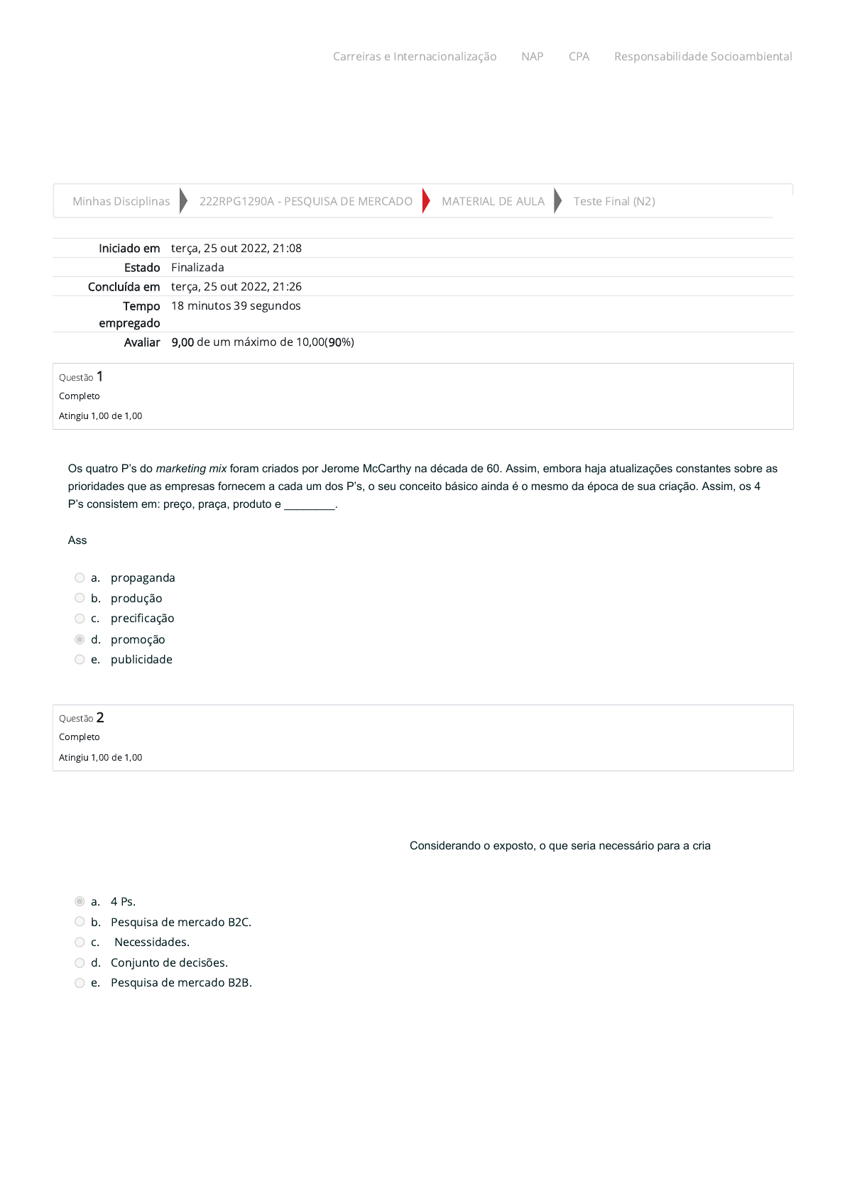 25/10/2022 21:27 Teste Final (N2): Revisão da tentativa https://ambienteacademico.com.br/mod/quiz/review.php?attempt=1227489&cmid=453243 1/5 Minhas Disciplinas 222RPG1290A - PESQUISA DE MERCADO MATERIAL DE AULA Teste Final (N2) Iniciado em terça, 25 out 2022, 21:08 Estado Finalizada Concluída em terça, 25 out 2022, 21:26 Tempo empregado 18 minutos 39 segundos Avaliar 9,00 de um máximo de 10,00(90%) Questão 1 Completo Atingiu 1,00 de 1,00 Questão 2 Completo Atingiu 1,00 de 1,00 Os quatro P’s do marketing mix foram criados por Jerome McCarthy na década de 60. Assim, embora haja atualizações constantes sobre as prioridades que as empresas fornecem a cada um dos P’s, o seu conceito básico ainda é o mesmo da época de sua criação. Assim, os 4 P’s consistem em: preço, praça, produto e ________. Assinale a alternativa que indica o elemento do marketing mix que completa adequadamente a frase. a. propaganda b. produção c. preci�cação d. promoção e. publicidade Suponha que você tenha o lugar perfeito em mente e que tenha ótimas ideias sobre como promover um produto, mas não definiu, realmente, o preço a ser oferecido aos seus clientes. Nesse caso, você poderá distribuir seus produtos e promovê-los, porém ainda não sabe o quanto os consumidores precisarão pagar para comprá-los. Considerando o exposto, o que seria necessário para a criação de uma estratégia bem-sucedida? a. 4 Ps. b. Pesquisa de mercado B2C. c. Necessidades. d. Conjunto de decisões. e. Pesquisa de mercado B2B. Carreiras e Internacionalização NAP CPA Responsabilidade Socioambiental https://ambienteacademico.com.br/my/ https://ambienteacademico.com.br/course/view.php?id=14806 https://ambienteacademico.com.br/course/view.php?id=14806§ion=2 https://ambienteacademico.com.br/mod/quiz/view.php?id=453243 https://informa.fmu.br/carreiras/ https://codely-fmu-content.s3.amazonaws.com/Moodle/NAP/inicial/nap/fmu/index.html https://codely-fmu-content.s3.amazonaws.com/Moodle/CPA/landing_CPA/index.html https://portal.fmu.br/sustentabilidade 25/10/2022 21:27 Teste Final (N2): Revisão da tentativa https://ambienteacademico.com.br/mod/quiz/review.php?attempt=1227489&cmid=453243 2/5 Questão 3 Completo Atingiu 1,00 de 1,00 Questão 4 Completo Atingiu 1,00 de 1,00 Leia o excerto a seguir: “A pesquisa de mercado e a de marketing podem assumir várias formas e podem variar de pesquisas formais e estatisticamente válidas a observações pessoais e informais. Os pesquisadores de opinião política, por exemplo, criam perguntas objetivas e usam métodos científicos para alcançar uma seção representativa dos eleitores quando monitoram como os candidatos estão se saindo antes de uma eleição”. HAGUE, P. et al. Market research: in practice an introduction to gaining greater market insight. United Kingdom: Kogan Page, 2016. A respeito da pesquisa de marketing, analise as afirmativas a seguir e assinale V para a(s) Verdadeira(s) e F para a(s) Falsa(s). I. ( ) A pesquisa de marketing consiste em projetar métodos de pesquisa adequados para os produtos e serviços e atender às vontades e necessidades dos consumidores no mercado-alvo. II. ( ) Às vezes, a pesquisa de marketing prevê sucesso, mas o produto ou serviço pode ser uma falha sombria. III. ( ) Grande parte da pesquisa para melhorar o marketing como processo é conduzida por professores de marketing em faculdades e universidades. IV. ( ) Uma fonte de informações de marketing é o sistema de relatórios internos da empresa que compila informações como resultado de pedidos, estoque etc. Assinale a alternativa que apresenta a sequência correta. a. V, V, V, F. b. F, V, V, V. c. F, F, F, V. d. V, F, V, F. e. V, F, F, F. Mulheres que usam tamanhos menores, bem como as que usam tamanhos maiores, gostam de comprar roupas que estão na moda. A maioria dessas roupas, no entanto, não é proporcional ao tamanho menor ou ao maior e, geralmente, não apresenta um bom caimento. Como resultado, vários fabricantes oferecem tamanhos “pequenos” ou “grandes” de roupas para esses grupos de consumidores. Assim, a que se referem esses grupos de mulheres que buscam tamanhos diferenciados de roupas? a. Fatores demográ�cos. b. Submercado. c. Segmento demográ�co. d. Segmento de estilo de vida. e. Segmento de mercado. Carreiras e Internacionalização NAP CPA Responsabilidade Socioambiental https://informa.fmu.br/carreiras/ https://codely-fmu-content.s3.amazonaws.com/Moodle/NAP/inicial/nap/fmu/index.html https://codely-fmu-content.s3.amazonaws.com/Moodle/CPA/landing_CPA/index.html https://portal.fmu.br/sustentabilidade 25/10/2022 21:27 Teste Final (N2): Revisão da tentativa https://ambienteacademico.com.br/mod/quiz/review.php?attempt=1227489&cmid=453243 3/5 Questão 5 Completo Atingiu 1,00 de 1,00 Questão 6 Completo Atingiu 0,00 de 1,00 Os pesquisadores devem tomar muito cuidado ao projetar um instrumento de coleta de dados que seja percebido apenas como uma série bem ordenada de perguntas resultantes dos objetivos de pesquisa. É por meio de um instrumento de pesquisa que serão levantadas as informações, por exemplo, sobre as preferências do consumidor. Caso essas informações se mostrem inconsistentes, a falha pode ter se dado na elaboração desse instrumento de pesquisa. Nesse sentido, a que o enunciado se refere? a. Desenvolvimento da escala. b. Pesquisa primária. c. Avaliação. d. Teste-piloto. e. Delineamento do questionário. João deseja obter uma compreensão útil do comportamento do consumidor para ajudá-lo a se tornar um gerente mais eficaz. Ou seja, João deseja entender o processo de decisão de compra do consumidor e como comercializar seus produtos de uma maneira que certamente atrairá muitas vendas. Nesse sentido, assinale a alternativa que apresenta a aplicação que João precisa utilizar para alcançar o que ele deseja, isto é, entender o processo de decisão de compra do consumidor. a. Pesquisa primária. b. Pesquisa s