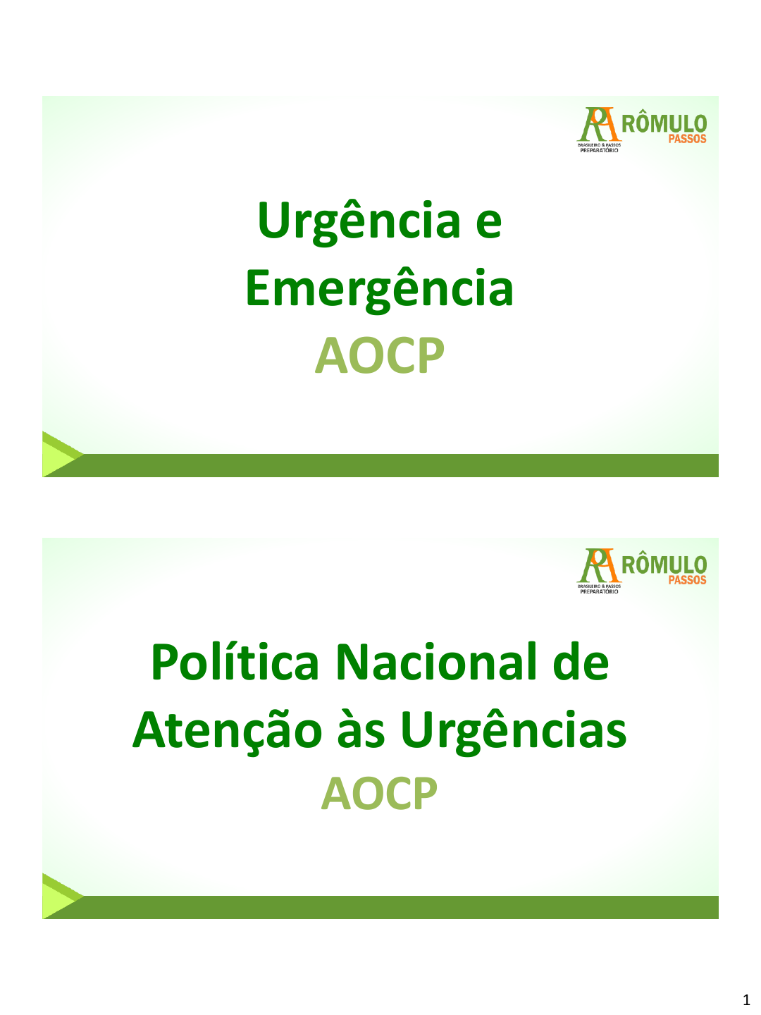 1 Urgência e Emergência AOCP Política Nacional de Atenção às Urgências AOCP Larissa Carias Silva Santos - 060.650.915-10 2 www.romulopassos.com.br Componentes da Rede de Atenção às Urgências CURSO COMPLETO DE ENFERMAGEM PARA CONCURSOS E RESIDÊNCIAS 1. (HUAC – UFCG/EBSERH/2017) Na rede de atenção às urgências, o componente Hospitalar será constituído por, EXCETO a) enfermarias de retaguarda. b) leitos de cuidados intensivos. c) serviços de diagnóstico por imagem e de laboratório. d) portas hospitalares de urgência. e) unidade de pronto atendimento (UPA 24h). CURSO COMPLETO DE ENFERMAGEM PARA CONCURSOS E RESIDÊNCIAS www.romulopassos.com.br Larissa Carias Silva Santos - 060.650.915-10 3 www.romulopassos.com.br 2. (Prefeitura de João Pessoa/PB/AOCP/2018) Constitui(em)-se diretriz(es) da Rede de Atenção às Urgências a) ampliação do acesso e acolhimento aos casos crônicos demandados aos serviços de saúde em todos os pontos de atenção. b) garantia da universalidade, equidade e integralidade no atendimento às urgências clínicas, cirúrgicas, gineco-obstétricas, psiquiátricas, pediátricas, exceto as relacionadas a causas externas. c) regionalização do atendimento às urgências com articulação das diversas redes de atenção e acesso regulado aos serviços de saúde. d) humanização da atenção, garantindo efetivação de um modelo centrado no profissional e baseado nas necessidades de saúde da comunidade. CURSO COMPLETO DE ENFERMAGEM PARA CONCURSOS E RESIDÊNCIAS 3. (Prefeitura de João Pessoa/PB/AOCP/2018) Segundo a Portaria nº 1.600, de 7 de julho de 2011, os componentes a seguir fazem parte da Rede de Atenção às Urgências, EXCETO a) Serviço Hospitalar. b) Atenção Domiciliar. c) Força Nacional de Saúde do SUS. d) Participação e Controle Social dos usuários sobre os serviços. CURSO COMPLETO DE ENFERMAGEM PARA CONCURSOS E RESIDÊNCIAS www.romulopassos.com.br Larissa Carias Silva Santos - 060.650.915-10 4 4. (HUJB – UFCG/EBSERH/IAOCP/2017) Sobre o conteúdo incluso na Portaria nº 1.600/2011, que reformula a Política Nacional de Atenção às Urgências e institui a Rede de Atenção às Urgências no Sistema Único de Saúde, assinale a alternativa correta. a) Prioriza as linhas de cuidados cardiovascular, respiratória e traumatológica. b) As Unidades de Pronto Atendimento devem prestar o primeiro atendimento em casos agudos e agudizados de natureza clínica e primeiro atendimento nos traumas, excluindo-se casos de natureza cirúrgica. www.romulopassos.com.br CURSO COMPLETO DE ENFERMAGEM PARA CONCURSOS E RESIDÊNCIAS 4. (HUJB – UFCG/EBSERH/IAOCP/2017) c) O componente hospitalar é constituído exclusivamente por Pronto- Socorro e UTI. d) Força Nacional do SUS, Unidades de Pronto atendimento e Atenção domiciliar integram a Rede de Atenção às Urgências. e) Acolhimento com classificação de risco constituem uma das bases dos fluxos assistenciais apenas das UPAs, Pronto-Socorro e SAMU. CURSO COMPLETO DE ENFERMAGEM PARA CONCURSOS E RESIDÊNCIAS www.romulopassos.com.br Larissa Carias Silva Santos - 060.650.915-10 5 CURSO COMPLETO DE ENFERMAGEM PARA CONCURSOS E RESIDÊNCIAS www.romulopassos.com.br 5. (HU-UFS/Instituto AOCP/2014) A Rede de Atenção às Urgências é constituída pelos componentes citados a seguir, EXCETO a) Promoção, Prevenção e Vigilância à Saúde. b) Atenção Básica em Saúde. c) Ambulatório de Especialidades. d) Atenção Domiciliar. e) Sala de Estabilização. CURSO COMPLETO DE ENFERMAGEM PARA CONCURSOS E RESIDÊNCIAS www.romulopassos.com.br 6. (EBSERH/HE-UFPel-2015) É correto afirmar que, conforme a Portaria GMNº1.863, de 29 de setembro de 2003, a Política Nacional de Atenção às Urgências deve ser instituída a partir dos seguintes componentes fundamentais: a) adoção de estratégias promocionais de qualidade de vida, excluindo as responsabilidades de toda a sociedade. b) organização da assistência, independente das redes loco-regionais de atenção à saúde. Larissa Carias Silva Santos - 060.650.915-10 6 CURSO COMPLETO DE ENFERMAGEM PARA CONCURSOS E RESIDÊNCIAS www.romulopassos.com.br 6. (EBSERH/HE-UFPel-2015) c) extinção das Centrais de Regulação Médica das Urgências, integradas ao Complexo Regulador da Atenção no SUS. d) capacitação e educação continuada apenas dos profissionais de nível superior que atuem no atendimento às urgências. e) orientação geral segundo os princípios de humanização da atenção. www.romulopassos.com.br Diretrizes da UPA funcionar de modo ininterrupto nas 24 horas do dia e em todos os dias da semana, incluídos feriados e pontos facultativos; possuir equipe multiprofissional interdisciplinar compatível com seu porte. CURSO COMPLETO DE ENFERMAGEM PARA CONCURSOS E RESIDÊNCIAS Larissa Carias Silva Santos - 060.650.915-10 7 CURSO COMPLETO DE ENFERMAGEM PARA CONCURSOS E RESIDÊNCIAS www.romulopassos.com.br 7. (EBSERH/HE-UFSCAR-2015) De acordo com a Política Nacional de Atenção às Urgências é o estabelecimento de saúde de complexidade intermediária entre as Unidades Básicas de Saúde/Saúde da Família e a Rede Hospitalar. O enunciado se refere a) ao Centro Integrado de Atendimento Emergencial. b) ao Serviço Móvel de Urgência. c) à Central de Regulação de Leitos. d) à Unidade de Pronto Atendimento (UPA 24 h). e) aos Serviços Especiais de Acesso Aberto. UNIDADES MÓVEIS PARA O ATENDIMENTO DE URGÊNCIAS UNIDADE DE SUPORTE BÁSICO TERRESTRE UNIDADE DE SUPORTE AVANÇADO DE VIDA TERRESTRE EQUIPE DE AEROMÉDICO • Condutor • Téc. Ou Aux. de Enf. USB • Condutor • Enfermeiro • Médico USA • Enfermeiro • Médico Aeromédico CURSO COMPLETO DE ENFERMAGEM PARA CONCURSOS E RESIDÊNCIAS www.romulopassos.com.br Larissa Carias Silva Santos - 060.650.915-10 8 VEÍCULO DE INTERVENÇÃO RÁPIDA • USB • USA Embarcação • Téc. Enfermagem • Enfermeiro Motolância • Condutor • Enfermeiro • Médico VIR CURSO COMPLET