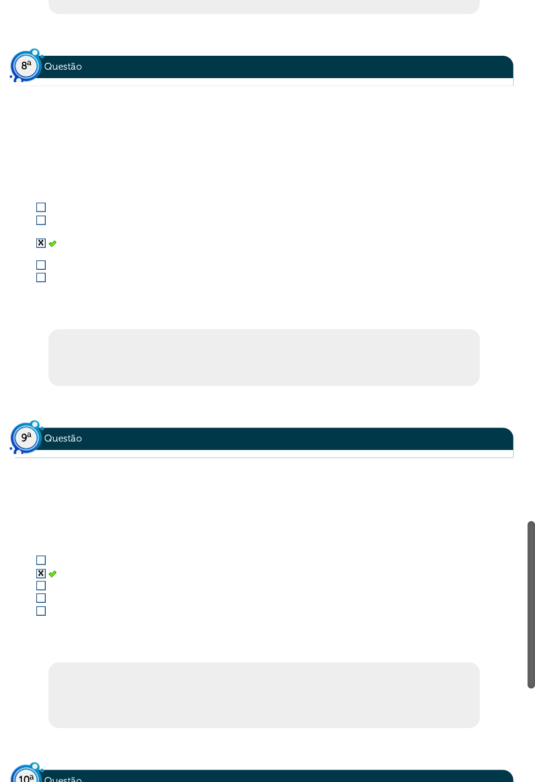 componentes químicos do meio ambiente ou de seus hospedeiros. Acerto: 1,0 / 1,0 Água gelada das praias cariocas afasta banhistas mesmo em dia quente Apesar das temperaturas elevadas nesta quarta-feira (13) no Rio, poucos banhistas se arriscaram no mar: a água do mar apresentou uma temperatura média de 17 graus, segundo o Centro de Hidrografia da Marinha. Fonte: G1. material publicada em 13/09/2017. Disponível em: https://g1.globo.com/rio-de- janeiro/noticia/agua-gelada-das-praias-cariocas-afasta-banhistas-mesmo-em-dia-quente.ghtml. Acesso em: 13 set. 2022. De acordo com a publicação no site do G1 a água do mar estava gelada mesmo a temperatura estando elevada porque as temperaturas da areia e água do mar se mantem constantes o ano todo. a energia emanada do sol foi insuficiente para subir rapidamente a temperatura da areia, mas suficiente para elevar a temperatura da água. a energia emanada do sol foi suficiente para subir rapidamente a temperatura da areia, mas insuficiente para elevar a temperatura da água. a temperatura da areia se eleva, mas a temperatura da água é constante. a temperatura da areia se mantem, mas a temperatura da água diminui. Respondido em 08/11/2022 22:21:01 Explicação: Pense num dia de calor muito forte, na praia. Enquanto a areia está escaldante, a água do mar está fria, refrescante, porque a energia emanada do sol foi suficiente para subir rapidamente a temperatura da areia, mas insuficiente para elevar a temperatura da água. Acerto: 1,0 / 1,0 Leia as asserções a seguir e assinale a alternativa correta. I. A via endocítica é um processo que começa na formação de uma vesícula endocítica, que se funde a um endossomo inicial e que termina nos lisossomos. PORQUE II. O lisossomo é o estágio final da via endocítica, não sendo possível os produtos digeridos seguirem outros caminhos após a digestão lisossomal. As asserções I e II são verdadeiras e a II não é uma justificativa para a I. As asserções I e II são falsas. A asserção I é verdadeira e a II é falsa. A asserção I é falsa e a II é verdadeira. As asserções I e II são verdadeiras e a II é uma justificativa para a I. Respondido em 08/11/2022 22:22:37 Explicação: Muitas vezes, pode parecer que o lisossomo é o estágio final da via endocítica, porém, isso não é uma regra. Porque os produtos da digestão dos lisossomos podem seguir caminhos como, por exemplo, serem transferidos para o citoplasma para participarem das vias de biossíntese e podem se acumular nas células, como acontece com os pigmentos de envelhecimento. Acerto: 1 0 / 1 0 Questão8 a Questão9 a Questão10 a