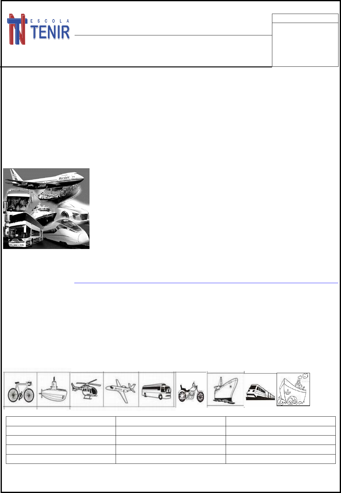 ATIVIDADE AVALIATIVA DE GEOGRAFIA (P2) - 4º BIMESTRE 1) Responda: (1,0) a) Como as pessoas se locomoviam antigamente? _____________________________________________ _____________________________________________ _____________________________________________ _____________________________________________ _____________________________________________ b) Para que serve os meios de transportes? De que tipo podem ser os meios de transportes? Dê exemplos de cada tipo? _________________________________________ _________________________________________ _________________________________________ _________________________________________ 2) Leia e responda às questões que seguem. (2,0) Meios de transporte: como eles revolucionaram a história humana Os meios de transporte foram essenciais para o desenvolvimento das sociedades porque melhoraram o deslocamento de pessoas e cargas. Os Meios de transporte englobam os meios destinados ao transporte de pessoas ou de cargas, podendo ser terrestres, fluviais e aéreos. A palavra transporte é um conceito ligado ao movimento de mercadorias e de pessoas feito de um local ao outro. Os meios de transporte são as formas de se deslocar, utilizando motocicleta, lancha, carro, avião etc. Para que a humanidade evoluísse, foi necessário o desenvolvimento dos meios de transporte. O homem buscava o aperfeiçoamento do transporte e assim suprir suas necessidades, como obter alimentos, construir suas casas, atravessar rios, fazer guerra etc. Na atualidade, as pessoas conseguem se locomover pelo planeta todo com relativa facilidade, porém nem sempre foi assim. Disponível em: https://conhecimentocientifico.r7.com/meios-de-transporte-como-eles-revolucionaram-a-historia-humana/ a) Qual a importância dos meios de transporte para o desenvolvimento das sociedades? _________________________________________ ________________________________________ _________________________________________ _________________________________________ b) O que é transporte? _________________________________________ _________________________________________ _________________________________________ _________________________________________ _________________________________________ 3) Observando as imagens abaixo, escreva o nome das figuras e a que meio de transporte eles pertencem. (1,0) AQUÁTICO TERRESTRE AÉREO Corumbá – MS, _______de ___________________________ de 2020. Nota / Visto Aluno (a): Série: 4 ° Ano do Ensino Fundamental - Turma: __________ Professor (a): Vanessa Disciplina: Geografia https://conhecimentocientifico.r7.com/meios-de-transporte-como-eles-revolucionaram-a-historia-humana/ 4) Complete a cruzadinha com os nomes dos Meios de Transporte: (1,5) 5) Relacione as coluna de acordo com os meios de transportes. (1,0) (1) Trens e metrô. (2) Caminhão. (3) Navios de cargas. (4) Aviões de passageiros. ( ) Muito rápido e eficiente para viagens de longas distancias o deslocamento é feito no ar em aeronaves; ( ) Utiliza vagões e locomotivas de passageiros e cargas; ( ) Feitos em rios, lagos e mares muito eficiente no escoamento de produtos. ( ) Principal meio de transporte utilizado no Brasil que levam produtos pelas rodovias; 6) Descubra os meios de transporte no caça-palavras abaixo e depois escreva o que você achou. (1,5) AQUÁTICO TERRESTRE AÉREO 7) Marque um (X) nas alternativas corretas sobre os Meios de Transportes: (2,0) a) Para ir de um local a outro e para transportar mercadorias, utilizamos o quê? ( ) Os músicos. ( ) As festas. ( ) Os meios de transporte. ( ) Os meios de comunicação. b) O que é metrô? ( ) É um carro de passeios. ( ) Trem de passageiros que circula pela superfície e por vias subterrâneas. ( ) É um avião de carga que viaja de um país para outro. ( ) É uma embarcação que trafega nos oceanos. c) Para que servem os meios de transporte? ( ) Servem para transportar pessoas e mercadorias de um lugar para outro. ( ) Servem para observar. ( ) Servem para caminhar. ( ) Servem para elogiar. d) Como são os transportes terrestres? ( ) São todos que se movimentam. ( ) São aqueles que se movimentam por terra, como os carros, o trem, a moto e etc. ( ) São aqueles que se movimentam. ( ) Eles se movimentam no ar e por água. Boa Sorte!!!!!!!!!!!!!!!!!!