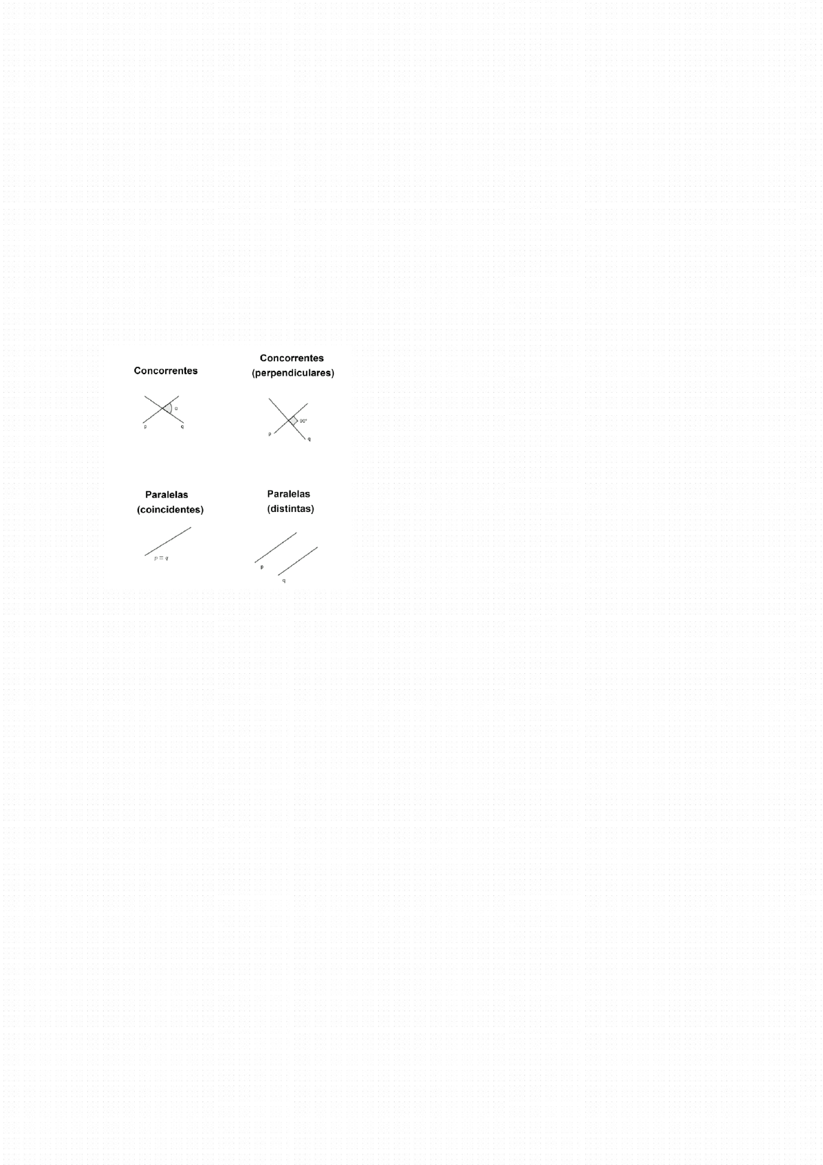 Geometria Analítica Posições relativas Tipos de retas: A relação entre duas linhas, L1 e L2 é dada por: ↪Equação reduzida: º L1: y=m1x+n1 º L2 y=m2x+n2 ↪Equação geral: º L1: y=a1x + b1y + C1 = 0 º L2: y=a2x + b2y + C2 = 0 Casos para cada tipo de reta ↪Retas paralelas e coincidentes º m1 = m2 º α1 = α2 ↪Retas Concorrentes º m1 ≠ m2 º α1 ≠ α2 ↪Retas perpendiculares º α1 = 90° + α2 º m1 = -1 /m2 ou m1+m2=-1 ↪ Portanto uma reta é perpendicular a outra se somente se m1 = -1 /m2 ou m1+m2=-1
