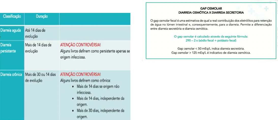 DIARREIA · É a eliminação de fezes malformadas ou líquidas (ou seja, de consistência diminuída) com frequência aumentada. · Obs: a maioria dos autores considera frequência aumentada como 3 ou mais evacuações em 24 horas. · Nos adultos, corresponderia á eliminação de mais de 200 g de fezes por dia. · DISENTERIA = SANGUE E MUCO NAS FEZES DIARREIA SECRETORA – há um aumento dos mediadores secretores. · Mecanismo: distúrbio do transporte hidroeletrolítico na mucosa intestinal. · Clínica: fezes aquosas, volumosas / ausência de dor / persistente com o jejum / osmolaridade fecal preservada / desidratação grave e precoce · Exemplos: algumas bactérias, laxativos e estimulantes (óleo de rícino, bisacodil), consumo crônico de álcool, olmesartana, diarreia dos ácidos biliares, hormônios (alguns tumores neurendócrinos funcionantes, carcinoma medular da tiroide). DIARREIA OSMÓTICA · Mecanismo: presença de solutos osmoticamente ativos e pouco absorvíveis, atraindo fluidos para o lúmen intestinal. · Clínica: diarreia aquosa / cessa com o jejum · Exemplos: algumas bactérias, vírus, laxativos osmóticos (sais de magnésio), deficiência de lactase, intolerância ao glúten não- celíaca. DIARREIA ESTEATORREICA · Mecanismo: lipídeos não absorvidos no lúmen intestinal apresentam efeito osmótico, levando a diarreia. · Clínica: fezes com odor fétido, gordurosas / perda de peso / déficit de nutrientes · Exemplo: insuficiência pancreática exócrina, pancreatite crônica, fibrose cística, somatostatinoma, doença celíaca, espru tropical, doença de Whipple. DIARREIA INFLAMATÓRIA – principal causa da disenteria · Mecanismo: inflamação gera exsudação e pode levar a déficit na absorção de gorduras e/ou eletrólitos, hipersecreção ou hipermotilidade pelo estímulo através das citocinas inflamatórias. · Clínica: diarreia com sangue e muco / febre · Exemplos: doença inflamatória intestinal, enteropatia pós-irradiação, doença enxerto versus hospedeiro, gastroenterite eosinofílica, algumas bactérias. DIARREIA MOTORA · Mecanismo: trânsito intestinal rápido · Clínica: diarreia sem sangue · Exemplos: hipertireoidismo, fármacos procinéticos, diarreia diabética, síndrome do intestino irritável. DIARREIA FACTÍCIA · Mecanismo: distúrbios psiquiátricos que simulam ou provocam diarreia · Clínica: mulheres, história de doença psiquiátrica, hipotensão e hipopotassemia. · Exemplos: síndrome de Munchausen, uso dissimulado de laxativos. DIARREIA IATROGÊNICA Ocorre após procedimentos cirúrgicos como ressecção intestinal parcial, gastrectomia ou colecistectomia. DIARREIAS INFECCIOSAS Temos os mediadores (representados pelas corujinhas) cada uma delas representa um mediador. E eles estão lá ‘’ pode passar água, pode passar eletrólitos ‘’. Quando se tem uma diarreia infecciosa secretora, temos um aumento dos mediadores. Ao invés de fazer ‘’pode passar’’, eles começam ‘’pode passar muito mais rápido’’, então temos uma saída muito grande de água e eletrólitos para luz intestinal, causando uma diarreia aquosa volumosa com uma desidratação precoce. Os agentes causadores: cólera (as vezes é dita como diarreia em água de arroz) e E. Coli enterotoxigênica. Fazem destruição de microvilosidades, locais ondem residem as dissacarídades (locais nos quais digerem os açucares). Assim, há um aumento do açúcar na luz intestinal- tornando o meio hiperosmolar, que puxa água e eletrólitos e o excesso de açúcar vai fermentar. Os agentes: Vírus e E. Coli enteropatogênica Na presença de crise convulsiva, pensar em Shigella spp. DIARREIAS NÃO INFECCIOSAS METFORMINA E DIARREIA PEDIATRIA · Pseudodiarreia · Alergia à proteína do leite de vaca- característica de lactente jovem em aleitamento materno ou quando se inicia a fórmula infantil. Apresenta sangue nas fezes, cronicamente. · Galasctosemia- doença genética, que faz icterícia, há perda de peso, vômitos e dificuldade de ganho ponderal. Principais agentes Antes da vacina era o principal agente. O mecanismo do vírus é osmótico, não apresenta diarreia com muco e sangue. PREVENÇÃO · Aleitamento materno · Precaução de contato · Vacina oral para o rotavírus -> realizada aos 2 e 4 meses de idade. · Higiene ANAMNESE · Idade · Duração da doença diarreica atual · Características das fezes · Frequência e volume das evacuações · Outros sintomas · Uso de medicamentos recentes? · Relação com consumo de leite e derivados? · Local onde reside · Historia de viagem · Idas a restaurantes/festas/banquetes · Outros familiares ou pessoas do convívio com sintomas semelhantes? · Comorbidades Quando investigar uma diarreia aguda? · Diarreia profusa com desidratação · Fezes sanguinolentas · Antibioticoterapia recente · Dor abdominal grave · Novos surtos na comunidade · Idosos a partir dos 70 anos · Imunossuprimidos · Lactentes jovens Como investigar uma diarreia aguda? · Hemograma completo, eletrólitos e função renal. · Pesquisa de elementos anormais nas fezes (EAF) -> avalia cor e aspecto das fezes, PH fecal, presença de substancias redutoras (açúcares), pesquisa de leucócitos, hemácias e de glóbulos de gordura. · Lactoferrina e leucócitos fecais · Coprocultura · Exame parasitológico das fezes -> o ideal é que sejam colhidas três amostras de fezes em dias diferentes. TRATAMENTO Antibioticoterapia A maioria é viral e não precisa de antibiótico O uso indiscriminado de antibiótico pode alterar a flora intestinal, induzir resistência bacteriana e apresentar efeitos colaterais indesejáveis A maioria dos casos é autolimitado, por isso alguns autores contraindicam a antibioticoterapia ADULTOS – VIA ORAL (PREFERENCIA) · Ciprofloxacino: 500 mg 2x/dia por 3-5 dias · Azitromicina: 1g dose única ou 500 mg 1x/dia por 3 dias · Levofloxacino: 500 mg 2-2x/dia por 3-5 dias DIETA · Habitual · Nã