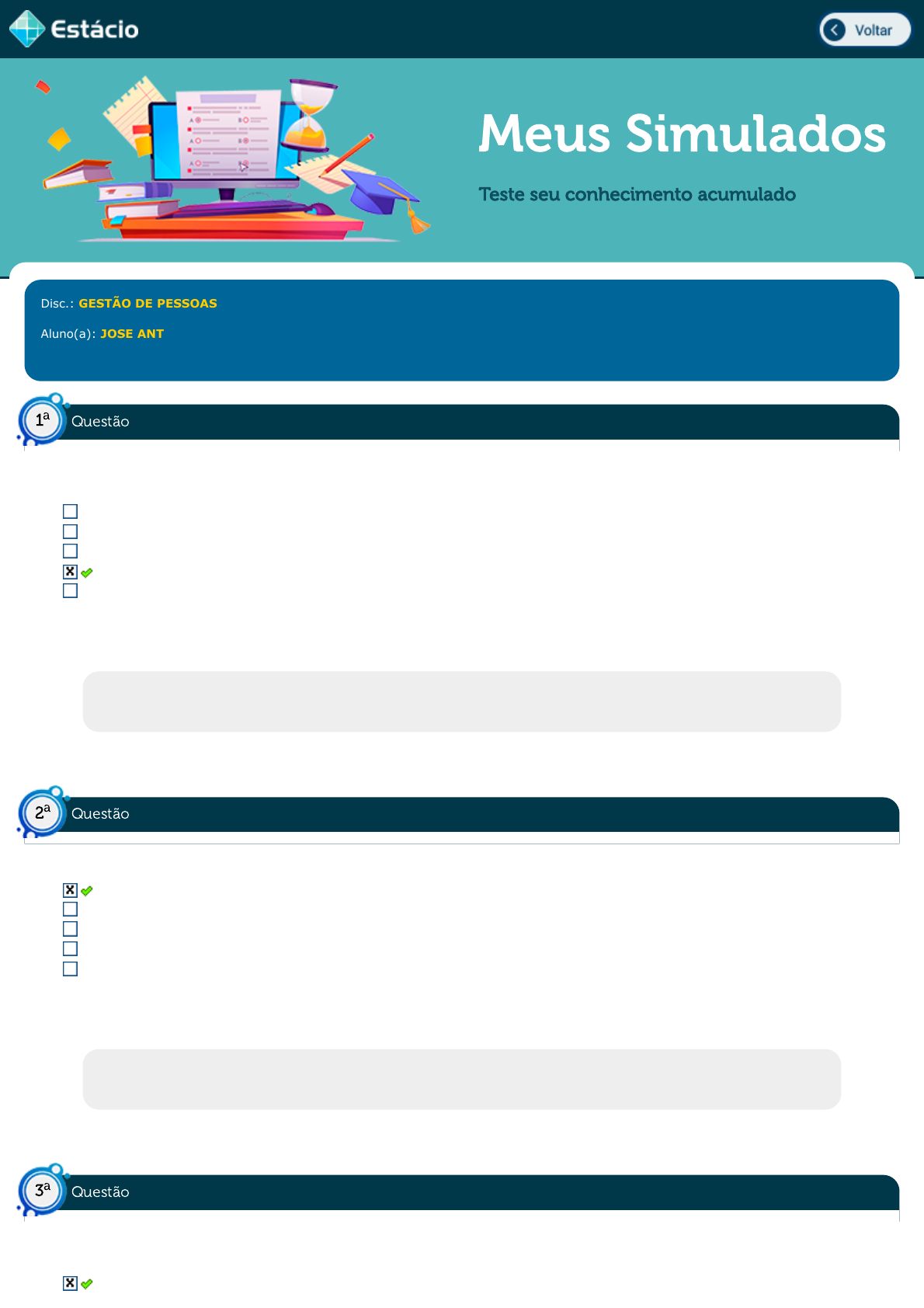 Meus Simulados Teste seu conhecimento acumulado Disc.: GESTÃO DE PESSOAS Aluno(a): JOSE ANTONIO DA SILVA DOS SANTOS 201202222528 Acertos: 8,0 de 10,0 09/11/2022 Acerto: 1,0 / 1,0 O primeiro passo para decidir quem contratar é determinar o CHA, que são as três dimensões da competência, variando de conhecimentos explícitos ou tácitos. Quais das respostas abaixo não se refere ao CHA? Domínio sobre uma disciplina ou técnica específica. Capacidade de usar os conhecimentos teóricos. Proatividade em usar seus conhecimentos e suas habilidades. Capacidade de se comunicar assertivamente. Todas as alternativas estão incorretas. Respondido em 09/11/2022 12:04:57 Explicação: A resposta correta é: Capacidade de se comunicar assertivamente. Acerto: 1,0 / 1,0 Na seleção, o recrutador avalia quais tipos de competências do candidato? Técnica e comportamental. Emocional e profissional. Comportamental e profissional. Todas as alternativas estão incorretas. Organizacional e profissional. Respondido em 09/11/2022 12:05:32 Explicação: A resposta correta é: Técnica e comportamental. Acerto: 1,0 / 1,0 Sobre o Plano de Sucessão, aponte uma vantagem ao escolher um profissional da empresa para assumir a sucessão de uma função de alta administração, como a presidência: Valorização dos profissionais da empresa. Questão1 a Questão2 a Questão3 a https://simulado.estacio.br/alunos/inicio.asp javascript:voltar(); Possibilidade de venda da empresa. Possibilidade de mudança radical na cultura da empresa. Falta de continuidade das atuais políticas da empresa. Poderá gerar atrito entre os sócios da empresa. Respondido em 09/11/2022 12:08:44 Explicação: A resposta correta é: Valorização dos profissionais da empresa. Acerto: 1,0 / 1,0 Um dos grandes problemas para desenvolver treinamentos nas empresas é a Panaceia Gerencial, na qual a área de gestão de pessoas segue "modismos" e escolhe treinamentos caros e que não geram o resultado esperado. Aponte, a seguir, uma política que deve ser utilizada para resolver esse problema: Definir o treinamento conforme surgir uma oportunidade, sem planejamento. Solicitar maiores verbas para treinamentos. Copiar cursos de sucesso de outras empresas. Contratar os palestrantes maios caros do mercado. Planejar as ações de treinamento e quais são as necessidades da empresa. Respondido em 09/11/2022 12:11:08 Explicação: A resposta correta é: Planejar as ações de treinamento e quais são as necessidades da empresa. Acerto: 1,0 / 1,0 Ao longo dos anos a QVT ganha força na área de gestão de pessoas, sendo considerada uma vantagem competitiva. A QVT é vista como vantagem competitiva para as organizações quando Cobre o lado social, diminuindo cobranças excessivas, alta competitividade e pressão. Ataca as questões tanto do lado social quanto do organizacional. Cobre estritamente todas as solicitações da legislação. Promove ações descoladas: massagem, shiatsu, aulas de ioga, alimentação saudável, orientação nutricional. Consegue prêmios e títulos que comprovem suas práticas. Respondido em 09/11/2022 12:14:09 Explicação: A resposta certa é: Ataca as questões tanto do lado social quanto do organizacional. O papel da QVT como vantagem competitiva para as organizações, demandando atenções especiais tanto do lado social quanto do organizacional. Do lado social o tema ganha força, pois, a cada ano, passamos mais tempo no trabalho do que com nossas famílias. Ainda que seja muito debatido, o equilíbrio entre vida pessoal e profissional e o bem-estar no trabalho é difícil de se obter. Já do lado organizacional ainda imperam as cobranças excessivas, a alta competitividade e a pressão. Se a empresa não estiver atenta, a consequência será um estado de mal-estar e clima organizacional ruim, reproduzindo baixa motivação e engajamento. Acerto: 1,0 / 1,0 (Quadrix, 2018 - Adaptada) Diversos autores definiram os papéis dos recursos humanos na construção de uma organização efetiva. O papel de parceiro de negócio/estratégico consiste em: Questão4 a Questão5 a Questão6 a identificar um processo para administrar a mudança. identificar as prioridades da gestão de pessoas e detectar as forças e fraquezas organizacionais usando a matriz que identifica as forças, fraquezas, oportunidades e ameaças. Conceber e desenvolver processos eficientes para contratar, treinar, avaliar e remunerar. valorizar e respeitar a tradição e a história de uma empresa. ter atenção com os problemas, as preocupações e as necessidades dos colaboradores. Respondido em 09/11/2022 12:16:12 Explicação: Diversos autores desenvolveram tipologias de papeis para a gestão de pessoas. Algumas dessas tipologias estavam baseadas em tripés, ou em quatro pilares. Nesse caso, uma teoria pode se servir de outras técnicas como se basear na matriz que identifica as forças, fraquezas, oportunidades e ameaças na procura por identificar as Forças e Fraquezas da gestão de pessoas da empresa interna e externamente. Quando pensamos apenas no papel estratégico, identificar as prioridades da gestão e detectar as forças e fraquezas organizacionais pode ser de grande ajuda na programação e na diferenciação. As demais alternativas tratam de objetivos de outras partes da tipologia, não se referindo ao pilar de estratégico. Acerto: 1,0 / 1,0 (FCC, 2016). Atualmente, o processo de gestão estratégica de pessoas tem como um dos principais objetivos sustentar o caminho das organizações na direção da visão, missão, objetivos estratégicos e valores organizacionais. Verifica-se, portanto, uma significativa mudança (na gestão de pessoas), passando de uma abordagem tradicional e operacional para uma abordagem moderna e estratégica. É exemplo desse movimento: Aversão à instabilidade, com a adoção de normas pré-estabelecidas de promoção e desligamento. Responsabilidade dos gestores em geral, sendo cada gestor responsável pelos recurs