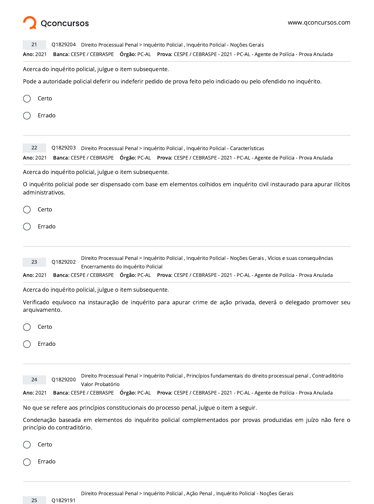 www.qconcursos.com Ano: 2021 Banca: CESPE / CEBRASPE Órgão: PC-AL Acerca do inquérito policial, julgue o item subsequente. Pode a autoridade policial deferir ou indeferir pedido de prova feito pelo indiciado ou pelo ofendido no inquérito. Certo Errado Ano: 2021 Banca: CESPE / CEBRASPE Órgão: PC-AL Acerca do inquérito policial, julgue o item subsequente. O inquérito policial pode ser dispensado com base em elementos colhidos em inquérito civil instaurado para apurar ilícitos administrativos. Certo Errado Ano: 2021 Banca: CESPE / CEBRASPE Órgão: PC-AL Acerca do inquérito policial, julgue o item subsequente. Veri�cado equívoco na instauração de inquérito para apurar crime de ação privada, deverá o delegado promover seu arquivamento. Certo Errado Ano: 2021 Banca: CESPE / CEBRASPE Órgão: PC-AL No que se refere aos princípios constitucionais do processo penal, julgue o item a seguir. Condenação baseada em elementos do inquérito policial complementados por provas produzidas em juízo não fere o princípio do contraditório. Certo Errado 21 Q1829204 >Direito Processual Penal Inquérito Policial , Inquérito Policial - Noções Gerais Prova: CESPE / CEBRASPE - 2021 - PC-AL - Agente de Polícia - Prova Anulada 22 Q1829203 >Direito Processual Penal Inquérito Policial , Inquérito Policial - Características Prova: CESPE / CEBRASPE - 2021 - PC-AL - Agente de Polícia - Prova Anulada 23 Q1829202 >Direito Processual Penal Inquérito Policial , Inquérito Policial - Noções Gerais , Vícios e suas consequências Encerramento do Inquérito Policial Prova: CESPE / CEBRASPE - 2021 - PC-AL - Agente de Polícia - Prova Anulada 24 Q1829200 >Direito Processual Penal Inquérito Policial , Princípios fundamentais do direito processual penal , Contraditório Valor Probatório Prova: CESPE / CEBRASPE - 2021 - PC-AL - Agente de Polícia - Prova Anulada 25 Q1829191 >Direito Processual Penal Inquérito Policial , Ação Penal , Inquérito Policial - Noções Gerais https://www.qconcursos.com/ https://www.qconcursos.com/questoes-de-concursos/bancas/cespe-cebraspe https://www.qconcursos.com/questoes-de-concursos/institutos/pc-al https://www.qconcursos.com/questoes-de-concursos/bancas/cespe-cebraspe https://www.qconcursos.com/questoes-de-concursos/institutos/pc-al https://www.qconcursos.com/questoes-de-concursos/bancas/cespe-cebraspe https://www.qconcursos.com/questoes-de-concursos/institutos/pc-al https://www.qconcursos.com/questoes-de-concursos/bancas/cespe-cebraspe https://www.qconcursos.com/questoes-de-concursos/institutos/pc-al https://www.qconcursos.com/questoes-de-concursos/questoes/37195442-2b https://www.qconcursos.com/questoes-de-concursos/disciplinas/direito-direito-processual-penal https://www.qconcursos.com/questoes-de-concursos/disciplinas/direito-direito-processual-penal/inquerito-policial https://www.qconcursos.com/questoes-de-concursos/disciplinas/direito-direito-processual-penal/inquerito-policial-nocoes-gerais https://www.qconcursos.com/questoes-de-concursos/provas/cespe-cebraspe-2021-pc-al-agente-de-policia-prova-anulada https://www.qconcursos.com/questoes-de-concursos/questoes/37161eb0-2b https://www.qconcursos.com/questoes-de-concursos/disciplinas/direito-direito-processual-penal https://www.qconcursos.com/questoes-de-concursos/disciplinas/direito-direito-processual-penal/inquerito-policial https://www.qconcursos.com/questoes-de-concursos/disciplinas/direito-direito-processual-penal/inquerito-policial-caracteristicas https://www.qconcursos.com/questoes-de-concursos/provas/cespe-cebraspe-2021-pc-al-agente-de-policia-prova-anulada https://www.qconcursos.com/questoes-de-concursos/questoes/3712ff98-2b https://www.qconcursos.com/questoes-de-concursos/disciplinas/direito-direito-processual-penal https://www.qconcursos.com/questoes-de-concursos/disciplinas/direito-direito-processual-penal/inquerito-policial https://www.qconcursos.com/questoes-de-concursos/disciplinas/direito-direito-processual-penal/inquerito-policial-nocoes-gerais https://www.qconcursos.com/questoes-de-concursos/disciplinas/direito-direito-processual-penal/vicios-e-suas-consequencias https://www.qconcursos.com/questoes-de-concursos/disciplinas/direito-direito-processual-penal/encerramento-do-inquerito-policial https://www.qconcursos.com/questoes-de-concursos/provas/cespe-cebraspe-2021-pc-al-agente-de-policia-prova-anulada https://www.qconcursos.com/questoes-de-concursos/questoes/370cc6dd-2b https://www.qconcursos.com/questoes-de-concursos/disciplinas/direito-direito-processual-penal https://www.qconcursos.com/questoes-de-concursos/disciplinas/direito-direito-processual-penal/inquerito-policial https://www.qconcursos.com/questoes-de-concursos/disciplinas/direito-direito-processual-penal/principios-fundamentais-do-direito-processual-penal https://www.qconcursos.com/questoes-de-concursos/disciplinas/direito-direito-processual-penal/contraditorio https://www.qconcursos.com/questoes-de-concursos/disciplinas/direito-direito-processual-penal/valor-probatorio https://www.qconcursos.com/questoes-de-concursos/provas/cespe-cebraspe-2021-pc-al-agente-de-policia-prova-anulada https://www.qconcursos.com/questoes-de-concursos/questoes/36eff9ca-2b https://www.qconcursos.com/questoes-de-concursos/disciplinas/direito-direito-processual-penal https://www.qconcursos.com/questoes-de-concursos/disciplinas/direito-direito-processual-penal/inquerito-policial https://www.qconcursos.com/questoes-de-concursos/disciplinas/direito-direito-processual-penal/acao-penal https://www.qconcursos.com/questoes-de-concursos/disciplinas/direito-direito-processual-penal/inquerito-policial-nocoes-gerais Ano: 2021 Banca: CESPE / CEBRASPE Órgão: PC-AL A autoridade policial instaurou inquérito policial em virtude de crime de lesões corporais leves cometidos contra mulher no âmbito familiar. O inquérito foi relatado e enviado ao Poder Judiciário. Considerando essa situação hipotética julgue o item seguinte. Por se tratar de ação pública 