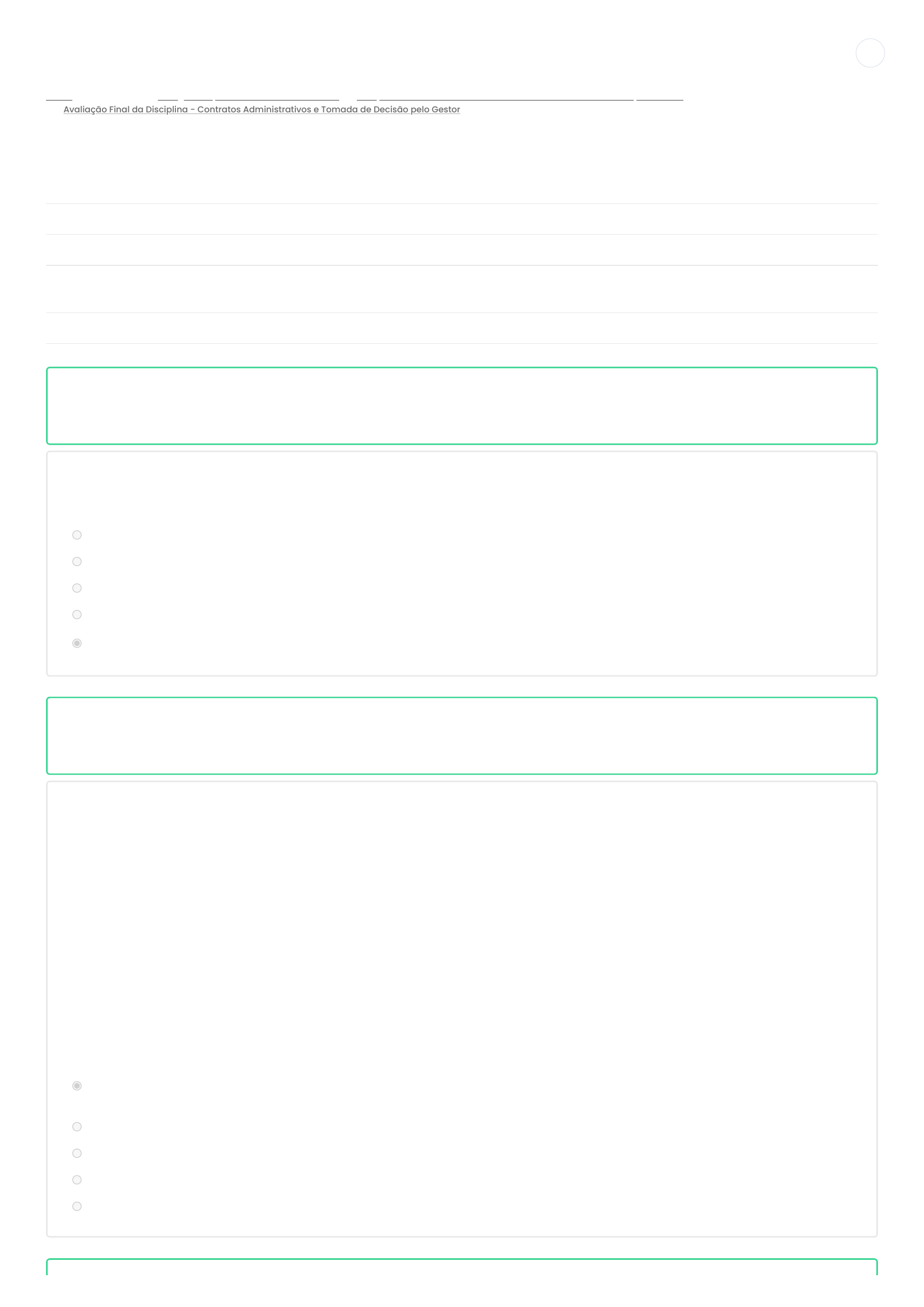 26/09/2022 11:10 Avaliação Final da Disciplina - Contratos Administrativos e Tomada de Decisão pelo Gestor: Revisão da tentativa https://ava.cenes.com.br/mod/quiz/review.php?attempt=77826&cmid=2368 1/4 - Meus cursos - - - Painel Pós-graduação em Direito Administrativo Disciplina 07 - Contratos Administrativos e Tomada de Decisão pelo Gestor Avaliação Final da Disciplina - Contratos Administrativos e Tomada de Decisão pelo Gestor Iniciado em Monday, 26 Sep 2022, 10:58 Estado Finalizada Concluída em Monday, 26 Sep 2022, 11:10 Tempo empregado 11 minutos 53 segundos Avaliar 9,0 de um máximo de 10,0(90%) Questão 1 Correto Atingiu 1,0 de 1,0 O contrato administrativo tem cláusulas exorbitantes oriundas das atribuições constitucionais da Administração Pública. As alternativas a seguir apresentam exemplos disso, EXCETO: a. Garantia à execução do contrato. b. Alteração unilateral. c. Ocupação provisória dos bens do contratado. d. Sanções administrativas. e. Contratos com prazo indeterminado. Questão 2 Correto Atingiu 1,0 de 1,0 Como o plano de continuidade de negócios deve envolver toda a organização, torna as estratégias mais ilustrativas por meio de esquemas como o fluxograma e aumenta a capacidade de assimilação pelos indivíduos da organização e mesmo pelos parceiros e terceiros, que em muitas das estratégias serão responsáveis por certas ações. Avalie as afirmativas sobre o plano de continuidade de negócios. I- A continuidade dos negócios pensa de forma preventiva num conjunto de estratégias e planos capazes de permitir e garantir a continuidade das atividades essenciais da organização. II- Estratégias que envolvem a tecnologia propriamente dita geralmente são bem complexas e precisam ser desenvolvidas de modo bem detalhada. III- Para garantir um bom resultado de continuidade de negócios, precisamos visualizar todas as formas de tecnologia que se manifestam dentro da organização, nos seus diversos modos e resultados. É correto no que se afirma em: a. I, II e III As afirmativas estão corretas devido a continuidade dos negócios que necessitam de estratégias e forma de tecnologia para manterem-se no mercado onde atuam. b. II e III c. I e II d. I e III e. II Q tã 3 https://ava.cenes.com.br/my/ https://ava.cenes.com.br/course/view.php?id=8 https://ava.cenes.com.br/course/view.php?id=8§ion=9 https://ava.cenes.com.br/mod/quiz/view.php?id=2368 26/09/2022 11:10 Avaliação Final da Disciplina - Contratos Administrativos e Tomada de Decisão pelo Gestor: Revisão da tentativa https://ava.cenes.com.br/mod/quiz/review.php?attempt=77826&cmid=2368 2/4 Questão 3 Correto Atingiu 1,0 de 1,0 Para além da pessoa natural, o ordenamento jurídico reconhece as chamadas pessoas jurídicas. Com relação à pessoa jurídica, é correto afirmar que: a. Deve ter finalidade econômica. b. É a materialização da figura dos sócios. c. Confunde-se com a atividade empresarial. d. É aquela que exerce atividade empresarial. e. Não se confunde com a figura dos sócios. Conforme o Código Civil, “art. 49-A. A pessoa jurídica não se confunde com os seus sócios, associados, instituidores ou administradores” (BRASIL, [2018]). Questão 4 Correto Atingiu 1,0 de 1,0 O contrato administrativo deve seguir a forma estabelecida em lei. Dentre as características que pertencem a esse modelo contratual, é correto afirmar: a. Deve ser escrito. O contrato administrativo deve seguir normas rígidas. Assim, é necessário que seja sempre na modalidade escrita. b. Pode ser celebrado a partir do modelo de acordo entre cavalheiros. c. O princípio da intuitu personae é facultativo. d. Em regra, não possui requisitos para a substituição contratual. e. Admite a forma oral. Questão 5 Correto Atingiu 1,0 de 1,0 Para acompanhar as mudanças e adequarem-se a ela as empresas poderão formar fluxogramas para cada uma das estratégias de modo a aprimorar sua compreensão e execução. Avalie as afirmativas em relação aos fluxogramas. I - A formação do fluxograma pode ser mais complexa e elaborada; porém, é de fácil compreensão, mesmo por indivíduos que não tenham relação direta com a elaboração e acompanhamento das estratégias. II- As estratégias possíveis e mais adequadas deverão considerar o tempo, custos e recursos envolvidos através de regras. III- O processo de manutenção precisa ser constante com revisões anuais ou semestrais, acompanhando as mudanças e inovações do negócio. É correto no que se afirma em: a. I e II b. III c. I, II e III d. I e III A afirmativa II está incorreta, já que as estratégias possíveis e mais adequadas deverão considerar o tempo, custos e recursos envolvidos através da elaboração de um fluxograma. e. II e III Questão 6 26/09/2022 11:10 Avaliação Final da Disciplina - Contratos Administrativos e Tomada de Decisão pelo Gestor: Revisão da tentativa https://ava.cenes.com.br/mod/quiz/review.php?attempt=77826&cmid=2368 3/4 Correto Atingiu 1,0 de 1,0 A cláusula de equilíbrio econômico-financeiro é fundamental para restabelecer uma situação de desequilíbrio entre as partes contratuais. Assim, a doutrina aponta três instrumentos que possibilitam o reequilíbrio. Entre eles, destaca-se: a. renomeação. b. repactuação. Ela recompõe as variantes de custos efetivamente verificadas no contrato de prestação de serviços contínuos, substituindo o reajuste geral do contrato, mediante a simples aplicação de um índice. c. adimplemento. d. aditamento. e. regime diferenciado de contratação. Questão 7 Correto Atingiu 1,0 de 1,0 Para definir os melhores caminhos e as estratégias para negociação, devem-se avaliar inicialmente as intenções percebidas entre as partes. Assim, existem duas estratégias básicas de negociação: a distributiva e a integrativa. Avalie as afirmativas sobre essas estratégias e assinale a alternativa correta: a. A meta da estratégia distributiva é satisfazer ao máximo a nece