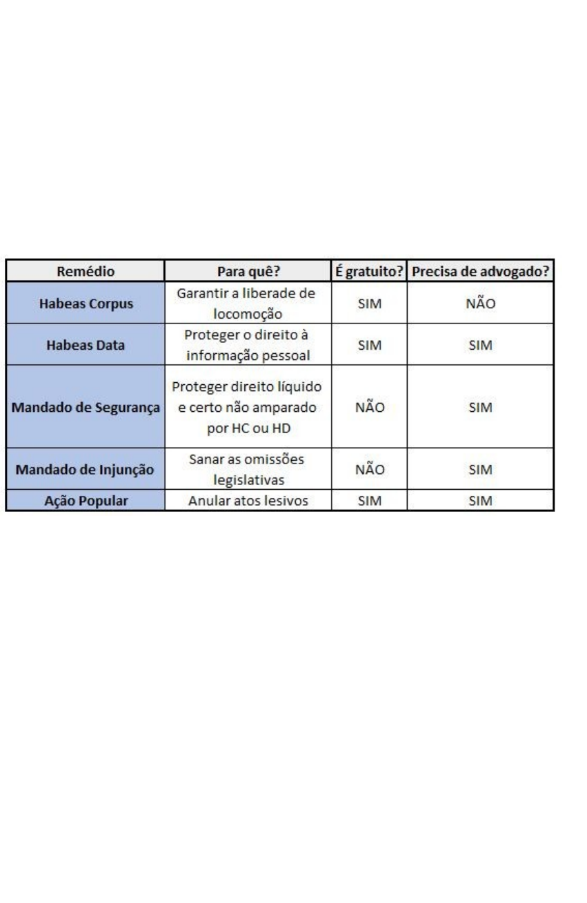 Visão Geral sobre os Remédios Constitucionais A Constituição Federal Brasileira dispõe sobre algumas garantias que são colocadas à disposição do cidadão, e entre eles estão os remédios constitucionais, que são ações que podem ser utilizadas pelos indivíduos com o intuito de proteger os seus direitos. Eles estão presentes no famoso artigo 5º da CF (saiba que você tem que ter todo esse artigo na ponta da língua), nos incisos LXVIII ao LXXIII, bem como em algumas leis específicas. Abaixo está um pequeno resumo sobre cada um dos remédios constitucionais: Resumo dos Remédios Constitucionais · Habeas Corpus é o único gratuito e que não precisa de advogado. · Habeas Data e Ação Popular são gratuitos, mas precisam de advogados para serem impetrados. · Falou em Mandado (Segurança ou Injunção), não são gratuitos e precisam de advogado. Habeas Corpus O primeiro dos remédios constitucionais deste resumo é também um dos principais deles, que é o Habeas Corpus. O Habeas Corpus é um remédio constitucional bastante antigo no nosso ordenamento jurídico. Ele garante que o cidadão tenha o direito de ir e vir, protegendo a sua liberdade de se locomover, quando ela esteja ameaçada ou restringida por abusos de poder ou por ilegalidades. Ele é utilizado a todo momento no âmbito criminal, geralmente por advogados, de modo a libertar o seu cliente da prisão realizada antes do réu ser julgado. Um exemplo foi quando o ex-presidente Michel Temer foi preso em 2019 pela justiça, após denúncia do Ministério Público pelos crimes de corrupção, peculato, lavagem de dinheiro e organização criminosa. Com isso, seu advogado impetrou um habeas corpus no STJ (Superior Tribunal de Justiça) para garantir o seu direito de locomoção, restringido pela prisão. O STJ julgou a ação e deu parecer favorável, permitindo que o ex-presidente pudesse aguardar em liberdade até o julgamento do caso. Qualquer pessoa pode ser um impetrante, ou seja, qualquer pessoa pode entrar com um Habeas Corpus, incluindo menores de idade, estrangeiros e pessoas jurídicas. O impetrante pode entrar com um HC para ele mesmo ou para terceiro. No caso do nosso exemplo, o impetrante foi o advogado do Michel Temer. O impetrado é a autoridade contra quem é impetrado o HC. Pode ser a autoridade policial, juízes, ou mesmo um particular, como clínicas de recuperação. No nosso caso em questão, o HC foi impetrado perante o STJ, sendo esse o impetrado. Por fim, o paciente é a pessoa que será beneficiada pelo Habeas Corpus, é aquela que está tendo o seu direito de locomoção violado, como o Michel Temer no exemplo citado. Atenção: Como se trata do direito de ir e vir, pessoa jurídica não pode ser um paciente, visto que ela não se locomove, apenas pessoas naturais. Ele pode ser utilizado de maneira preventiva (antes da violação do seu direito de locomoção) ou repressiva (após o indivíduo ter seu direito violado). Habeas Data Há dois momentos em que o Habeas Data pode ser utilizado. O primeiro é para assegurar o direito do indivíduo em obter informações sobre ele mesmo e que estão presentes em bancos de dados guardados por autoridades públicas. Ou seja, em regra, caso uma entidade governamental possua informações de determinada pessoa, é direito dessa pessoa obter tal informação. A segunda hipótese é no caso de um indivíduo optar por retificar (modificar) seus dados que estão armazenados pelo poder público. Atenção: Um ponto importante é que esse remédio é personalíssimo, ou seja, ele apenas é utilizado para obter ou retificar informações do próprio impetrante, não podendo ser utilizado para ter acesso a informações de terceiros. Além disso, ele apenas pode ser utilizado para adquirir informações quando a autoridade já tiver recusado o seu acesso por meios administrativos. O Habeas Data não possui tanta funcionalidade atualmente devido à Lei de Acesso à Informação, que obriga a transparência das informações pelo Poder Público. Fique atento: Um ponto importante, e que sempre está presente em provas, é que o Habeas Data não é o meio adequado quando há a recusa de emissão de certidões, ainda que haja nelas informações de caráter pessoal. Nesta situação, é utilizado o mandado de segurança. Mandado de Segurança O mandado de segurança, de acordo com o inciso LXIX do artigo 5º da Constituição, protege um direito líquido e certo do cidadão que sofrer abuso de poder ou ilegalidades por parte de autoridade pública. Um exemplo é quando um candidato deficiente é eliminado de uma perícia de concurso sob a alegação da comissão de que a pessoa não possui a deficiência alegada. Assim, o indivíduo pode impetrar um Mandado de Segurança contra o ente público ou contra a banca do concurso (que pode exercer atribuições do Poder Público), de modo a garantir a atestação da sua deficiência. Atenção: O mandado de segurança é um remédio residual (subsidiário), pois apenas pode ser utilizado quando não couber o Habeas Corpus ou o Habeas Data na situação. De acordo com a legislação, quando for um Mandado de Segurança repressivo, ele apenas poderá ser impetrado após a violação do direito e dentro do prazo decadencial de 120 dias. Um ponto importante é que não há a produção de provas após a impetração do Mandado de Segurança, sendo que todas as provas necessárias para a comprovação do direito da pessoa têm que ser fornecidas no ato da petição. Além do MS Individual, há o Mandado de Segurança Coletivo, em que entidades podem impetrar um mandado de segurança em prol de um conjunto de pessoas. Os que estão permitidos entrar com esse MS coletivo são os partidos políticos, desde que com representação no Congresso, além da organização sindical, entidade de classe ou associação que funcionem há pelo menos 1 ano, em defesa dos seus membros, não sendo necessário autorização dos associados/si
