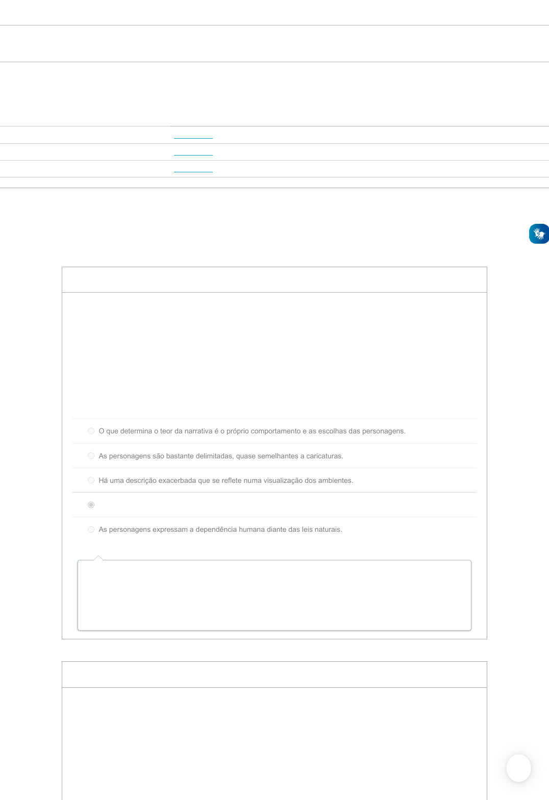 Segunda atividade primeiro marco avaliativo Entrega 14 nov em 23:59 Pontos 25 Perguntas 10 Disponível 8 nov em 0:00 - 14 nov em 23:59 7 dias Limite de tempo 120 Minutos Tentativas permitidas 2 Histórico de tentativas Tentativa Tempo Pontuação MANTIDO Tentativa 2 93 minutos 25 de 25 MAIS RECENTE Tentativa 2 93 minutos 25 de 25 Tentativa 1 60 minutos 20 de 25 As respostas corretas estarão disponíveis de 14 nov em 0:00 a 15 nov em 0:00. Pontuação desta tentativa: 25 de 25 Enviado 13 nov em 12:41 Esta tentativa levou 93 minutos. 2,5 / 2,5 ptsPergunta 1 Analise a informação a seguir. Os romances naturalistas surgem numa época em que há um forte clima de agitação política, social e cultural no país, cujos autores do período incluem em suas obras uma objetividade que nega o subjetivismo romântico. Com base na informação, marque a alternativa que apresenta uma afirmação INCORRETA sobre o romance naturalista: O que determina o teor da narrativa é o próprio comportamento e as escolhas das personagens. As personagens são bastante delimitadas, quase semelhantes a caricaturas. Há uma descrição exacerbada que se reflete numa visualização dos ambientes. Essa estética tem como finalidade adentrar no nível psicológico das personagens. As personagens expressam a dependência humana diante das leis naturais. Feedback: A estética naturalista não retrata o mundo interior das personagens, mas as condiciona ao meio em que habitam e às condições que lhes são impostas. 2,5 / 2,5 ptsPergunta 2 Analise o fragmento de “O cortiço”, de Aluísio Azevedo: “E naquela terra encharcada e fumegante, naquela umidade quente e lodosa, começou a minhocar, a esfervilhar, a crescer, um mundo, uma coisa viva, uma geração, que parecia brotar espontânea, ali mesmo, daquele lameiro, a multiplicar-se como larvas no esterco.”. (AZEVEDO, A. O cortiço. In: TERRA, E.; NICOLA, J. de. Língua, Literatura e Redação. São Paulo: Scipione, 1994. p. 159). O fragmento em questão apresenta uma característica essencial do Naturalismo, qual é? Uma compreensão biológica do mundo. Uma visão psicológica do homem. Uma visão religiosa da vida. Uma visão sentimental da natureza. Uma concepção idealista do universo. Feedback: Devido a se basear em aspectos científicos que analisam o homem e a sociedade segundo um rigor e uma objetividade, o autor insere elementos próprios que caracterizem o ser humano, como o fator biológico. 2,5 / 2,5 ptsPergunta 3 Sobre o romance “O mulato”, de Aluísio Azevedo, analise: I. Essa obra inaugurou a tendência naturalista no Brasil. II. Ela conta a história de Raimundo, que desconhece sua origem, sendo filho de um homem branco e uma escrava. Ao retornar para a sua cidade natal, apaixona-se pela prima, Ana Rosa, mas recebe a recusa da mão da moça pelo pai dela. III. O autor se distancia do debate que envolve o preconceito racial e social. IV. No final do romance, Raimundo não consegue ficar com sua prima porque a família os impede e, mesmo ao tentarem fugir juntos, ele é morto a mando de seu rival, o padre Diogo, o qual acaba se casando com Ana Rosa, representando a hipocrisia da igreja. Estão corretas apenas as afirmativas: I, II, III e IV. I, II e IV. I e II. I. III e IV. Feedback: O autor, embora implicitamente, insere em sua obra o caráter de denúncia contra o preconceito racial e social como males da sociedade. Em “O mulato”, o espaço é a província de São Luís (MA), na qual o autor insere práticas sociais consideradas comuns de lugares atrasados, onde predominavam a hipocrisia, o preconceito e a falsa moral. Exemplo disso era a personagem Quitéria, mulher rica, casada e religiosa, mas que adota de certa crueldade para com os escravos. A questão está representada na unidade 5, no tópico “5.3 Obras literárias naturalistas de crítica social no Brasil”. 2,5 / 2,5 ptsPergunta 4 Analise o trecho de “O cortiço” a seguir: Cena em que Rita Baiana se põe a dançar. “[...] Depois, como se voltasse à vida, soltava um gemido prolongado, estalando os dedos no ar e vergando as pernas, descendo, subindo, sem nunca parar com os quadris, e em seguida, sapateava, miúdo e cerrado freneticamente, erguendo e baixando os braços, que dobrava, ora um, ora outro, sobre a nuca, enquanto a carne lhe fervia toda, fibra por fibra titilando.” (AZEVEDO, A. O cortiço. 2. ed. São Paulo: Ática, 1975. p. 56). Com base no trecho, que frase sintetiza a excitação de Rita Baiana? “estalando os dedos no ar”. ”a carne fervia-lhe toda, fibra por fibra titilando”. “erguendo e baixando os braços, que dobrava”. “como se voltasse à vida”. “sem nunca parar com os quadris”. Feedback: Como a excitação se associa ao corpo, já que é uma reação química, a frase que faz referência a esse estado de prazer é “a carne fervia-lhe toda, fibra por fibra titilando” esta última palavra significa palpitando (coração). 2,5 / 2,5 ptsPergunta 5 Leia os poemas e analise o que se pede. Texto I A um poeta 1 Longe do estéril turbilhão da rua, Beneditino, escreve! No aconchego Do claustro, na paciência e no sossego, Trabalha, e teima, e lima, e sofre, e sua! 5 Mas que na forma se disfarce o emprego Do esforço; e a trama viva se construa De tal modo, que a imagem fique nua, Rica mas sóbria, como um templo grego. 10 Não se mostre na fábrica o suplício Do mestre. E, natural, o efeito agrade, Sem lembrar os andaimes do edifício: Porque a Beleza, gêmea da Verdade, Arte pura, inimiga do artifício, É a força e a graça na simplicidade. BILAC, O. Antologia de poesia brasileira: Realismo e Parnasianismo. São Paulo: Ática, 1998. p. 48. Texto II Evocação do Recife (fragmento) 1 5 10 15 20 25 Recife Não a Veneza americana Não a Mauritsstad dos armadores das índias Ocidentais Não o Recife dos Mascates Nem mesmo o Recife que aprendi a amar depois - Recife das revoluções libertárias Mas o Recife sem história nem literatura 