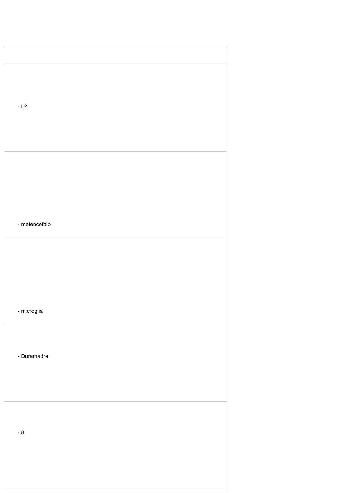 BANCO DE PREGUNTAS EN MED-200-2709: ANATOMÍA HUMANA II - MEDICINA PRIMER PARCIAL TEMA: GENERALIDADES DEL SISTEMA NERVIOSO Pregunta nro: 272095, registrada por: FRANZ MARIO FARFAN CAMA La médula espinal se extiende desde la C1 hasta la: - L1 - L2 - L3 - L4 - L5 Pregunta nro: 283431, registrada por: JUAN CARLOS MIRANDA COLQUE Cual de las siguientes provienen de la vesicula rombencefalo - telencefalo - diencefalo - mesencefalo - prosencefalo - metencefalo Pregunta nro: 283810, registrada por: JUAN CARLOS MIRANDA COLQUE Cual de las siguientes cumple funciones defensivas - astrocito protoplasmático - astrocito fibroso - neurolemocito - oligodendroglia - microglia Pregunta nro: 285574, registrada por: FRANZ MARIO FARFAN CAMA Cual de las meninges se encuentra relacionada con arteria meningea media. - Duramadre - Aracnoides - Piamadre - Ninguna Pregunta nro: 285589, registrada por: FRANZ MARIO FARFAN CAMA ¿Cuántos nervios espinales encontramos en la región cervical? - 8 - 7 - 6 - 5 - 4 Pregunta nro: 285595, registrada por: FRANZ MARIO FARFAN CAMA ¿En que vertebra comienza y en que vertebra termina la médula espinal? - C1 - L2 - C2 - L3 - C3 - L4 - C4 - L5 - C5 - L5 Pregunta nro: 285601, registrada por: FRANZ MARIO FARFAN CAMA ¿La arteria meníngea media es rama colateral de la arteria? - Arteria maxilar o maxilar interna - Arteria carótida interna - Arteria carótida externa - Tronco braquiocefalico Pregunta nro: 285606, registrada por: FRANZ MARIO FARFAN CAMA El tronco basilar se forma por la unión de las arterias: - Vertebrales izquierda y derecha - Carótidas externas izquierda y derecha - Carótidas internas izquierda y derecha - Cerebrales anteriores derecha e izquierda Pregunta nro: 285611, registrada por: FRANZ MARIO FARFAN CAMA El ligamento dentado de la médula espinal es una especialización de: - Piamadre - Aracnoides - Duramadre Pregunta nro: 285614, registrada por: FRANZ MARIO FARFAN CAMA El líquido cefalorraquídeo circula por el espacio: - Epidural - Subdural - Subaracnoideo Pregunta nro: 285621, registrada por: FRANZ MARIO FARFAN CAMA El líquido cefalorraquídeo se produce en: - Plexos coroideos - Plexos cervicales - Plexos braquiales - Plexos lumbares Pregunta nro: 285624, registrada por: FRANZ MARIO FARFAN CAMA Cuál es el la región del cerebro que regula la temperatura corporal: - Hipotalamo - Talamo - Cerebelo - Tallo encefalico Pregunta nro: 285639, registrada por: FRANZ MARIO FARFAN CAMA La arteria comunicante anterior unen las arterias: - Cerebrales anteriores derecha e izquierda - Cerebrales medias derecha e izquierda - Cerebrales posteriores derecha e izquierda Pregunta nro: 285654, registrada por: FRANZ MARIO FARFAN CAMA La cuña se encuentra en el lóbulo: - Occipital - Frontal - Parietal - Temporal Pregunta nro: 285658, registrada por: FRANZ MARIO FARFAN CAMA La fisura calcaría se encuentra en el lóbulo: - Occipital - Parietal - Temporal - Frontal Pregunta nro: 286753, registrada por: EINAR GOMEZ JUSTINIANO Las neuronas cordonales se localizan en el asta posterior y ganglios raquídeos y son: - tautomeras - heterómeras - hecatomeras - todas - ninguna Pregunta nro: 287344, registrada por: EINAR GOMEZ JUSTINIANO Una de las siguientes no pertenece a las vesículas secundarias: - Diencefalo - telencéfalo - rombencefalo - mesencéfalo - ninguno Pregunta nro: 287360, registrada por: EINAR GOMEZ JUSTINIANO Los ventrículos laterales con el tercer ventrículo se comunican a través de : - Agujero de monrro - acueducto de Silvio - conducto del epéndimo - agujero de luschka - ninguno Pregunta nro: 287366, registrada por: EINAR GOMEZ JUSTINIANO El tercer ventrículo con el cuarto ventrículo se comunica a través de: - Agujero de monrro - acueducto de Silvio - conducto del epéndimo - agujero de luschka - ninguno Pregunta nro: 287416, registrada por: EINAR GOMEZ JUSTINIANO El cuarto ventrículo con el ventrículo de Krause se comunica a través de: - Agujero de monrro - acueducto de Silvio - conducto del epéndimo - agujero de luschka - ninguno Pregunta nro: 287423, registrada por: EINAR GOMEZ JUSTINIANO El telencéfalo da origen a: - Pedúnculos cerebelosos - hipotálamo - corteza cerebral - todos - ninguno Pregunta nro: 287428, registrada por: EINAR GOMEZ JUSTINIANO Son fibras homogéneas de idéntico origen, terminación y función: - Haz - Fascículo - Cordón Pregunta nro: 287540, registrada por: EINAR GOMEZ JUSTINIANO La protuberancia o puente se origina de: - Telencéfalo - diencefalo - mesencéfalo - metencefalo - mielencefalo Pregunta nro: 287642, registrada por: EINAR GOMEZ JUSTINIANO Inervan la musculatura lisa , miocardio y glándulas: - Neuronas alfa - motoneuronas gamma - neuronas vegetativas simpáticas - neuronas vegetativas parasimpáticas Pregunta nro: 287669, registrada por: EINAR GOMEZ JUSTINIANO El sistema nervioso central se divide en: - Médula espinal y nervios craneanos - Encéfalo y nervios espinales - Encéfalo y médula espinal - Médula espinal y ganglios Pregunta nro: 287691, registrada por: EINAR GOMEZ JUSTINIANO Que estructuras forman el tronco encefálico: - Bulbo raquídeo, diencéfalo y cerebelo - Protuberancia, bulbo raquídeo y cerebelo - Protuberancia, cerebelo y cerebro - Ninguna Pregunta nro: 287701, registrada por: EINAR GOMEZ JUSTINIANO Las neuronas se clasifican en: - Unipolares - Bipolares - Multipolares - Todas - ninguna Pregunta nro: 287722, registrada por: EINAR GOMEZ JUSTINIANO Las dendritas constituyen en la neurona su: - Aparato receptor - Aparato trasmisor - Aparato trasmisor y receptor - Todos - Ninguno Pregunta nro: 292719, registrada por: LIMBERT GUZMAN BANEGAS Las funciones basicas del sistema nervioso son - SENSITIVO, SENSORIAL Y MOTORA - SENSITIVA, MOTORA E INTEGRADORA - SENSITIVA, MOTORA, PROTECTORA Pregunta nro: 300279, registrada por: WILBER ACAPA FLORES LOS NEUROTRANSMISORES MAS IMPORTANTES SON: - RIBOFLAVINA - NORADRENALINA - PIRIDOXINA Pregunta nro: 394912, registrada por: JUAN CARLOS LOAYZA FLORES