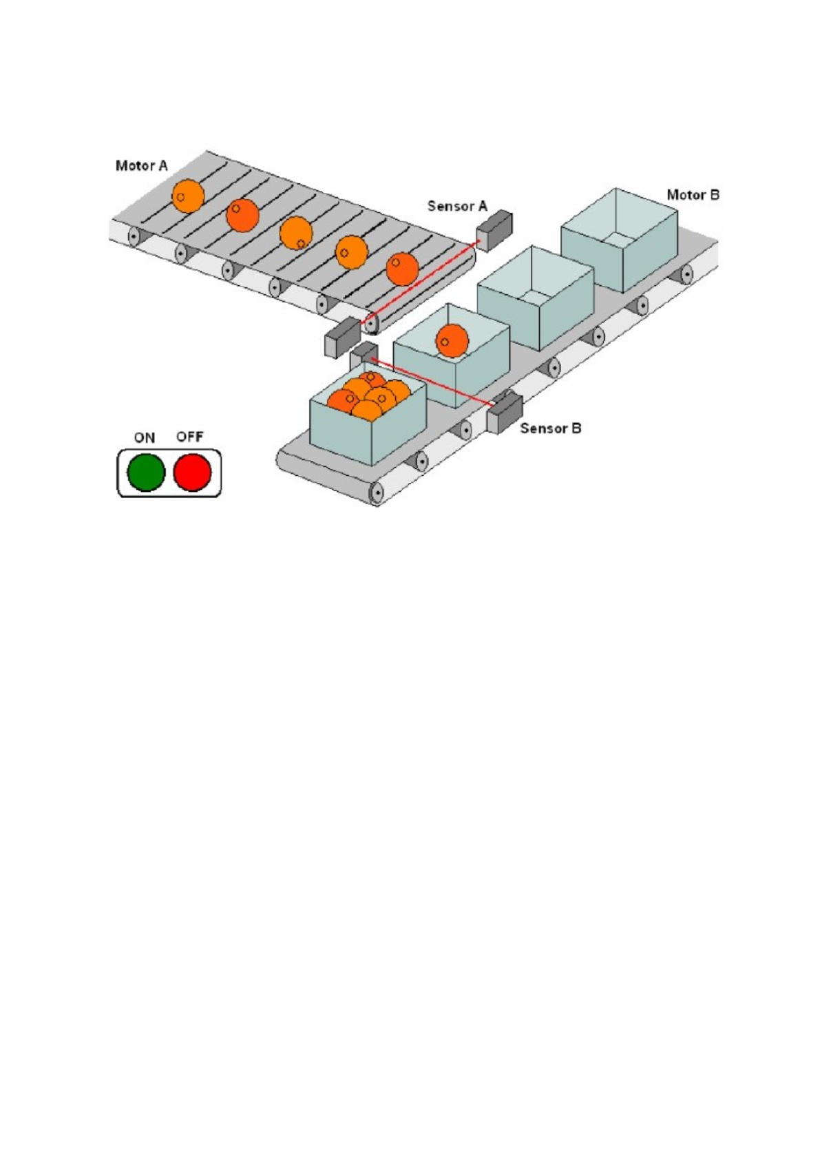 Exercício 14 - Encaixotamento de laranjas Pretende-se controlar a linha de encaixotamento de laranjas representada na figura abaixo: Ao sinal de START, a esteira das caixas entra em funcionamento. O sensor das caixas (Sensor B) ao detectar uma caixa desliga a esteira das caixas e aciona a esteira das laranjas. O sensor das laranjas (Sensor A) detecta as laranjas que entram na caixa. Após a caixa receber 10 laranjas, a esteira das laranjas desliga e a das caixas entra em funcionamento. O sinal de STOP desliga todo o processo. Entradas: Start (ON), Stop (OFF), Sensor A, Sensor B; Saídas: Motor B, Motor A Créditos: Prof. Thiago Pratti - IFC campus Luzerna IFPR campus Telêmaco Borba
