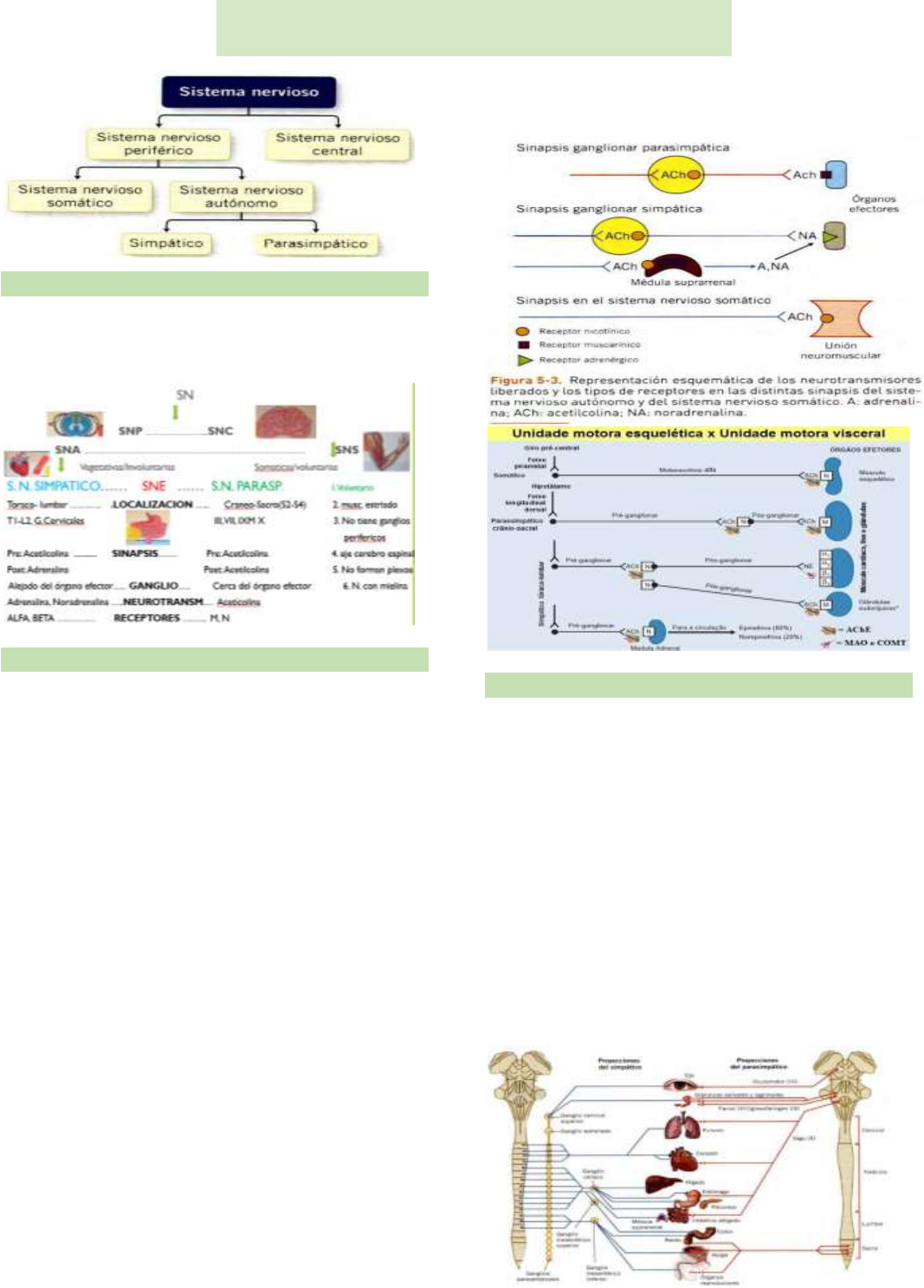 Farmacologia 05/03/2022 Sistema nervioso autônomo • Division simpática: − Ejercicio, situaciones de alarma, nerviosismo, miedo • División parasimpática - Descanso, digestión, defecación y diuresis Generalidades del sistema nervioso periferico • La porción eferente del sistema nervioso periferico se divide en dos porciones funcionales: el sistema nervioso somatico y el sistema nervioso autónomo • Los nervios somáticos estan implicados en las funciones controladas voluntariamente, como la contracción del musulo esqueletico, y constan de una única neurona que conecta el SNC con el musculo esqueletico • El sistema nervioso autónomo regula funciones corporales de forma involuntaria, consta de dos neuronas en serie que forman sinapsis en ganglios situados fuera del SNC y se divide en dos grandes porciones, simpática y parasimpática • Las neuronas preganglionares simpáticas son cortas, conectan con, al menos, 20 neuronas posganglionares que son de largo recorrido, se ramifican ampliamente e inervan glándulas, órganos y tejidos. • El sistema nervioso parasimpatico posee, generalmente, largas neuronaspreganglionares que hacen sinapsis con una o dos neuronas posganglionares próximas o dentro del órgano efector. • La maypria de los órganos reciben invervacion simpática y parasimpática, cuya activación suele ocasionar efector contrarios. • La acetilcolina es el neurotransmisor de todas las fibras autónomas preganglionares, la parasimpáticas posganglionares, las que inervan la medula suprarrenal y las somaticas que inervan el musculo esqueletico. Por ello, todas estas fibras se denominan colinérgicas. • La noradrenalina es el neurotransmisor de la mayoría de las fibras simpáticas posganglionares, por lo que se denominan fibras adrenérgicas Sistema enzimáticos de inactivación de las catecolaminas • Monoaminooxidasa (MAO) - Presente sobre todo en neuronas noradrenérgicas. - Convierte las catecolaminas en sus aldehídos, que posteriormente son metabolizados por las aldehido´- deshidrogenasas en los acidos carboxílicos correspondientes (en el caso de la noradrenalina, el acido hidroximandelico) • Catecol—metiltransferasa (COMT) - Presente en tejido neuronal y no neuronal - Metila un grupo carecol0OH para producir un derivado metoxi. - Puede atuar sobre catecolaminas sobre catecolaminas desaminadas previamente por la MAO (el metabolito principal en este caso es el acido 3- metoxi-4-hidroximandelico) Sistema nervioso- capsula de memoria Farmacologia 05/03/2022 Sistema nervioso simpatico • fisiologia: lucha o huida- estrés • farmacologia (+) Simpaticomimetico (+) Adrenérgico (+) Agonistas Adrenérgicos (-) Simpaticolíticos (-) Antagonistas Adrenérgicos (-) B Bloqueantes Sistema nervioso parasimpatico • fisiologia: descanso, alimentacion, estudio • farmacologia (+) Parasimpaticomimetico (+) Colinérgico (+) Agonistas Colinérgicos (muscarinicos) (-) Parasimpaticoliticos (-) Antagonistas Colinérgicos Clasificacion de los receptores adrenérgicos • receptores alfa-adrenergicos o Alfa1- - En el sistema nervioso central: función excitadora, localización postsináptica - En el sistema nervioso periferico: median contracción. Se encuentran: En el musculo liso vascular: funcionan en respuesta a la liberación de neurotranmisores. Localizacion intrasinaptica. En el musculo liso no vascular: median distintas funciones: - En el hígado (glucogenólisis, liberación de portassio) - En el corazón (efecto inotrópico positivo) - En el musculo gastrointestinal (relajación) - En las glándulas salivares (disminuyen secreción) o Alfa-2 - en el sistema nervioso central y periferico: localización pre-sinaptica y postsináptica - involucrados en funciones inhibidoras. Receptores presinapticos: inhiben la liberación de noradrenalina Farmacologia 05/03/2022 Receptores postsinápticos: em células hepáticas, plaquetas, musculo liso vascular. Su activacion produce agregacion plaquetária y vasoconstricción • Receptores Beta-adrenergicos: o Beta 1: son en su mayoria postsinapticos, aunque algunos no presinápticos - Receptores postsinápticos: se localizan sobre todo en corazón, pero también en plaquetas, glándulas salivales y aparato gastrointestinal (excepto esfínteres). Su activación origina: a. incremento de la fuerza y velocidad de contracción del corazón. b. Relajación del aparato gastrointestinal (excepto esfínteres) c. Agregación plaquetaria d. Secreción de amilasa por las glándulas salivales. (receptores presinápticos, su activación causa un incremento en la liberación de noradrenalina) o Beta 2: - Son también en su mayoría postsinápticos. - Se locaclizan en diversos tejidos: vasos, bronquios, aparato gastrointestinal, musculo esqueletico, hígado y mastocitos. - Su activación origina: a. Vasodilatación b. Broncodilatación c. Relajación del tubo gastrointestinal d. Glucogenólisis en el hígado e. Temblor en el musculo esqueletico f. Inhibición de la liberación de histamina por los mastocitos o Beta 3: - Se expresan principalmente en el tejido adiposo - Se cree que su activación esta relacionada con los cambios en el metabolismo energético inducidos por la noradrenalina via lipolisis y termogénesis. o Beta 4: - Se localizan en el tejido cardiaco y su activación origina un incremento en la fuerza y la velocidad de contracción del corazón.