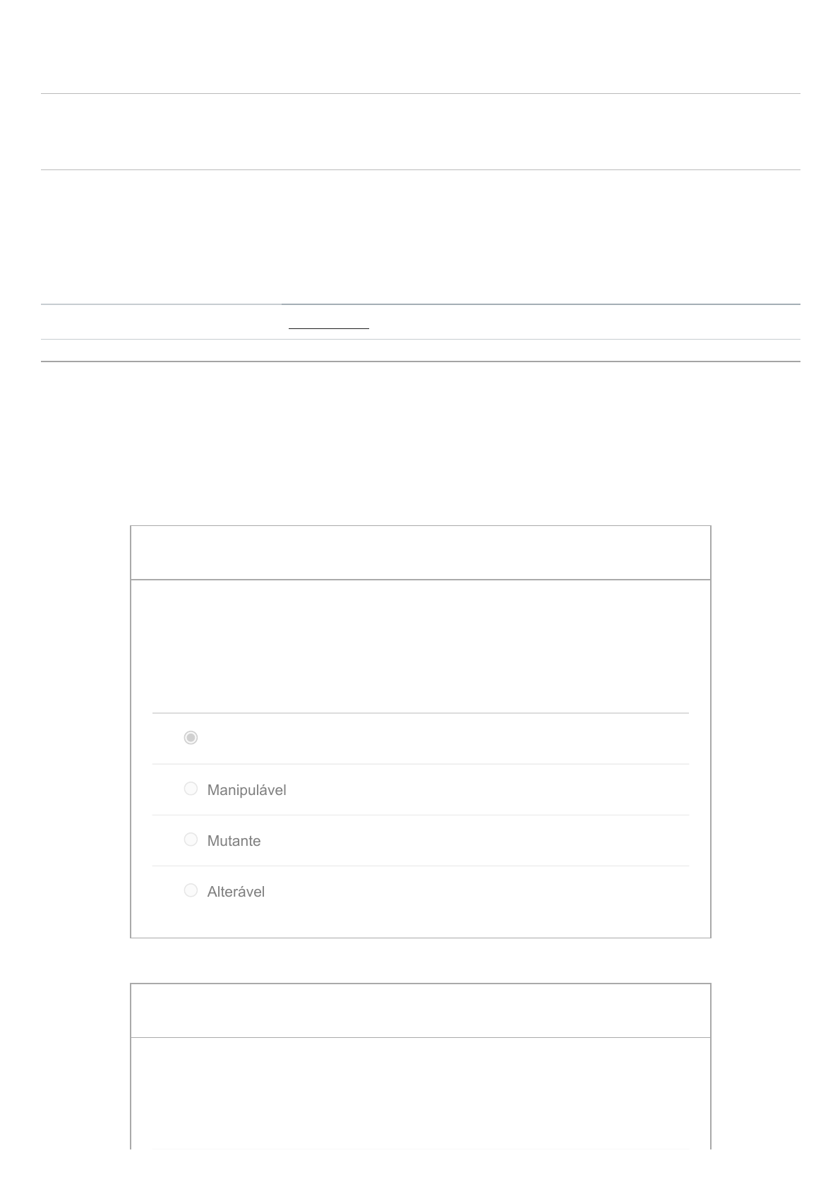 09/08/2022 18:08 Módulo 1: Exercícios de fixação do capítulo 3: Minicamp Data & Dev https://online.igti.com.br/courses/5535/quizzes/62205 1/3 Módulo 1: Exercícios de �xação do capítulo 3 Entrega 10 ago em 23:59 Pontos 6 Perguntas 6 Disponível até 10 ago em 23:59 Limite de tempo Nenhum Histórico de tentativas Tentativa Tempo Pontuação MAIS RECENTE Tentativa 1 2 minutos 6 de 6 As respostas corretas estarão disponíveis em 29 ago em 23:59. Pontuação deste teste: 6 de 6 Enviado 9 ago em 18:07 Esta tentativa levou 2 minutos. 1 / 1 ptsPergunta 1 Qual nome damos ao conceito da programação que é utilizado para armazenar valores em memória, que pode ser utilizado pelos algoritmos na realização das ações? Variável Manipulável Mutante Alterável 1 / 1 ptsPergunta 2 No JavaScript, o que o tipo de variável “number” representa? https://online.igti.com.br/courses/5535/quizzes/62205/history?version=1 09/08/2022 18:08 Módulo 1: Exercícios de fixação do capítulo 3: Minicamp Data & Dev https://online.igti.com.br/courses/5535/quizzes/62205 2/3 Somente números decimais Números Valores Lógicos Texto 1 / 1 ptsPergunta 3 No JavaScript, o que as variáveis de tipo “string” representam? Texto Números inteiros Valores Lógicos Números 1 / 1 ptsPergunta 4 No JavaScript, quais os dois valores as variáveis de tipo “boolean” aceitam? true e false 0 e -1 “V” e “F” 1 e 2 09/08/2022 18:08 Módulo 1: Exercícios de fixação do capítulo 3: Minicamp Data & Dev https://online.igti.com.br/courses/5535/quizzes/62205 3/3 1 / 1 ptsPergunta 5 Qual o operador utilizado no JavaScript para obter o resto de uma divisão? % / & ^ 1 / 1 ptsPergunta 6 No JavaScript, qual das expressões abaixo teria o valor 9 como resultado? 10 + 80 / (8 + 2) (10 + 80) / (8 + 2) 10 + (80 / 8) + 2 10 + 80 / 8 + 2 Pontuação do teste: 6 de 6
