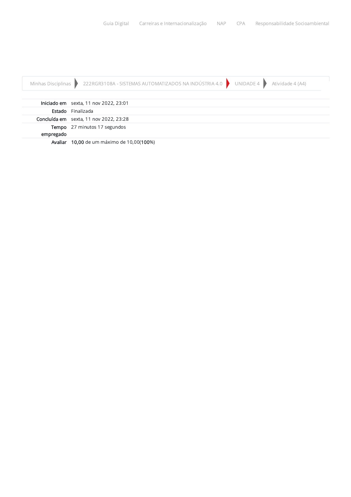 11/11/2022 23:29 Atividade 4 (A4): Revisão da tentativa https://ambienteacademico.com.br/mod/quiz/review.php?attempt=1333297&cmid=498054 1/9 Minhas Disciplinas 222RGR3108A - SISTEMAS AUTOMATIZADOS NA INDÚSTRIA 4.0 UNIDADE 4 Atividade 4 (A4) Iniciado em sexta, 11 nov 2022, 23:01 Estado Finalizada Concluída em sexta, 11 nov 2022, 23:28 Tempo empregado 27 minutos 17 segundos Avaliar 10,00 de um máximo de 10,00(100%) Guia Digital Carreiras e Internacionalização NAP CPA Responsabilidade Socioambiental https://ambienteacademico.com.br/my/ https://ambienteacademico.com.br/course/view.php?id=18106 https://ambienteacademico.com.br/course/view.php?id=18106§ion=6 https://ambienteacademico.com.br/mod/quiz/view.php?id=498054 https://codely-fmu-content.s3.amazonaws.com/Moodle/GuiaDigital/Guia+digital/index.html https://informa.fmu.br/carreiras/ https://codely-fmu-content.s3.amazonaws.com/Moodle/NAP/inicial/nap/fmu/index.html https://codely-fmu-content.s3.amazonaws.com/Moodle/CPA/landing_CPA/index.html https://portal.fmu.br/sustentabilidade 11/11/2022 23:29 Atividade 4 (A4): Revisão da tentativa https://ambienteacademico.com.br/mod/quiz/review.php?attempt=1333297&cmid=498054 2/9 Questão 1 Correto Atingiu 1,00 de 1,00 Observe a imagem a seguir, que apresenta um exemplo do esquema de acesso de uma dada rede até outra, com a porta de entrada (representada pelo termo em inglês gateway) permitindo a comunicação através de mais de um tipo de arquitetura e/ou protocolo de comunicação. Figura - Exemplo do esquema de acesso de uma rede à outra Fonte: Petruzella (2014, p. 305). #PraCegoVer: a imagem apresenta o esquema com um exemplo de acesso de uma rede à outra, trazendo o equipamento Siemens, seu gateway e, ao lado, o Omron e seu gateway, com ambas as portas conectadas ao barramento da rede. Em seguida, tem-se outros dois gateways lado a lado, associados cada um ao CLP da Allen-Bradley e da Gould, cujas comunicações são, respectivamente, em linha de dados e Modbus. PETRUZELLA, F. D. Controladores lógicos programáveis. Porto Alegre: AMGH, 2014. Considerando a imagem acima, do exemplo do esquema de acesso de uma rede à outra, analise as afirmativas a seguir e assinale V para a(s) verdadeira(s) e F para a(s) falsa(s). I. ( ) Caso a tradução de acesso à rede no exemplo seja a única função da porta, as portas serão referidas como pontes. II. ( ) As portas na parte superior possuem como função reembalar os dados vindos da primeira rede para a outra. III. ( ) O acesso do dispositivo neste caso, para o barramento, é realizado de forma direta, independentemente de método de controle. IV. ( ) Quando a interface também se ajusta ao formato dos dados, tem-se o que é conhecido por gateway. Assinale a alternativa que apresenta a sequência correta. a. V, V, F, F. b. F, V, F, V. c. V, F, F, V. d. F, F, V, F. e. V, V, F, V. Guia Digital Carreiras e Internacionalização NAP CPA Responsabilidade Socioambiental https://codely-fmu-content.s3.amazonaws.com/Moodle/GuiaDigital/Guia+digital/index.html https://informa.fmu.br/carreiras/ https://codely-fmu-content.s3.amazonaws.com/Moodle/NAP/inicial/nap/fmu/index.html https://codely-fmu-content.s3.amazonaws.com/Moodle/CPA/landing_CPA/index.html https://portal.fmu.br/sustentabilidade 11/11/2022 23:29 Atividade 4 (A4): Revisão da tentativa https://ambienteacademico.com.br/mod/quiz/review.php?attempt=1333297&cmid=498054 3/9 Questão 2 Correto Atingiu 1,00 de 1,00 Leia o trecho a seguir: “Em algumas aplicações, além das funções de controle normal, o CLP é responsável pela coleta de dados, executando o processamento necessário e estruturando os dados para a geração de relatórios. Como exemplo, é possível usar um CLP para contagem de peças e enviar automaticamente os dados para uma planilha na área de trabalho de um computador”. PETRUZELLA, F. D. Controladores lógicos programáveis. Porto Alegre: AMGH, 2014. p. 313. Nesse sentido, assinale a alternativa que apresenta o sistema responsável envolvido na situação de coleta de dados apresentada. a. Supervisor. b. Wi-Fi. c. Ethernet. d. SCADA. e. Pro�bus. Guia Digital Carreiras e Internacionalização NAP CPA Responsabilidade Socioambiental https://codely-fmu-content.s3.amazonaws.com/Moodle/GuiaDigital/Guia+digital/index.html https://informa.fmu.br/carreiras/ https://codely-fmu-content.s3.amazonaws.com/Moodle/NAP/inicial/nap/fmu/index.html https://codely-fmu-content.s3.amazonaws.com/Moodle/CPA/landing_CPA/index.html https://portal.fmu.br/sustentabilidade 11/11/2022 23:29 Atividade 4 (A4): Revisão da tentativa https://ambienteacademico.com.br/mod/quiz/review.php?attempt=1333297&cmid=498054 4/9 Questão 3 Correto Atingiu 1,00 de 1,00 Observe a imagem a seguir, que resume um sistema SCADA (Supervisory Control and Data Acquisition), geralmente implementado na maioria dos sistemas automatizados. Neste caso, é possível, ainda, perceber o papel fundamental do computador no cenário, por exemplo. Figura - Sistema SCADA - resumo Fonte: Petruzella (2014, p. 12). #PraCegoVer: a imagem em preto e branco apresenta a estrutura típica do sistema SCADA, com o computador hospedeiro (host) que em sua tela mostra alguns gráficos como exemplo do que se tem na prática, sendo, ainda, que o software SCADA/HMI está no disco rígido. A transferência de dados é realizada para outros CLPs, ilustrados através de três exemplos, mostrando, ainda, em cada um, a relação direta do controle E/S com os dispositivos de campo. PETRUZELLA, F. D. Controladores lógicos programáveis. Porto Alegre: AMGH, 2014. Considerando a imagem apresentada, a qual apresenta o sistema SCADA, analise as afirmativas a seguir e assinale V para a(s) verdadeira(s) e F para a(s) falsa(s). I. ( ) A utilização do SCADA é viabilizada por um pacote de programa. II. ( ) As fontes de sinal no contexto são os dispositivos de campo. III. ( ) A interface homem-máquina é o CLP no contexto do SCADA. IV. ( ) Os comandos de controle sã
