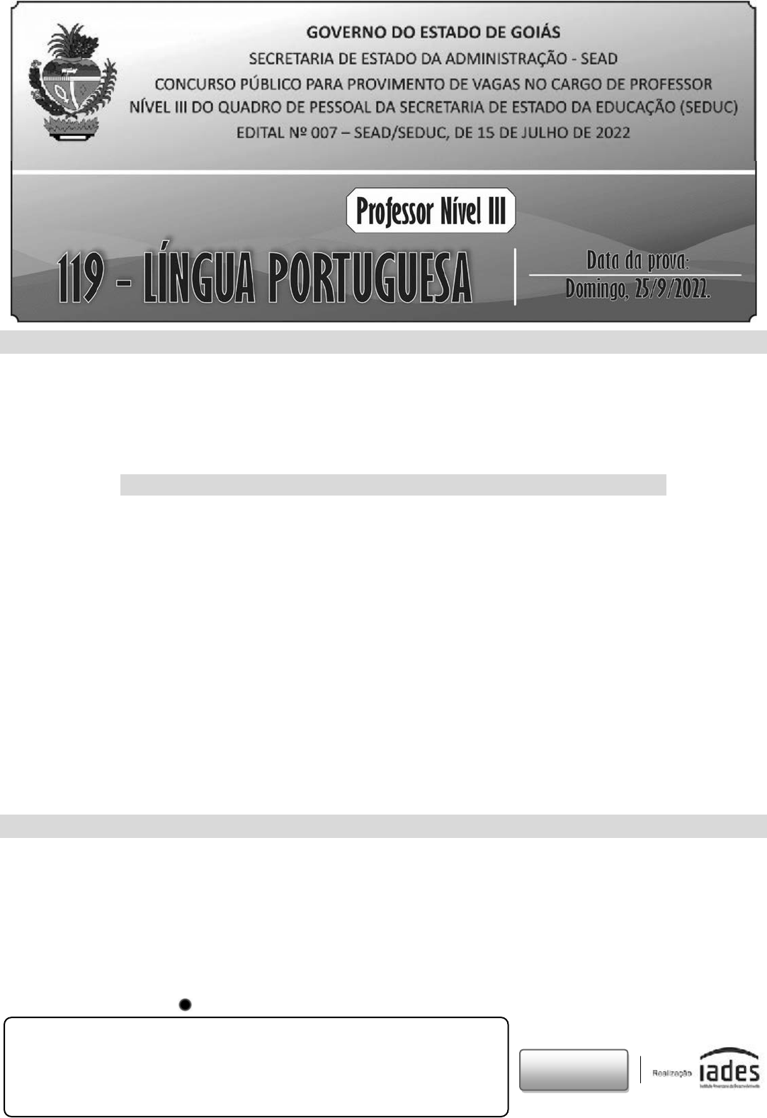 PR OV A A PL IC AD A Tipo “D” I N S T R U Ç Õ E S Você receberá do fiscal: o 1 (um) caderno de questões das provas objetiva e discursiva contendo 80 (oitenta) questões de múltipla escolha, com 5 (cinco) alternativas de resposta cada uma e apenas 1 (uma) alternativa correta, e 1 (uma) questão discursiva; o 1 (uma) folha de respostas personalizada da prova objetiva; e o 1 (uma) folha de texto definitivo da prova discursiva. Quando autorizado pelo fiscal do IADES, no momento da identificação, escreva no espaço apropriado da folha de respostas da prova objetiva, com a sua caligrafia usual, a seguinte frase: Aprenda com o ontem. Viva o hoje. Verifique se estão corretas a numeração das questões e a paginação do caderno de questões, bem como a codificação da folha de respostas da prova objetiva e da folha de texto definitivo da prova discursiva. Você dispõe de 5 (cinco) horas para fazer as provas objetiva e discursiva e deve controlar o tempo, pois não haverá prorrogação desse prazo. Esse tempo inclui a marcação da folha de respostas da prova objetiva e o preenchimento da folha de texto definitivo da prova discursiva. Somente 1 (uma) hora após o início das provas, você poderá entregar sua folha de respostas da prova objetiva, a folha de texto definitivo da prova discursiva e o caderno de provas, bem como retirar-se da sala. O candidato somente poderá retirar-se do local de aplicação das provas levando o caderno de provas no decurso dos últimos 75 (setenta e cinco) minutos anteriores ao término do tempo destinado à realização das provas. Após o término das provas, entregue ao fiscal do IADES a folha de respostas da prova objetiva, devidamente assinada, e a folha de texto definitivo da prova discursiva. Deixe sobre a carteira apenas o documento de identidade e a caneta esferográfica de tinta preta, fabricada com material transparente. Não é permitida a utilização de nenhum aparelho eletrônico ou de comunicação. Não é permitida a consulta a livros, dicionários, apontamentos e (ou) apostilas. Você somente poderá sair e retornar à sala de aplicação de provas na companhia de um fiscal do IADES. Não será permitida a utilização de lápis em nenhuma etapa das provas. Ao final das provas, os (as) 3 (três) últimos(as) candidatos(as) devem permanecer juntos(as) na sala, com todo o seu material, sendo somente liberados(as) quando o (a) último(a) tiver concluído as provas, entregando, simultaneamente, o cartão de resposta da prova objetiva e a folha de texto definitivo da prova discursiva. I NS T RU Ç Õ ES P A R A A S P R O V AS O B J ETI V A E D I S C UR S IV A Verifique se os seus dados estão corretos na folha de respostas da prova objetiva e na folha de texto definitivo da prova discursiva. Caso haja algum dado incorreto, comunique ao fiscal. Leia atentamente cada questão e assinale, na folha de respostas da prova objetiva, uma única alternativa. A folha de respostas da prova objetiva e a folha de texto definitivo da prova discursiva não podem ser dobradas, amassadas, rasuradas ou manchadas e nem podem conter nenhum registro fora dos locais destinados às respostas. O candidato deverá transcrever, com caneta esferográfica de tinta preta, as respostas da prova objetiva para a folha de respostas e o texto definitivo da prova discursiva para a folha de texto definitivo. A maneira correta de assinalar a alternativa na folha de respostas da prova objetiva é cobrir, fortemente, com caneta esferográfica de tinta preta, o espaço a ela correspondente. Marque as respostas assim: PR OV A A PL IC AD A CONCURSO PÚBLICO – SEAD/SEDUC-GO 119 – LÍNGUA PORTUGUESA TIPO “D” PÁGINA 2/21 P R O V A O B J E T I V A CONHECIMENTOS GERAIS Questões de 1 a 40 LÍNGUA PORTUGUESA Questões de 1 a 10 Texto 1 para responder às questões 1 e 2. 1 4 7 10 13 Um dos espaços para a transmissão de valores é a sala de aula, desde os balbucios do jardim de infância até a cátedra pós-universitária. Para isso, devemos ter consciência da relevância da atividade diária da aula como um espaço de vivência exemplar e habitual dos valores a que aspiramos e que sejam definidos socialmente. O primeiro passo consiste em dar-nos conta da importância de que, como professores, praticamos esses valores em todos os momentos, já que são eles que nos dão uma verdadeira qualidade humana. Nossa sociedade necessita, portanto, reencontrar o ser humano e sua essência como objetivo central e, partindo dessa visão, avançar na busca de seu bem-estar e felicidade em interação harmônica com a natureza. PUEBLA, Eugênia. Educar com o coração: uma educação que desenvolve a intuição. São Paulo: Petrópolis, 1997, com adaptações. QUESTÃO 1 _______________________ De acordo com o texto, o professor (A) precisa, além de dominar o conteúdo de sua disciplina, primar pela interação harmônica com a natureza. (B) deve respeitar os documentos norteadores de sua atividade diária em sala aula, bem como os valores ensinados nesta vivência. (C) necessita, como objetivo central, reencontrar o ser humano e sua essência para se sentir feliz. (D) precisa ter consciência da necessidade de haver bem-estar na sala de aula para que a interação seja harmônica. (E) tem que perceber, inicialmente, a importância de praticar os valores relevantes para a sociedade, os quais são geradores de qualidade humana. QUESTÃO 2 _______________________ Considerando os mecanismos de coesão, em “Para isso, devemos ter consciência da relevância da atividade diária da aula como um espaço de vivência exemplar e habitual dos valores a que aspiramos e que sejam definidos socialmente.” (linhas de 3 a 6), o referente semântico do pronome sublinhado é (A) “espaços” (linha 1). (B) “sala de aula” (linhas 1 e 2). (C) “transmissão de valores” (linha 1). (D) “relevância da atividade diária” (linha 4). (E) “espaço de vivência exemplar e habitual” (lin