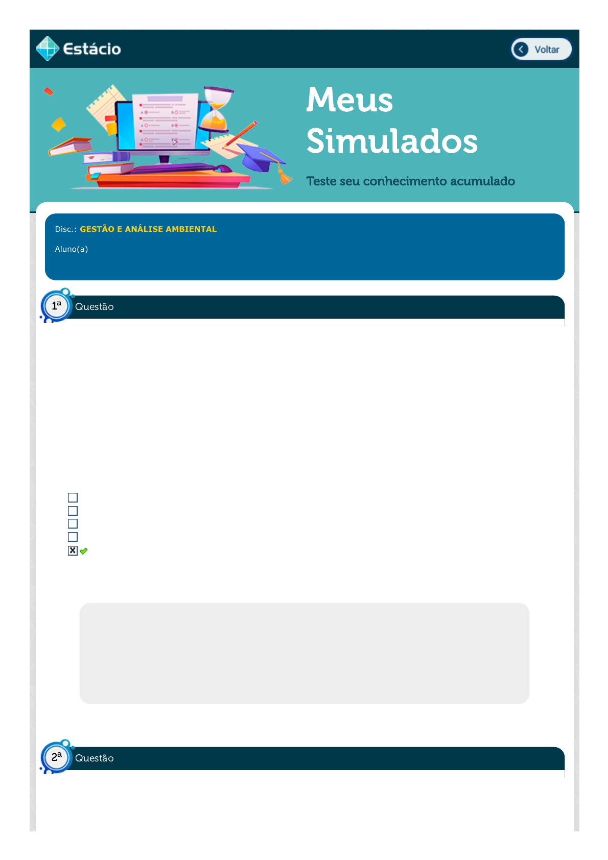 12/11/2022 22:00 Estácio: Alunos https://simulado.estacio.br/alunos/ 1/6 Meus Simulados Teste seu conhecimento acumulado Disc.: GESTÃO E ANÁLISE AMBIENTAL Aluno(a): VANESSA MUZY DA SILVA 201902657322 Acertos: 10,0 de 10,0 12/11/2022 Acerto: 1,0 / 1,0 A Conferência das Nações Unidas sobre o Meio Ambiente e Desenvolvimento, também conhecida como Cúpula da Terra, teve como eixo de discussão o Meio Ambiente e o Desenvolvimento Sustentável. Do evento resultou a elaboração de diversos documentos ou acordos como exemplo a Agenda 21 Global. A partir da definição apresentada, avalie as asserções a seguir e a relação proposta entre elas: I - A Agenda 21 é um documento que contempla as diretrizes para elaboração pelos países participantes de suas Agendas 21 - nacionais, regionais e locais. PORQUE II - Visa um novo padrão de desenvolvimento com soluções direcionadas ao meio ambiente em escala planetária. A respeito dessas asserções, assinale a alternativa correta. A asserção I é uma proposição falsa, e a II é uma proposição verdadeira. A asserção I é uma proposição verdadeira, e a II é uma proposição falsa. As asserções I e II são proposições falsas. As asserções I e II são proposições verdadeiras, mas a II não é uma justificativa da I. As asserções I e II são proposições verdadeiras, e a II é uma justificativa da I. Respondido em 12/11/2022 20:40:57 Explicação: Gabarito: As asserções I e II são proposições verdadeiras, e a II é uma justificativa da I. Justificativa: Tendo em vista que grandes problemas ambientais ultrapassam fronteiras, eles só podem ter uma perspectiva de superação com a cooperação mundial. Assim, a Agenda 21 Global contempla um novo padrão de "desenvolvimento sustentável" em escala planetária e dá as diretrizes para elaboração pelos países participantes de suas Agendas 21 (nacionais, regionais e locais). Acerto: 1,0 / 1,0 Analise as afirmações: I. As condutas consideradas crimes contra o meio ambiente estão previstas principalmente na Lei 9.605/98, no Código Penal, no Código Florestal, na Lei de Contravenções Penais, e nas leis 6.453/77 e 7.643/87. Questão1 a Questão2 a https://simulado.estacio.br/alunos/inicio.asp javascript:voltar(); 12/11/2022 22:00 Estácio: Alunos https://simulado.estacio.br/alunos/ 2/6 PORTANTO II. A responsabilidade ambiental tem expressa previsão constitucional, no parágrafo 3º do artigo 225 da Constituição de 1988. Desta previsão constitucional se extraem as três esferas do direito ambiental: preventiva, reparatória e repressiva. A respeito dessas asserções, assinale a opção correta. A asserção I é uma proposição verdadeira, e a II é uma proposição falsa. As asserções I e II são proposições falsas. As asserções I e II são proposições verdadeiras, mas a II não é uma justificativa correta da I. As asserções I e II são proposições verdadeiras, e a II é uma justificativa correta da I. A asserção I é uma proposição falsa, e a II é uma proposição verdadeira. Respondido em 12/11/2022 20:47:05 Explicação: Gabarito: As asserções I e II são proposições verdadeiras, mas a II não é uma justificativa correta da I. Justificativa sobre as assertivas: As asserções I e II estão corretas. Contudo, a I aborda sobre as leis que tratam os crimes ambientais. Já a II discursa sobre a responsabilidade ambiental nas esferas do direito ambiental determinadas através da Constituição Federal. Assim, apesar de verdadeira, a II não justifica a I. Acerto: 1,0 / 1,0 Considerando as informações a seguir, avalie as asserções e a relação proposta entre elas: I. A Licença de Operação autoriza o funcionamento do empreendimento. Essa licença deve ser requerida quando a empresa estiver edificada e após a verificação da eficácia das medidas de controle ambiental estabelecidas nas condicionantes das licenças anteriores. O prazo de vigência dessa licença varia entre quatro e dez anos, o que será determinado pelo órgão ambiental responsável. Portanto II. A avaliação de impactos ambientais é um dos instrumentos da Política Nacional do Meio Ambiente que determina qual a extensão ou a gravidade do aumento da taxa de infecção de um agente na população de uma cidade. É um instrumento de gestão preventiva que está embasado em procedimentos legais, institucionais e técnico-científicos. A respeito dessas asserções, assinale a opção correta: A asserção I é uma proposição verdadeira, e a II é uma proposição falsa. As asserções I e II são proposições falsas. A asserção I é uma proposição falsa, e a II é uma proposição verdadeira. As asserções I e II são proposições verdadeiras, e a II é uma justificativa correta da I. As asserções I e II são proposições verdadeiras, mas a II não é uma justificativa correta da I. Respondido em 12/11/2022 20:52:05 Explicação: Gabarito: As asserções I e II são proposições verdadeiras, mas a II não é uma justificativa correta da I. Justificativa da resposta: A asserção faz referência à Licença de Operação que autoriza a operação da atividade, obra ou empreendimento, devendo o órgão ambiental responsável realizar a fiscalização da obra para verificar o cumprimento das normas ambientais. Já a avaliação de impactos ambientais dispõe sobre os objetivos e princípios da política ambiental, exigindo para todos os empreendimentos com potencial de impactar o meio ambiente. Acerto: 1,0 / 1,0 Questão3 a Questão4 a 12/11/2022 22:00 Estácio: Alunos https://simulado.estacio.br/alunos/ 3/6 (Metro Capital Soluções - Prefeitura de Nova Odessa-SP / 2019) O EIA e o RIMA são documentos importantes exigidos na fase de licenciamento de empreendimentos ou atividades que possam causar significativa degradação ambiental. Marque a alternativa correta, que evidencia a fase do licenciamento ambiental, onde o EIA e RIMA devem ser exigidos. Licenç