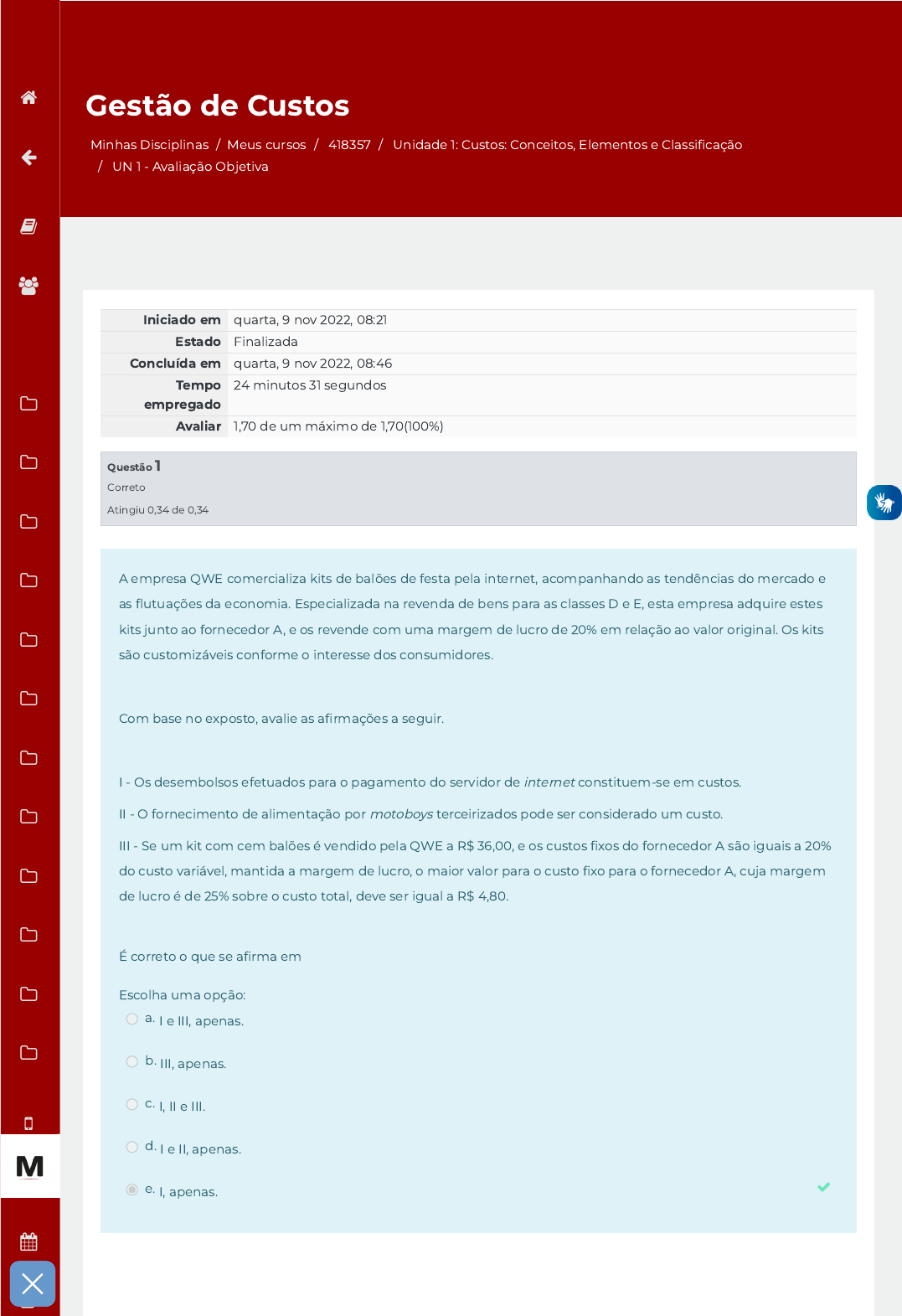 Minhas Disciplinas / Meus cursos / 418357 / Unidade 1: Custos: Conceitos, Elementos e Classi�cação / UN 1 - Avaliação Objetiva Gestão de Custos Iniciado em quarta, 9 nov 2022, 08:21 Estado Finalizada Concluída em quarta, 9 nov 2022, 08:46 Tempo empregado 24 minutos 31 segundos Avaliar 1,70 de um máximo de 1,70(100%) Questão 1 Correto Atingiu 0,34 de 0,34 A empresa QWE comercializa kits de balões de festa pela internet, acompanhando as tendências do mercado e as �utuações da economia. Especializada na revenda de bens para as classes D e E, esta empresa adquire estes kits junto ao fornecedor A, e os revende com uma margem de lucro de 20% em relação ao valor original. Os kits são customizáveis conforme o interesse dos consumidores. Com base no exposto, avalie as a�rmações a seguir. I - Os desembolsos efetuados para o pagamento do servidor de internet constituem-se em custos. II - O fornecimento de alimentação por motoboys terceirizados pode ser considerado um custo. III - Se um kit com cem balões é vendido pela QWE a R$ 36,00, e os custos �xos do fornecedor A são iguais a 20% do custo variável, mantida a margem de lucro, o maior valor para o custo �xo para o fornecedor A, cuja margem de lucro é de 25% sobre o custo total, deve ser igual a R$ 4,80. É correto o que se a�rma em Escolha uma opção: a. I e III, apenas. b. III, apenas. c. I, II e III. d. I e II, apenas. e. I, apenas. https://avap.multivix.edu.br/my/ https://avap.multivix.edu.br/course/view.php?id=19108 https://avap.multivix.edu.br/course/view.php?id=19108§ion=2 https://avap.multivix.edu.br/mod/quiz/view.php?id=1259084 https://avap.multivix.edu.br/my/ https://avap.multivix.edu.br/course/view.php?id=19108 https://avap.multivix.edu.br/user/index.php?id=19108 https://avap.multivix.edu.br/course/view.php?id=19108§ion=1 https://avap.multivix.edu.br/course/view.php?id=19108§ion=2 https://avap.multivix.edu.br/course/view.php?id=19108§ion=3 https://avap.multivix.edu.br/course/view.php?id=19108§ion=4 https://avap.multivix.edu.br/course/view.php?id=19108§ion=5 https://avap.multivix.edu.br/course/view.php?id=19108§ion=6 https://avap.multivix.edu.br/course/view.php?id=19108§ion=7 https://avap.multivix.edu.br/course/view.php?id=19108§ion=8 https://avap.multivix.edu.br/course/view.php?id=19108§ion=9 https://avap.multivix.edu.br/course/view.php?id=19108§ion=10 https://avap.multivix.edu.br/course/view.php?id=19108§ion=11 https://avap.multivix.edu.br/course/view.php?id=19108§ion=12 https://avap.multivix.edu.br/hooks/portal/ https://avap.multivix.edu.br/mod/page/view.php?id=1252%2F%22%20target%3D%22_blank https://avap.multivix.edu.br/calendar/view.php/ https://avap.multivix.edu.br/local/staticpage/view.php?page=biblioteca https://avap.multivix.edu.br/ Questão 2 Correto Atingiu 0,34 de 0,34 A empresa BNM, uma marcenaria localizada em uma cidade da região metropolitana de São Paulo, veri�cou que o índice de perda de matéria-prima (especi�camente, chapas de madeira do tipo MDF) durante as etapas de produção é igual a 20% do peso total de matéria-prima. Deste montante, 40% corresponde a pedaços de madeira (cavacos), e os demais 60% correspondem a serragem. É sabido que a empresa paga R$ 90,00 a cada chapa de madeira MDF, com peso médio de 15 kg. Recentemente, a empresa BNM passou a revender a serragem, com o preço de R$ 20,00 pelo saco de 20 kg, e a revender os cavacos, a R$ 12,00 o saco com 5kg. Considere que o único custo dos sacos de serragem e cavacos é a própria madeira. Diante do conteúdo apresentado, é correto a�rmar que Escolha uma opção: a. a margem de lucro da venda de serragem tende ao in�nito, uma vez que é um material sem custo. b. o fato de matéria-prima estar sendo descartada no processo produtivo (serragem) constitui-se contabilmente como perda anormal. c. a margem de recuperação das perdas com a formação de serragem, mediante a operação de venda, é de 33,3%. d. a empresa recupera, com a venda de cavacos, 40% das perdas com a formação deste resíduo. e. o índice de recuperação das perdas com a revenda de cavaco e serragem é de 30%. https://avap.multivix.edu.br/my/ https://avap.multivix.edu.br/course/view.php?id=19108 https://avap.multivix.edu.br/user/index.php?id=19108 https://avap.multivix.edu.br/course/view.php?id=19108§ion=1 https://avap.multivix.edu.br/course/view.php?id=19108§ion=2 https://avap.multivix.edu.br/course/view.php?id=19108§ion=3 https://avap.multivix.edu.br/course/view.php?id=19108§ion=4 https://avap.multivix.edu.br/course/view.php?id=19108§ion=5 https://avap.multivix.edu.br/course/view.php?id=19108§ion=6 https://avap.multivix.edu.br/course/view.php?id=19108§ion=7 https://avap.multivix.edu.br/course/view.php?id=19108§ion=8 https://avap.multivix.edu.br/course/view.php?id=19108§ion=9 https://avap.multivix.edu.br/course/view.php?id=19108§ion=10 https://avap.multivix.edu.br/course/view.php?id=19108§ion=11 https://avap.multivix.edu.br/course/view.php?id=19108§ion=12 https://avap.multivix.edu.br/hooks/portal/ https://avap.multivix.edu.br/mod/page/view.php?id=1252%2F%22%20target%3D%22_blank https://avap.multivix.edu.br/calendar/view.php/ https://avap.multivix.edu.br/local/staticpage/view.php?page=biblioteca https://avap.multivix.edu.br/ Questão 3 Correto Atingiu 0,34 de 0,34 Questão 4 Correto Atingiu 0,34 de 0,34 A empresa YTR fabrica e comercializa pisos cerâmicos para residências. Estes materiais são vendidos para casas de material de construção. Durante o processo de preparação do produto para embalagem, é esperado que 3 m² de pisos se quebrem a cada lote de 200 m² fabricados. A empresa desembolsa R$ 10,00 como custos totais de produção por m², e agrega 20% deste valor como despesas, sendo que as perdas normais não são consideradas para este cálculo. A margem de lucro é de 10% sobre o montante de custos, despesas e perdas. Deste modo, contando-se as perdas, é correto a�rmar que o preço �nal de 