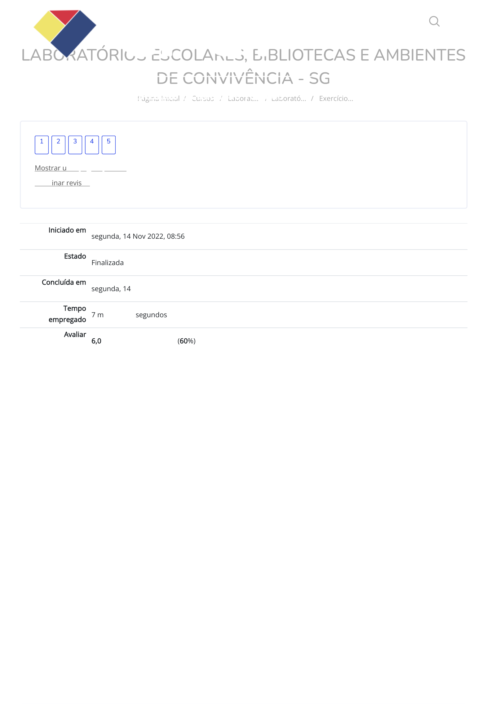 LABORATÓRIOS ESCOLARES, BIBLIOTECAS E AMBIENTES DE CONVIVÊNCIA - SG Página Inicial / Cursos / Laborat… / Laborató… / Exercício… Iniciado em segunda, 14 Nov 2022, 08:56 Estado Finalizada Concluída em segunda, 14 Nov 2022, 09:03 Tempo empregado 7 minutos 19 segundos Avaliar 6,0 de um máximo de 10,0(60%) Mostrar uma página por vez Terminar revisão 1 2 3 4 5 https://cpetead.com.br/ https://cpetead.com.br/course/index.php https://cpetead.com.br/course/view.php?id=2445 https://cpetead.com.br/mod/quiz/view.php?id=61175 https://cpetead.com.br/mod/quiz/review.php?attempt=3205858&cmid=61175&showall=0 https://cpetead.com.br/mod/quiz/view.php?id=61175 https://cpetead.com.br/ QUESTÃO Correto Atingiu 2,0 de 2,0 1 Os laboratórios escolares se constituem como espaços privilegiados para a promoção de aprendizagens signi�cativas. Sobre esses espaços, leia as a�rmativas a seguir: I. Os laboratórios escolares foram criados a partir da adoção, nas escolas brasileiras, da abordagem construtivista de ensino. II. Para que se constituam efetivamente como espaços de aprendizagens, os laboratórios devem se constituir como espaços nos quais os alunos possam agir física e cognitivamente sobre os objetos de conhecimento. III. Os laboratórios se destinam apenas às aprendizagens na área de ciências da natureza. IV. As atividades de laboratório precisam ser cuidadosamente planejadas pelo professor para que os alunos atinjam os objetivos propostos. São verdadeiras as a�rmativas: Escolha uma opção: a. I e II. b. I e III. c. II e IV. Por que esta resposta é a correta? Os laboratórios escolares já existem há muito tempo, sendo utilizados de diferentes maneiras pelas diferentes abordagens de ensino. Para que se constituam efetivamente como espaços de aprendizagem na perspectiva atualmente adotada, os laboratórios precisam se constituir como espaços nos quais os alunos possam agir física e cognitivamente sobre os objetos de conhecimento. No espaço escolar, podem ser constituídos laboratórios de diferentes áreas do conhecimento, visando sempre a situações de experimentação. Os materiais e o espaço do laboratório não são, por si só, promotores de novas aprendizagens. Faz-se necessário que o professor planeje, cuidadosamente, as atividades que serão realizadas para que elas cumpram os objetivos propostos. d. III e IV. e. II e III. Sua resposta está correta. A resposta correta é: II e IV. QUESTÃO Correto Atingiu 2,0 de 2,0 2 Diferentes tipos de laboratórios podem ser encontrados em diferentes realidades educativas. Um tipo muito comum é o laboratório de informática. A importância desse tipo de laboratório é dada: Escolha uma opção: a. pela diversi�cação dos recursos de aprendizagem oferecidos pelo uso de tecnologias. Por que esta resposta é a correta? O laboratório de informática é importante nos processos de aprendizagem na medida em que coloca os alunos em contato com recursos pedagógicos diversi�cados, que contribuem para a construção de novos conhecimentos. O acesso às redes sociais, o contato com jogos virtuais e a realização de pesquisas podem ser pensados em termos de possibilidades dos laboratórios de informática, desde que articulados com os objetivos didáticos propostos ao grupo. O professor deve acompanhar as atividades e propor boas intervenções docentes enquanto elas são realizadas. b. pela ocupação dos alunos em atividades on-line enquanto o professor realiza outras atividades. c. pela �nalidade única de propor aos alunos a realização de jogos virtuais de aplicação dos conteúdos. d. pela importância da diversidade de sites nos quais os alunos podem realizar pesquisas. e. pela possibilidade de utilização da Internet escolar para o acesso às redes sociais dos alunos. Sua resposta está correta. A resposta correta é: pela diversi�cação dos recursos de aprendizagem oferecidos pelo uso de tecnologias. QUESTÃO Correto Atingiu 2,0 de 2,0 3 Sendo o Brasil um País de grandes dimensões e desigualdades, há escolas com laboratórios muito bem equipados e outras sem nenhuma estrutura ou com laboratórios muito sucateados. Quando o professor está ciente da importância das atividades experimentais, mas se depara com uma realidade sem o espaço adequado, ele deve: Escolha uma opção: a. planejar atividades de caráter experimental utilizando outros espaços escolares. Por que esta resposta é a correta? Quando o professor está ciente da importância de atividades que promovam a experimentação por parte dos alunos, mas se depara com uma realidade na qual não há um espaço constituído para essa �nalidade, ele deve planejar atividades de caráter experimental utilizando outros espaços escolares. Desistir desse tipo de experiência signi�caria impedir a aprendizagem signi�cativa por parte dos alunos. O professor pode até conversar com a direção para pedir providências, mas enquanto elas não são tomadas, ele deve realizar as atividades em outros espaços. A demonstração por parte do professor não substitui a experimentação por parte do aluno, uma vez que não permite a participação ativa dos aprendizes. O �nanciamento coletivo até pode ser feito, mas há uma série de outras providências envolvidas na reforma escolar, que demandam tempo. b. fazer um �nanciamento coletivo para a construção de um laboratório escolar e utilizar esse único espaço. c. desistir das atividades experimentais, que só são possíveis quando há um espaço constituído para que elas sejam realizadas. d. providenciar alguns materiais para que ele mesmo faça demonstrações e os alunos assistam. e. exigir da direção escolar providências e só propor esse tipo de atividade quando as exigências forem atendidas. Sua resposta está correta. A resposta correta é: planejar atividades de caráter experimental utilizando outros espaços escolares. QUESTÃO Incorreto Atingiu 0,0 de 2,0 4 Os laboratórios de c