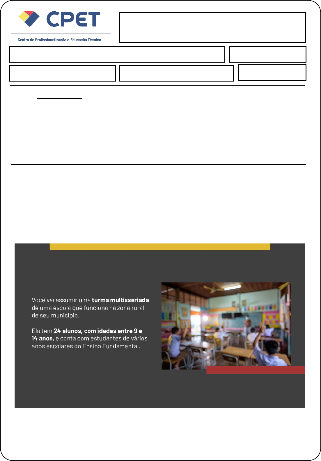Atividade Prática De acordo com os dados do Censo Escolar de 2017, existem cerca de 97.500 turmas multisseriadas de Ensino Fundamental no Brasil. A realidade de muitas dessas escolas é da uni docência, com apenas um professor sendo responsável pelo ensino e pela gestão administrativa da escola. Alguns estudos demonstram que os principais problemas das turmas multisseriadas estão relacionados à ausência de uma capacitação específica para os professores envolvidos, a falta de material pedagógico adequado e a ausência de infraestrutura básica para a condução do trabalho docente. Pensando na convivência como potencializadora de aprendizagens significativas, que ações você poderia implementar nessa turma para proporcionar um processo de ensino-aprendizagem efetivo? Laboratórios Escolares, Bibliotecas e Ambientes de Convivência Aluno (a): Cleonice Aparecida Data: 13/ 11 / 2022. Atividade Prática I NOTA: INSTRUÇÕES: ❖ Esta Avaliação contém 1 (uma) questão, totalizando 10 (dez) pontos. ❖ Você deve preencher dos dados no Cabeçalho para sua identificação o Nome / Data de entrega ❖ As respostas devem ser digitadas abaixo de cada pergunta. ❖ Ao terminar, grave o arquivo com o nome Avaliação Pesquisa/Prática. ❖ Envio o arquivo pelo sistema. Atividade Prática Trabalhar com grupos formados por alunos com capacidades semelhantes permite que os alunos interajam entre si, se auxiliando na resolução de problemas de aprendizagem e na superação de dúvidas. Mesmo que a turma inteira esteja trabalhando com a mesma atividade, as diferentes idades podem ser exploradas, pois alunos com níveis diferentes de conhecimento e com níveis diferentes de habilidades podem cooperar entre si, proporcionando troca de saberes. O trabalho com projetos também pode ser utilizado, explorando o interesse de alunos de idades diferentes por um mesmo tema. Assim, durante as pesquisas relacionadas ao tema do projeto, os alunos, por meio de habilidades diferentes, se desenvolvem e possibilitam o desenvolvimento dos seus colegas. Ao explorar as potencialidades da convivência de alunos com idades diferentes para o desenvolvimento dos alunos, o professor pode romper com a lógica da divisão de conteúdos e da divisão etária.