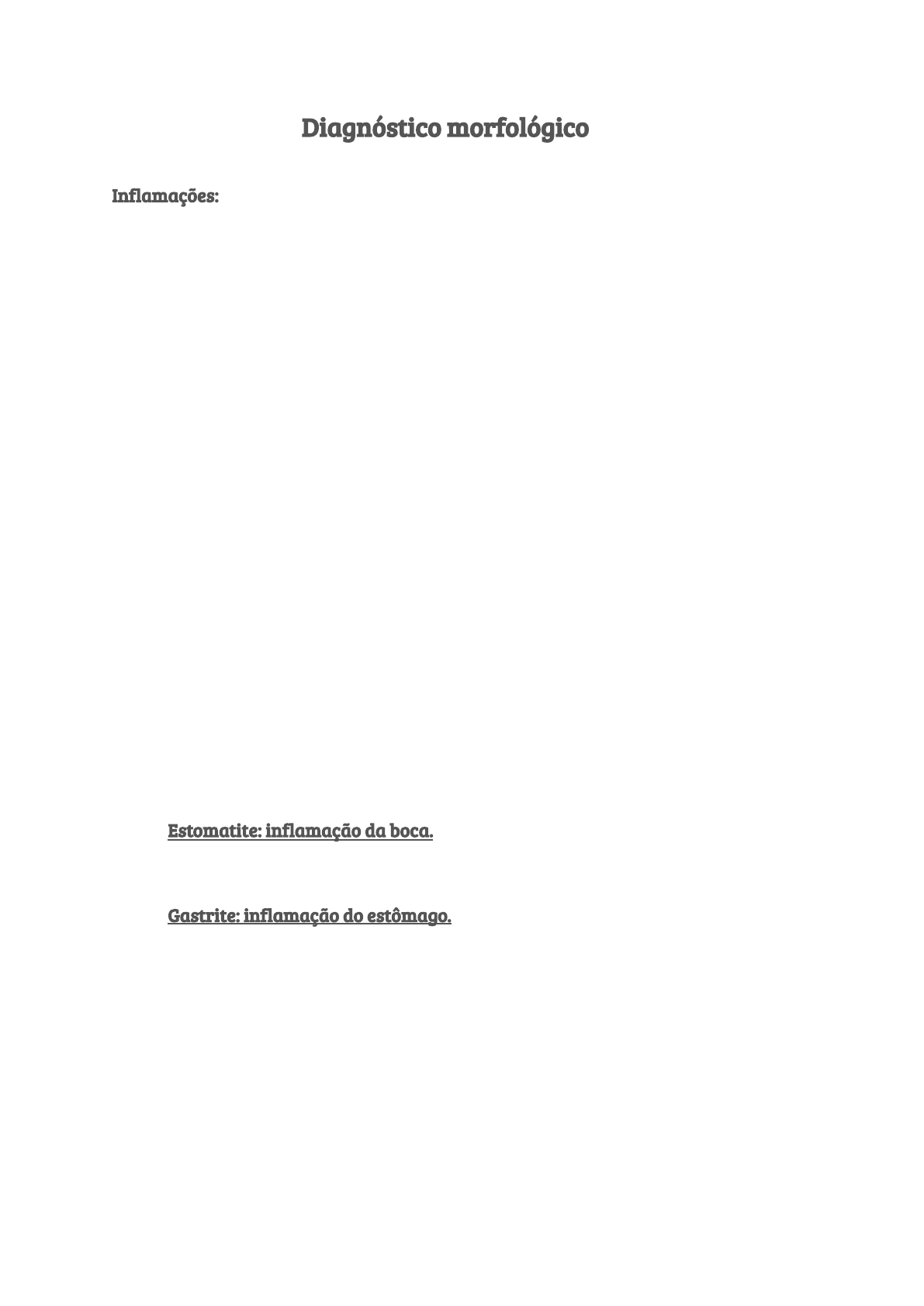 Diagnóstico morfológico Inflamações: ● Adenite: inflamação de uma glândula ou linfonodo. ● Arterite: inflamação da parede da artéria. ● Artrite: inflamação das articulações. ● Balanite: inflamação do pênis. ● Bronquite: inflamação dos brônquios. ● Bursite: inflamação da bursa de fabricius. ● Cervicite: inflamação da cérvix. ● Cistite: inflamação da vesícula urinária. ● Colecistite: inflamação da vesícula biliar. ● Colite: inflamação do cólon. ● Conjuntivite: inflamação da conjuntiva. ● Dermatite: inflamação da pele. ● Duodenite: inflamação do duodeno. ● Encefalite: inflamação do encéfalo. ● Endocardite: inflamação do endocárdio. ● Endometrite (metrite): inflamação do útero. ● Enterite difusa: inflamação da mucosa do intestino delgado. ● Enterite: inflamação do intestino como todo. ● Esofagite: inflamação do esôfago. ● Esplenite: inflamação do baço. ● Estomatite: inflamação da boca. ● Faringite: inflamação da faringe. ● Flebite: inflamação da parede da veia. ● Gastrite: inflamação do estômago. ● Gengivite: inflamação da gengiva. ● Glossite: inflamação da língua. ● Hepatite: inflamação do fígado. ● Ileíte: inflamação do íleo. ● Jejunite: inflamação do jejuno. ● Laminite: inflamação do casco. ● Linfadenite: inflamação dos linfonodos. ● Mastite: inflamação da glândula mamária. ● Meningite: inflamação das meninges. ● Mielite: inflamação na massa cinzenta e branca da medula espinhal. ● Miocardite: inflamação do miocárdio. ● Miocardite: inflamação do músculo cardíaco. ● Miosite: inflamação do músculo. ● Nefrite: inflamação do rim. ● Orquite: inflamação dos testículos. ● Osteíte: inflamação do osso. ● Osteomielite: inflamação da medula óssea. ● Otite: inflamação do ouvido. ● Pancreatite: inflamação do pâncreas. ● Pericardite: inflamação do saco pericárdico. ● Peritonite: inflamação do peritônio. ● Pleurite: inflamação da membrana que envolve os pulmões e reveste a cavidade torácica. ● Pneumonia: inflamação dos pulmões. ● Postite: inflamação do prepúcio. ● Proctite: inflamação do ânus. ● Proctite: inflamação do reto. ● Pulpite: inflamação da polpa dentária. ● Queilite: inflamação nos lábios. ● Rinite: inflamação da cavidade nasal. ● Salpingite: inflamação da região da tuba uterina. ● Sinusite: inflamação das mucosas dos seios paranasais. ● Tendinite: inflamação do tendão. ● Tiflite: inflamação do ceco. ● Traqueíte: inflamação da traquéia. ● Uretrite: inflamação da uretra. ● Vaginite: inflamação da vagina. ● Vasculite: inflamação no vaso sanguíneo. ● Vulvite: inflamação da vulva. Exsudativa: ● Serosa: Quando o exsudato produzido é aquoso, límpido e pobre em células. ● Mucosa ou Catarral: Quando o exsudato produzido é viscoso, com alto teor de mucina, e cor e celularidade variável. ● Purulenta ou Supurada: Quando o exsudato produzido é cremoso, amarelo-esverdeado, rico em PMN vivos e mortos ("Piócitos") e em células necróticas. ● Fibrinosa: Quando o exsudato produzido é filamentoso, rico em fibrina, com celularidade variável. ● Hemorrágica: Quando o exsudato é avermelhado e rico em hemácias. ● Inflamação granulomatosa: formação de grânulos nos locais atingidos por tais infecções, que passam a ter dificuldade para funcionar. Distribuição: ● Focal: Quando atinge um único ou muito poucos pontos, de 1 mm a poucos cm de diâmetro; ● Focalmente extenso: Quando uma considerável área do órgão é atingida, por agravamento de lesões focais ou multifocais (coalescência de focos); ● Multifocal: Quando atinge vários pequenos pontos, esparsamente. A base para a distribuição dos vários focos freqüentemente é a rede vascular, a partir de embolia séptica leve ou moderada; ● Difusa: Quando todo o órgão é atingido, podendo apresentar variações localizadas na intensidade (mas todo o órgão exibe a lesão). Tempo: ● Aguda: Predomina fenômenos vasculares - exsudativos (hiperemia ativa patológica, edema, e infiltrado de PMN, principalmente Neutrófilos.). ● Subaguda: Caracteriza-se por fenômenos tanto vasculares - exsudativos quanto proliferativos, ocorrendo hiperemia, edema, proliferação fibroblástica e angioblástica, com infiltrado de PMN - principalmente Eosinófilos, e também de MN - Linfócitos, Plasmócitos e Macrófagos. ● Crônica: Predomina fenômenos proliferativos (Proliferação fibroblástica e angioblástica, e infiltrado de células Mononucleares, principalmente de Linfócitos, Plasmócitos e Macrófagos.). http://depto.icb.ufmg.br/dpat/old/classif.htm http://depto.icb.ufmg.br/dpat/old/classif.htm