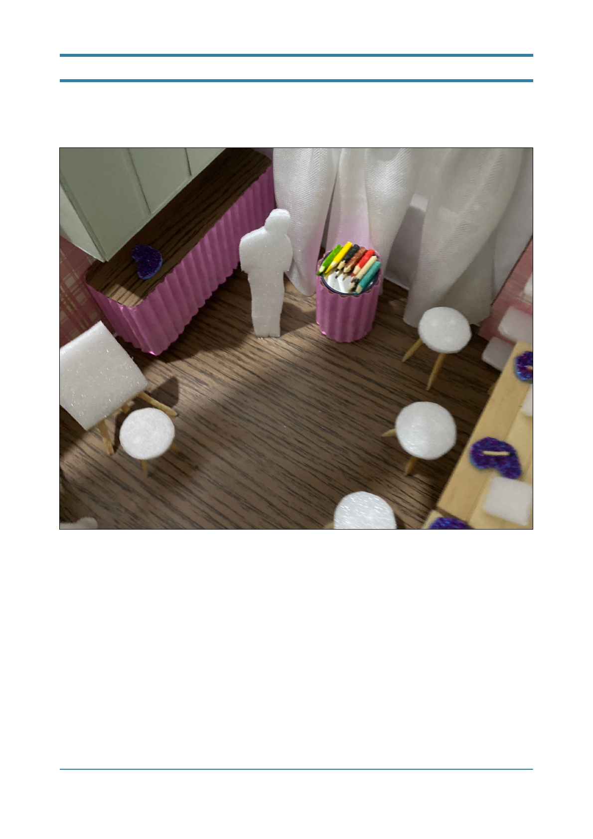 PORTIFÓLIO MAQUETE DE INTERIORES Proposta de projeto Desenvolver uma Maquete de interiores ATELIER DE ARTESANATO DE PINTURA- Ateliê para aulas Preparado para aulas de pinturas para adulto e crianças Preparado por Queren Jemini de Carvalho Santos VISTA DE CIMA Croqui, alinhamento das ideias. Folha A3 Planta baixa 1:25 Parede com mobiliário 1. COLA 2. TESOURA GRANDE E PEQUENA 3. RÉGUA 4. ESCALIMETRO 5. ISQUEIRO 6. TECIDO 7. CARTOLINA QUADRICULADA E VERDE COM BRILHO 8. ISOPOR 9. ISOPOR COM ESPESSURA SUPER FINA 10. COLA BRANCA 11. ESTILETE 12. PALITO DE DENTES 13. PALITO DE PICOLÉ 14. PAPEL CONTATO EFEITO MADEIRA 15. EVA 16. CANETA AZUL 17. LÁPIS GRAFITE 18. LÁPIS HIDROCOR 19. FITA 20. TINTA GUACHE 21. PAPELÃO 22. TAMPA DE BATOM