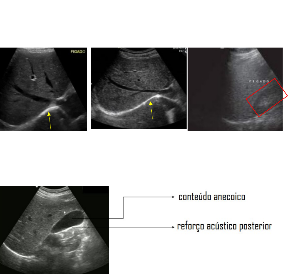 Avaliação imagem- fígado e vias biliares Exames de imagem: - USG, TC e RNM - No raio X não é possível visualizar, independente de ter contraste ou não - Fígado: Porção anecoica: estrutura que tem líquido Apontado pela seta amarela: cápsula de Glisson ou também pode ser uma parte do diafragma Destacado de vermelho: rim (serve de referencial teórico) Vesícula biliar: associação direta com o fígado e com conteúdo anecoico dentro Após estrutura anecoica, existe o reforço posterior (imagem hiperecoica: é um artefato: formação de imagem por característica do método de ultrassom: não necessariamente há uma estrutura mais densa abaixo da vesícula) Em amarelo: vesícula biliar- hipodensa Cirrose: - Fibrose contínua e progressiva como resultado do processo de cicatrização continuada em resposta a diversos agressores - Retrai o fígado de maneira com que ele diminui de tamanho - Fibrose septal: deposição de colágeno no septo. Além de regeneração nodular - Shunt (desvio): . Presença de poros nos sinusóides que facilita o extravasamento de sangue para o hepatócito (ocorre normalmente) - No fígado cirrótico, a fibrose septal faz com que haja colágeno: fecha os poros e o sangue da via porta não cai facilmente no hepatócito e a única forma de permanecer com a função, é pelo desvio para a veia centrolobular (isso por conta da fibrose) - Distorção da arquitetura - A veia centrolobular desemboca por fim na VCI: os metabólitos não passam pelo fígado e caem diretamente na circulação sistêmica: encefalopatia - Hipertensão portal – gera ascite, varizes de esôfago - Fígado cirrótico: . Reduzido de tamanho em etapas mais avançadas . Bordas irregulares . Parênquima heterogêneo: fica hiperecoico . No começo, o fígado fica aumentado por conta da regeneração e depois retrai Sinal indireto de ascite: percorrendo o fígado Fígado irregular: está alongado Baço: na cirrose avançada por ser esplenomegalia (o sangue volta para a veia esplênica- que forma a veia porta, aumenta o baço de tamanho) . No hemograma, pode ter pancitopenia no hemograma (os elementos do sangue ficam represados no baço) Esteatose hepática: - Depósito de gordura no fígado - Álcool e síndrome metabólica são as principais causas - Esteatohepatite alcoólica: a gordura está inflamando no fígado . Diferencia da esteatose, porque nessa tem inflamação . No ultrassom não consegue diferenciar . Lesão hepatocelular: elevação de TGO e TGP (isso não ocorre na esteatose apenas) . Geralmente esses marcadores não elevam muito (2 a 4 vezes o valor de referência). Na esteatose as transaminases ficam normais - Fígado aumentado de tamanho pelo depósito de gordura - Aumento da ecogenicidade - Na clínica é assintomático, geralmente Lesões focais hepáticas: - Lesões císticas Em amarelo: reforço acústico posterior Câncer geralmente não dá lesões císticas Tratamento conservador Cistos: cheio de líquido - Lesões nodulares: Sem reforço acústico posterior: não tem líquido dentro Lesões múltiplas e de dimensões irregulares: metástase Lesão que capta o contraste, mas no centro não: está hipodenso- é uma cicatriz. Crescimento anormal do hepatócito. Lesão benigna. Fator de risco: ACO Crescimento nodular benigno. Deve fazer biópsia para excluir o diagnóstico de metástase Vesícula: - Doença calculosa biliar: . Colelitíase: perda na vesícula biliar (pode ser assintomática). Se aparecer dor, pode ser do tipo cólica: começa tem pico de ação e melhora: não dura mais que 5h (se for mais, já vira colecistite) . Colecistite: inflamação da vesícula biliar: dor em cólica que dura por mais de 5h; Sinal de Murphy (palpação dolorosa no quadrante superior direito) e náuseas, vômitos e febre. Quando passa o efeito do analgésico e não melhora a dor . Coledocolitíase: cálculo na região do colédoco Dor em cólica com mais de 5h; náusea e vômito; icterícia (aumento de BD) e pancreatite (se o cálculo impactar na ampola de vater) · Pode ter icterícia na colecistite também: cai um pouco de bilirrubina na circulação pelos vasos da parede do órgão. . Colangite: inflamação da via biliar por inteiro ( a colecistite é só da vesícula biliar). Risco de dar sepse. É mais grave Pedras quase saindo na vesícula: pode ser sinal de colecistite, mas o mais importante é o espessamento da parede da vesícula (edema na parede) No ultrassom o paciente também sente dor A TC não é o melhor exame para ver cálculo na vesícula (colesterol: mesma densidade da bile). Apesar de que na última imagem dê para ver o cálculo