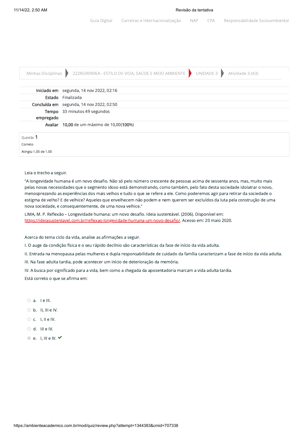 11/14/22, 2:50 AM Atividade 3 (A3): Revisão da tentativa https://ambienteacademico.com.br/mod/quiz/review.php?attempt=1344383&cmid=707338 1/7 Minhas Disciplinas 222RGR0906A - ESTILO DE VIDA, SAÚDE E MEIO AMBIENTE UNIDADE 3 Atividade 3 (A3) Iniciado em segunda, 14 nov 2022, 02:16 Estado Finalizada Concluída em segunda, 14 nov 2022, 02:50 Tempo empregado 33 minutos 49 segundos Avaliar 10,00 de um máximo de 10,00(100%) Questão 1 Correto Atingiu 1,00 de 1,00 Leia o trecho a seguir. “A longevidade humana é um novo desa�o. Não só pelo número crescente de pessoas acima de sessenta anos, mas, muito mais pelas novas necessidades que o segmento idoso está demonstrando, como também, pelo fato desta sociedade idolatrar o novo, menosprezando as experiências dos mais velhos e tudo o que se refere a ele. Como poderemos agir para retirar da sociedade o estigma de velho? E de velhice? Aqueles que envelhecem não podem e nem querem ser excluídos da luta pela construção de uma nova sociedade, e consequentemente, de uma nova velhice.” LIMA, M. P. Re�exão – Longevidade humana: um novo desa�o. Ideia sustentável. (2006). Disponível em: https://ideiasustentavel.com.br/re�exao-longevidade-humana-um-novo-desa�o/. Acesso em: 20 maio 2020. Acerca do tema ciclo da vida, analise as a�rmações a seguir. I. O auge da condição física e o seu rápido declínio são características da fase de início da vida adulta. II. Entrada na menopausa pelas mulheres e dupla responsabilidade de cuidado da família caracterizam a fase de início da vida adulta. III. Na fase adulta tardia, pode acontecer um início de deterioração da memória. IV. A busca por signi�cado para a vida, bem como a chegada da aposentadoria marcam a vida adulta tardia. Está correto o que se a�rma em: a. I e III. b. II, III e IV. c. I, II e IV. d. III e IV. e. I, III e IV. Guia Digital Carreiras e Internacionalização NAP CPA Responsabilidade Socioambiental https://ambienteacademico.com.br/my/ https://ambienteacademico.com.br/course/view.php?id=18293 https://ambienteacademico.com.br/course/view.php?id=18293§ion=5 https://ambienteacademico.com.br/mod/quiz/view.php?id=707338 https://ideiasustentavel.com.br/reflexao-longevidade-humana-um-novo-desafio/ https://codely-fmu-content.s3.amazonaws.com/Moodle/GuiaDigital/Guia+digital/index.html https://informa.fmu.br/carreiras/ https://codely-fmu-content.s3.amazonaws.com/Moodle/NAP/inicial/nap/fmu/index.html https://codely-fmu-content.s3.amazonaws.com/Moodle/CPA/landing_CPA/index.html https://portal.fmu.br/sustentabilidade 11/14/22, 2:50 AM Atividade 3 (A3): Revisão da tentativa https://ambienteacademico.com.br/mod/quiz/review.php?attempt=1344383&cmid=707338 2/7 Questão 2 Correto Atingiu 1,00 de 1,00 “A médica epidemiologista e professora Maria Inês Schmidt, da Universidade Federal do Rio Grande do Sul (UFRGS), por sua vez, tratou deste tema voltado para as doenças não-transmissíveis e seus fatores de risco. De início, ela mostrou o engano que é pensar que doenças crônicas como câncer e cardiopatias são características de países do primeiro mundo. Levantamento recente aponta que mais de 70% dos óbitos por doenças crônicas não-transmissíveis (DCNTs) ocorrem em países de média ou baixa renda.” ESPECIALISTAS debatem o impacto das desigualdades sociais na saúde do Brasil. OPAS, [s. l.]. Com base nas informações apresentadas, avalie as asserções a seguir e a relação proposta entre elas. I. A igualdade é quando as pessoas têm condições iguais de saúde. Logo, II. A equidade promove a igualdade, pois fornece mais atenção aos que mais necessitam. Está correto o que se a�rma em: a. As asserções I e II são proposições verdadeiras, e a II é uma conclusão correta da I. b. A asserção I é uma proposição falsa, e a II é uma proposição verdadeira. c. As asserções I e II são proposições falsas. d. A asserção I é uma proposição verdadeira, e a II é uma proposição falsa. e. As asserções I e II são proposições verdadeiras, mas a II não é uma conclusão correta da I. Guia Digital Carreiras e Internacionalização NAP CPA Responsabilidade Socioambiental https://codely-fmu-content.s3.amazonaws.com/Moodle/GuiaDigital/Guia+digital/index.html https://informa.fmu.br/carreiras/ https://codely-fmu-content.s3.amazonaws.com/Moodle/NAP/inicial/nap/fmu/index.html https://codely-fmu-content.s3.amazonaws.com/Moodle/CPA/landing_CPA/index.html https://portal.fmu.br/sustentabilidade 11/14/22, 2:50 AM Atividade 3 (A3): Revisão da tentativa https://ambienteacademico.com.br/mod/quiz/review.php?attempt=1344383&cmid=707338 3/7 Questão 3 Correto Atingiu 1,00 de 1,00 Questão 4 Correto Atingiu 1,00 de 1,00 As políticas de saúde devem ser pensadas para toda a população. Para isso, a maioria dos governos de saúde possuem políticas especí�cas para determinados grupos populacionais em razão das suas particularidades. No Brasil, por exemplo, temos a política nacional de atenção à saúde do idoso, da criança, da mulher, dentre outras. Sobre os determinantes sociais e seu papel especí�co em cada fase da vida, relacione as colunas a seguir. Pode ter mais de uma ocorrência para cada categoria. (1) Hereditariedade e ambiente (2) Família (3) Imprinting ( ) Forma de aprendizagem baseada no instinto, em que um �lhote estabelece vínculo com a pessoa que mais enxerga. ( ) Formato mosaico, multigeracional ou nuclear. ( ) Histórico genético. ( ) Fatores que aumentam a chance da carga genética ser mais manifestada. ( ) Intervalo de tempo em que é esperado que um evento ocorra para que o desenvolvimento da criança seja adequado. Agora, assinale a opção que apresenta a sequência correta. a. 2 - 3 - 2 - 3 - 1. b. 3 - 2 - 1 - 2 - 3. c. 3 - 2 - 2 - 1 - 1. d. 2 - 3 - 2 - 1 - 3. e. 3 - 2 - 1 - 1 - 3. Veri�car a e�cácia de um programa de avaliação de ações de saúde pública é uma forma de veri�car se essas ações utili
