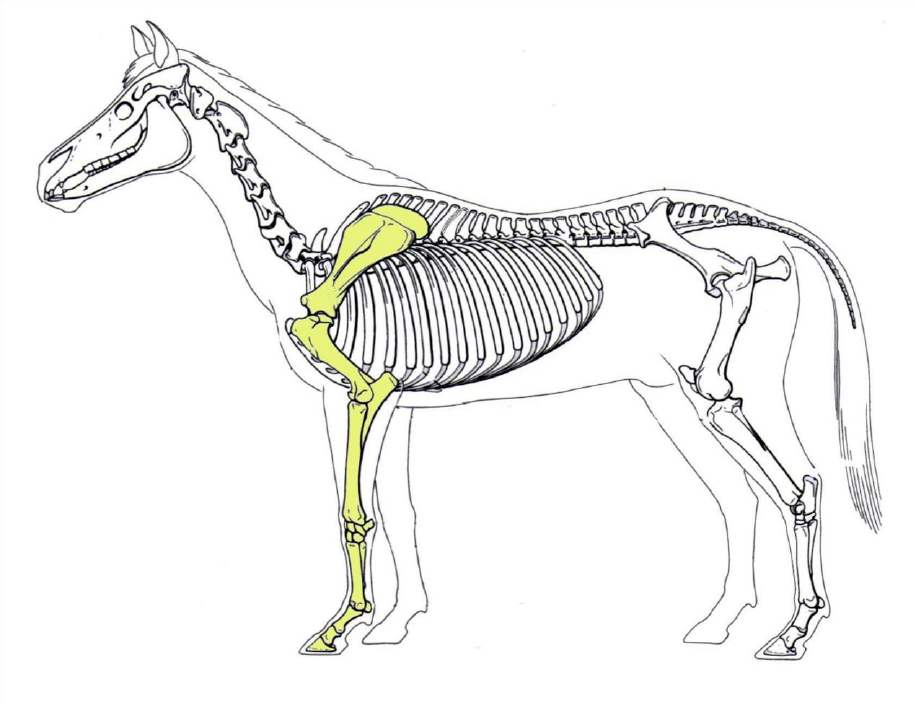 MEMBRO TORÁCICO INTRODUÇÃO Suporta a maior parte do peso corporal, quando em repouso; Amortece impactos (ao aterrissar de um salto). Subdividido em 4 segmentos: Cíngulo/cinturão escapular; Braço; Antebraço; Mão CÍNGULO ESCAPULAR Quando totalmente desenvolvido consta de 3 ossos: Escápula: presente nos animais domésticos Clavícula: ausente nos animais domésticos Coracóide: ausente nos animais domésticos ESCÁPULA Osso plano e triangular; Posicionada obliquamente ao esqueleto; Craniolateralmente no tronco. Apresenta: 2 faces (lateral e medial); 3 bordas (dorsal, cranial e caudal); 3 ângulos (cranial, caudal e ventral); 1 colo. FACE LATERAL Espinha da escápula: Acrômio (ruminantes e carnívoros); Fossa supraespinhosa; Fossa infraespinhosa. FACE MEDIAL Fossa subescapular; Faces serráteis. BORDA DORSAL Cartilagem da escápula. ÂNGULO VENTRAL Amplo, localizado no colo da escápula; articula com o úmero. Acidentes anatômicos: Cavidade glenóide (ponto de contato com a cabeça do úmero); Tubérculo supraglenoideo (saliência na porção mais ventral do angulo); Processo Coracóide: ausente nos suínos (corresponde ao osso coracóide presente em espécies não domésticas). BRAÇO Úmero; Osso longo; Posicionado obliquamente; Distalmente à escápula. DIÁFISE Cilíndrica e retorcida; Lateralmente: Crista do úmero; Tuberosidade deltóide. Medialmente: Tuberosidade redonda maior (ausente nos suínos). EPÍFISE PROXIMAL Cabeça do úmero: caudal; Colo do úmero; Tubérculo maior: lateral; Tubérculo menor: medial; Tubérculo intermediário (só nos eqüinos). EPÍFISE DISTAL Côndilos (lateral e medial); Epicôndilos (lateral e medial); Fossa radial: cranial; Fossa do olécrano: caudal e + profunda. Carnívoros: forame supratroclear= comunicação das fossas radial e do olécrano. ANTEBRAÇO Rádio e Ulna fusionados nos equinos e ruminantes. RÁDIO Osso longo; Posicionado verticalmente; Distalmente ao úmero DIÁFISE Lisa; Levemente encurvada. EPÍFISE PROXIMAL Também denominada “cabeça do rádio”; Circunferência articular; Tuberosidade radial: cranial; Tuberosidade medial; Tuberosidade lateral. EPÍFISE DISTAL Face articular cárpica. ULNA Osso longo; caudolateralmente ao rádio; Equinos: não é totalmente desenvolvida; Suínos: mais volumosa que o rádio. DIÁFISE Lisa e trifacetada; Espaço interósseo do antebraço (duplo nos ruminantes = proximal e distal). EPÍFISE PROXIMAL Olécrano: parte mais desenvolvida do osso; Tuberosidade do olécrano; Processo anconeo; Incisura troclear. EPÍFISE DISTAL Pontiaguda no equino; Processo estilóide (exceto nos equinos). MÃO Subdivide-se em 3 partes: Carpo; Metacarpo; Dígito. CARPO Formado por uma série de ossos curtos dispostos em 2 fileiras, uma proximal e outra distal. FILEIRA PROXIMAL Composta por 4 ossos: Carporradial; Carpointermédio; Carpoulnar; Carpoacessório. FILEIRA DISTAL 1ºcarpiano (pequeno,inconstante, fusionado ao 2º); 2º carpiano (mais medial); 3º carpiano (maior); 4º carpiano (mais lateral). CARPO Ruminantes: 1º carpiano ausente; 2º fusionado ao 3º; Suínos: 1º carpiano presente e não fusionado ao 2º; Carnívoros: carporradial fusionado ao carpointermédio;1º carpiano presente e não fusionado ao 2º. METACARPO Osso longo; Posicionado verticalmente. Número varia de espécie para espécie, de acordo com o número de dígitos. Equinos: 1 grande metacarpo (3º); 2 pequenos metacarpos (2º e 4º). Palmarmente ao grande metacarpo. Ruminantes: 2 grandes metacarpos fusionados ( 3º e 4º); 1 pequeno metacarpo (5º). Suínos: 2 grandes metacarpos (3º e 4º); 2 pequenos metacarpos (2º e 5º). Carnívoros: 4 grandes metacarpos (2º, 3º, 4º e 5º); 1 pequeno metacarpo (1º). DÍGITOS Variam em número nas espécies: Equino = 1 dígito (3º). Formado por: 3 falanges: proximal, média e distal; 3 ossos sesamóides: 2 proximais e 1 distal. FALANGE PROXIMAL Osso longo; Posicionada obliquamente; FALANGE MÉDIA Osso curto; Posicionada obliquamente; Processo do extensor. FALANGE DISTAL Osso irregular; Envolta pelo casco; Processo do extensor; Área flexora. SESAMÓIDES PROXIMAIS Ossos curtos; Entre o grande metacarpo e a falange proximal, pela face palmar. SESAMÓIDE DISTAL “Osso navicular”; Osso curto e largo; Situado entre a falange média e a distal, pela face palmar.