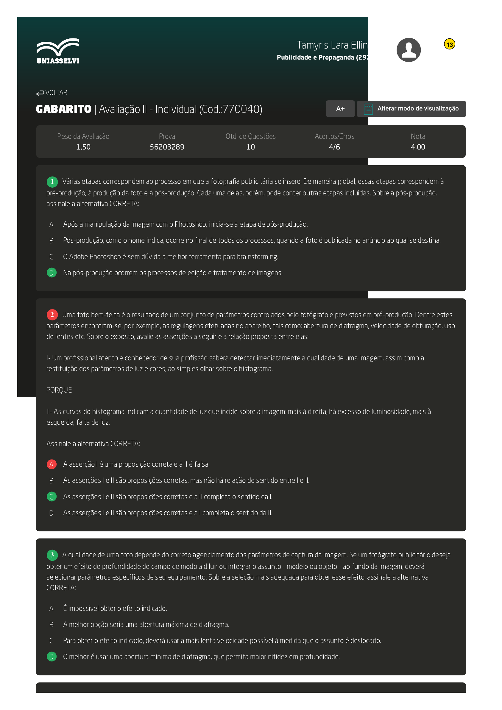15/11/2022 17:50 AVA https://ava2.uniasselvi.com.br/subject/grades-and-tests/answer-book/eyJ0ZXN0Ijp7InRlc3RDb2RlIjoiNzcwMDQwIiwiZGVzY3JpcHRpb24iOiJBdmFsaWHDp8OjbyBJSSAtIEluZGl2aWR1YWwiLCJwYXJhbWV0ZXIiOjU… 1/3 GABARITO | Avaliação II - Individual (Cod.:770040) Peso da Avaliação 1,50 Prova 56203289 Qtd. de Questões 10 Acertos/Erros 4/6 Nota 4,00 Várias etapas correspondem ao processo em que a fotografia publicitária se insere. De maneira global, essas etapas correspondem à pré-produção, à produção da foto e à pós-produção. Cada uma delas, porém, pode conter outras etapas incluídas. Sobre a pós-produção, assinale a alternativa CORRETA: A Após a manipulação da imagem com o Photoshop, inicia-se a etapa de pós-produção. B Pós-produção, como o nome indica, ocorre no final de todos os processos, quando a foto é publicada no anúncio ao qual se destina. C O Adobe Photoshop é sem dúvida a melhor ferramenta para brainstorming. D Na pós-produção ocorrem os processos de edição e tratamento de imagens. Uma foto bem-feita é o resultado de um conjunto de parâmetros controlados pelo fotógrafo e previstos em pré-produção. Dentre estes parâmetros encontram-se, por exemplo, as regulagens efetuadas no aparelho, tais como: abertura de diafragma, velocidade de obturação, uso de lentes etc. Sobre o exposto, avalie as asserções a seguir e a relação proposta entre elas: I- Um profissional atento e conhecedor de sua profissão saberá detectar imediatamente a qualidade de uma imagem, assim como a restituição dos parâmetros de luz e cores, ao simples olhar sobre o histograma. PORQUE II- As curvas do histograma indicam a quantidade de luz que incide sobre a imagem: mais à direita, há excesso de luminosidade, mais à esquerda, falta de luz. Assinale a alternativa CORRETA: A A asserção I é uma proposição correta e a II é falsa. B As asserções I e II são proposições corretas, mas não há relação de sentido entre I e II. C As asserções I e II são proposições corretas e a II completa o sentido da I. D As asserções I e II são proposições corretas e a I completa o sentido da II. A qualidade de uma foto depende do correto agenciamento dos parâmetros de captura da imagem. Se um fotógrafo publicitário deseja obter um efeito de profundidade de campo de modo a diluir ou integrar o assunto - modelo ou objeto - ao fundo da imagem, deverá selecionar parâmetros específicos de seu equipamento. Sobre a seleção mais adequada para obter esse efeito, assinale a alternativa CORRETA: A É impossível obter o efeito indicado. B A melhor opção seria uma abertura máxima de diafragma. C Para obter o efeito indicado, deverá usar a mais lenta velocidade possível à medida que o assunto é deslocado. D O melhor é usar uma abertura mínima de diafragma, que permita maior nitidez em profundidade. VOLTAR A+ Alterar modo de visualização 1 2 3 Tamyris Lara Ellingson Publicidade e Propaganda (2975055) 13 15/11/2022 17:50 AVA https://ava2.uniasselvi.com.br/subject/grades-and-tests/answer-book/eyJ0ZXN0Ijp7InRlc3RDb2RlIjoiNzcwMDQwIiwiZGVzY3JpcHRpb24iOiJBdmFsaWHDp8OjbyBJSSAtIEluZGl2aWR1YWwiLCJwYXJhbWV0ZXIiOjU… 2/3 A técnica da fotografia demanda domínio sobre alguns comandos do aparelho, bem como sobre parâmetros que determinam uma captura de imagem ideal. Para isso, toda máquina fotográfica profissional apresenta alternativas de captura que visam, basicamente, ao equilíbrio entre três fatores decisivos para a qualidade e os efeitos desejados para a foto. Sobre o exposto, assinale a alternativa CORRETA: A Luz, velocidade e regulagem de maior ou menor abertura do diafragma determinam a qualidade das fotos. B A quantidade de luz não interfere nos resultados que se deseja obter, apenas a velocidade de obturação. C O diafragma não interfere no resultado obtido durante a captura da imagem. D Luz e regulagem do diafragma determinam a qualidade das fotos obtidas. Há três grandes fatores que orientam a realização de uma fotografia: o fotógrafo, o tema escolhido ou visado e a técnica utilizada para a obtenção da foto. Como elemento humano que age sobre os parâmetros da captura a ser efetuada, o fotógrafo possui uma posição especial. Diante disso, classifique V para as sentenças verdadeiras e F para as falsas: ( ) O fotógrafo publicitário idealiza a foto que vai tirar e, para isso, aproveita o instante decisivo. ( ) A fotografia publicitária é resultado de decisões tomadas pelo fotógrafo e a agência. ( ) O fotógrafo pode determinar a temática apenas ao manipular a técnica. ( ) O fotógrafo é manipulado pela técnica, que é ilimitada. Assinale a alternativa que apresenta a sequência CORRETA: A V - F - F - V. B F - F - F - V. C V - V - F - F. D F - V - V - F. A sociedade fornece um manancial de temas e assuntos que podem ser explorados na área da fotografia publicitária. Cabe aos profissionais das áreas de publicidade e fotografia publicitária estar atentos ao ambiente em que exercem suas práticas. Observar o entorno, seja no espaço ou no tempo, permite perceber os anseios, modos de ver o mundo, experiências e sensações vigentes. Sobre o exposto, associe os itens, utilizando o código a seguir: I- Brainstorming. II- Edição de imagem. III- Sessão de captura ou tomada de fotos. IV- Tratamento de imagem. ( ) Esta etapa segue imediatamente a realização das fotos. ( ) Nesta etapa já são concretizados aspectos previstos nos objetivos gerais. ( ) Esta etapa compreende associações, comparações, idealização de efeitos plausíveis e possíveis. ( ) Eventuais correções que ainda sejam necessárias são realizadas nesta etapa. Assinale a alternativa que apresenta a sequência CORRETA: A I - III - IV - II. B I - IV - II - III. C II - III - I - IV. D III - II - I - I. Quando foi inventada ou descoberta, a fotografia consistia em um princípio físico da natureza. Segundo esse princípio, a imagem se forma a partir do en