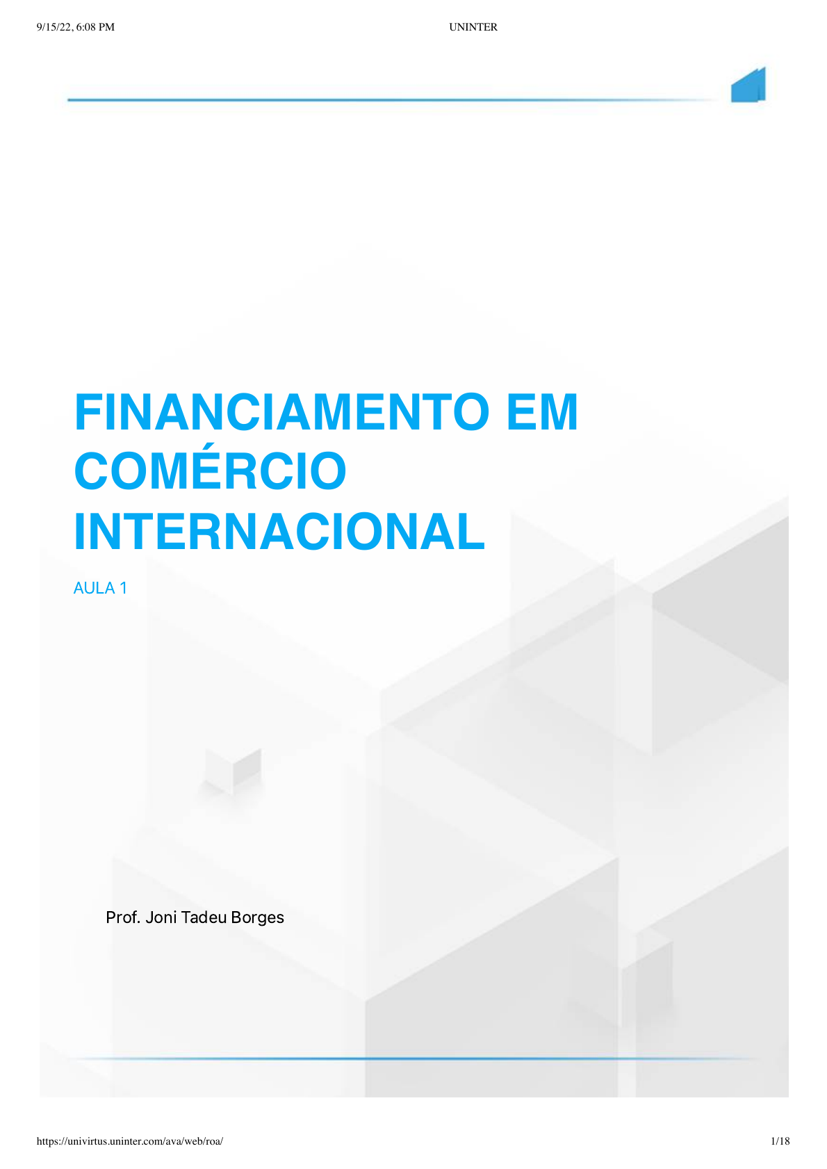 9/15/22, 6:08 PM UNINTER https://univirtus.uninter.com/ava/web/roa/ 1/18 FINANCIAMENTO EM COMÉRCIO INTERNACIONAL AULA 1 Prof. Joni Tadeu Borges 9/15/22, 6:08 PM UNINTER https://univirtus.uninter.com/ava/web/roa/ 2/18 CONVERSA INICIAL É muito comum e necessário que as empresas recorram às instituições financeiras em busca de recursos para manter ou expandir suas atividades comerciais e industriais. Portanto, a nossa conversa estará pautada nos diversos tipos de financiamentos, identificadas as aplicabilidades e características de cada um. São operações financeiras totalmente vinculadas às operações comerciais de exportação e importação. E é o gestor da empresa que decide se faz ou não um financiamento, e para decidir, é preciso ser subsidiado com informações corretas. Desta maneira, os profissionais envolvidos devem ter o conhecimento amplo sobre os temas ligados ao comércio exterior para apresentar à diretoria da empresa e os fatos relevantes para a contratação do financiamento. Os financiamentos envolvem riscos para o financiador (banco) e para o exportador ou importador (clientes). O banco tem instrumentos e expertise para proteger os seus ativos. Já as empresas, nem todas apresentam condições de avaliar uma situação de risco, principalmente as pequenas. Relacionaremos alguns tipos de riscos presentes nas operações de financiamentos, sejam eles para o banco ou para o cliente. Bons estudos! CONTEXTUALIZANDO São muitos os fatores envolvidos na contratação do financiamento ao comércio exterior. Começando pelo planejamento, mesmo antes da empresa receber o crédito, até o efetivo pagamento da dívida. Primeiro, vamos saber porque a empresa precisa do financiamento e como ela pode usar os recursos. Em seguida, apresentaremos temas relacionados ao comércio exterior que devem ser de conhecimento dos profissionais envolvidos na contratação de um financiamento. O terceiro tópico apresenta uma visão geral sobre a análise de crédito do cliente, o banco avalia se o cliente tem ou não condições de pagar a dívida nos prazos estabelecidos. E os dois tópicos, importantíssimos, são sobre os riscos envolvidos nas operações de financiamentos, riscos avaliados pelo banco na análise de crédito. Mesmo o banco tendo a responsabilidade de avaliar os 9/15/22, 6:08 PM UNINTER https://univirtus.uninter.com/ava/web/roa/ 3/18 riscos, o cliente também deve se preocupar em entendê-los para traçar suas estratégias financeiras. TEMA 1 – INTRODUÇÃO AO FINANCIAMENTO AO COMÉRCIO EXTERIOR As empresas participantes do comércio exterior brasileiro também sentem o impacto econômico interno e externo causado em suas atividades produtivas e comerciais. Um cenário pessimista no mercado interno, no qual a taxa de juros e o índice inflação são altos, fatores que provocam a perda do poder de compra do consumidor e levam o empresário a reajustar os preços dos produtos devido ao aumento de todos os custos nos processos de produção, transporte e comercialização. No ambiente externo, acrescentam-se a alta da taxa de juros de outros países, a alta do preço do petróleo, pandemia, guerras que impactam negativamente o mercado global e atingem diretamente os negócios das empresas brasileiras com outros países. Desta maneira, fatores internos e externos desfavoráveis provocam um desaquecimento no comércio global impactando diretamente as empresas brasileiras. Por outro lado, quando o mundo convive dentro de um cenário otimista, as empresas procuram expandir suas atividades: comprar mais matéria-prima, modernizar o parque fabril, adquirir novas tecnologias, contratar mão de obra e consequentemente aumentar as vendas. Tanto no cenário pessimista como no otimista, as empresas precisam de recursos para se manter ou crescer no mercado. Recursos que podem ser obtidos por meio de empréstimos ou financiamentos no Brasil ou no exterior. No comércio exterior, as empresas brasileiras participantes das compras ou vendas de produtos e serviços com outros países têm à disposição várias linhas de financiamentos ofertadas pelas instituições financeiras. Vale destacar a diferença entre financiamento e empréstimo. O financiamento é uma linha de crédito que apresenta uma finalidade específica. Já os recursos obtidos por meio de um empréstimo, podem ser utilizados para qualquer finalidade. 9/15/22, 6:08 PM UNINTER https://univirtus.uninter.com/ava/web/roa/ 4/18 Os financiamentos ao comércio exterior são específicos para empresas exportadoras e importadoras alavancarem os seus negócios internacionais. Os financiamentos ao comércio exterior proporcionam para o tomador do crédito vantagens financeiras e adequação ao fluxo de caixa. Mesmo com os vários problemas estruturais existentes no país e as influências externas que afetam diretamente a economia, fatores considerados relevantes para qualquer nação, o Brasil continua sendo um player no mercado internacional. Tabela 1 – Balança comercial Brasil ANO US$ FOB EXP US$ FOB IMP SALDO US$ FOB CORRENTE US$ FOB 2021 280.814.577.460 219.408.049.180 61.406.528.280 500.222.626.640 2020 209.180.241.655 158.786.824.879 50.393.416.776 367.967.066.534 2019 221.126.807.647 185.927.967.580 35.198.840.067 407.054.775.227 2018 231.889.523.399 185.321.983.502 46.567.539.897 417.211.506.901 Fonte: Brasil, 2022. A Tabela 1 apresenta quatro anos de comércio exterior brasileiro. Analisando o ano de 2021, o Brasil exportou US$ 280,8 bilhões e importou US$ 219,4 bilhões, obtendo um superávit de US$ 61,4 bilhões. A soma das exportações com as importações, denominada corrente de comércio, foi de US$ 500,2 bilhões. Por trás de todos os números apresentados, há milhares de empresas, desde as pequenas às grandes, que utilizam o financiamento ao comércio exterior. Contudo, como se trata de recursos obtidos de terceiros, é necessário que o profissional esteja preparado para saber qual tipo de financiam
