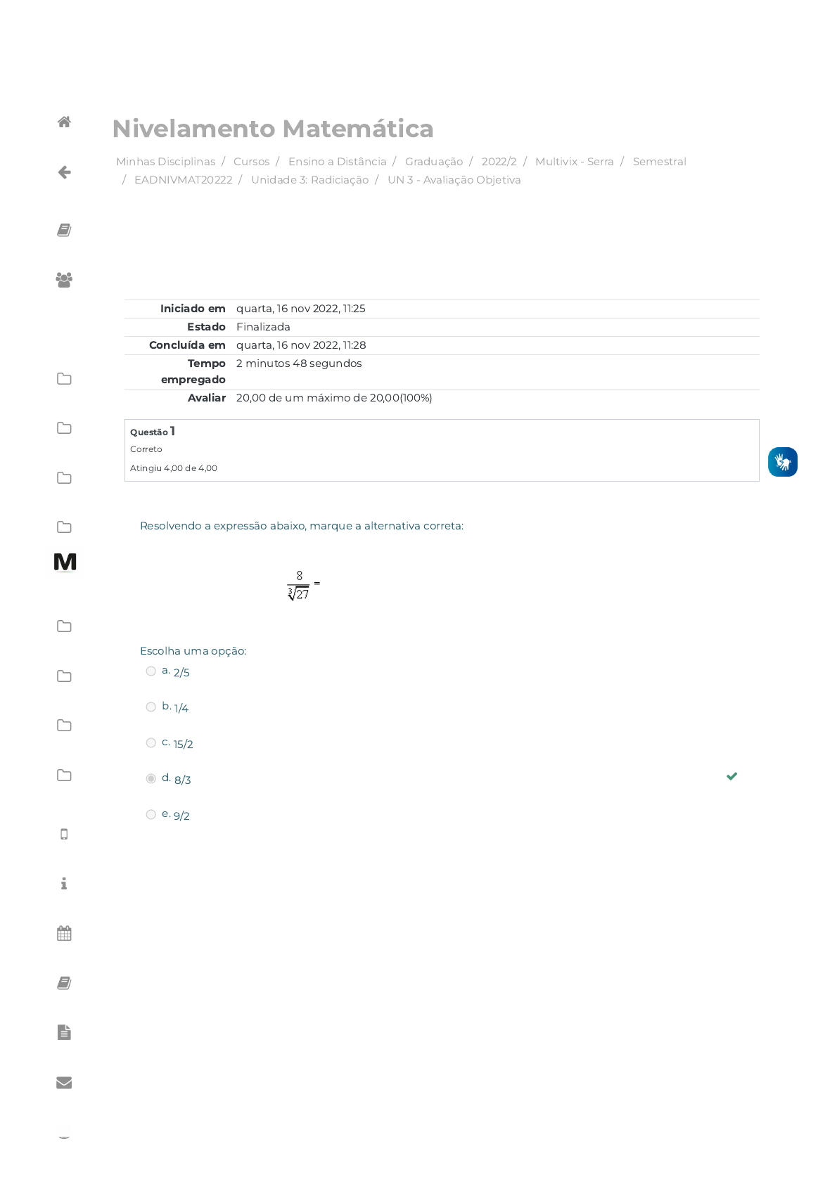 16/11/2022 11:28 UN 3 - Avaliação Objetiva: Revisão da tentativa https://avap.multivix.edu.br/mod/quiz/review.php?attempt=2288976&cmid=1104895 1/4 Minhas Disciplinas / Cursos / Ensino a Distância / Graduação / 2022/2 / Multivix - Serra / Semestral / EADNIVMAT20222 / Unidade 3: Radiciação / UN 3 - Avaliação Objetiva Nivelamento Matemática Iniciado em quarta, 16 nov 2022, 11:25 Estado Finalizada Concluída em quarta, 16 nov 2022, 11:28 Tempo empregado 2 minutos 48 segundos Avaliar 20,00 de um máximo de 20,00(100%) Questão 1 Correto Atingiu 4,00 de 4,00 Resolvendo a expressão abaixo, marque a alternativa correta: Escolha uma opção: a. 2/5 b. 1/4 c. 15/2 d. 8/3  e. 9/2                     https://avap.multivix.edu.br/my/ https://avap.multivix.edu.br/course/index.php https://avap.multivix.edu.br/course/index.php?categoryid=68 https://avap.multivix.edu.br/course/index.php?categoryid=69 https://avap.multivix.edu.br/course/index.php?categoryid=215 https://avap.multivix.edu.br/course/index.php?categoryid=216 https://avap.multivix.edu.br/course/index.php?categoryid=220 https://avap.multivix.edu.br/course/view.php?id=15580 https://avap.multivix.edu.br/course/view.php?id=15580§ion=4 https://avap.multivix.edu.br/mod/quiz/view.php?id=1104895 https://avap.multivix.edu.br/my/ https://avap.multivix.edu.br/course/view.php?id=15580 https://avap.multivix.edu.br/user/index.php?id=15580 https://avap.multivix.edu.br/course/view.php?id=15580§ion=1 https://avap.multivix.edu.br/course/view.php?id=15580§ion=2 https://avap.multivix.edu.br/course/view.php?id=15580§ion=3 https://avap.multivix.edu.br/course/view.php?id=15580§ion=4 https://avap.multivix.edu.br/course/view.php?id=15580§ion=5 https://avap.multivix.edu.br/course/view.php?id=15580§ion=6 https://avap.multivix.edu.br/course/view.php?id=15580§ion=7 https://avap.multivix.edu.br/course/view.php?id=15580§ion=8 https://avap.multivix.edu.br/course/view.php?id=15580§ion=9 https://avap.multivix.edu.br/hooks/portal/ https://avap.multivix.edu.br/mod/page/view.php?id=1252%2F%22%20target%3D%22_blank https://avap.multivix.edu.br/calendar/view.php/ https://avap.multivix.edu.br/local/staticpage/view.php?page=biblioteca https://portalweb.multivix.edu.br/gabaritos/login.aspx https://multivix.edu.br/office-365/ https://multivix.edu.br/acessibilidade/ https://avap.multivix.edu.br/ 16/11/2022 11:28 UN 3 - Avaliação Objetiva: Revisão da tentativa https://avap.multivix.edu.br/mod/quiz/review.php?attempt=2288976&cmid=1104895 2/4 Questão 2 Correto Atingiu 4,00 de 4,00 Questão 3 Correto Atingiu 4,00 de 4,00 Resolvendo a expressão abaixo, marque a alternativa correta: Escolha uma opção: a. ∛3 b.  c. ∛4 d. 2 e. ∛5 2 –√3 Resolvendo a expressão abaixo, marque a alternativa correta: Escolha uma opção: a. 3  b. 4 c. 2 d. 5 e. 1                     https://avap.multivix.edu.br/my/ https://avap.multivix.edu.br/course/view.php?id=15580 https://avap.multivix.edu.br/user/index.php?id=15580 https://avap.multivix.edu.br/course/view.php?id=15580§ion=1 https://avap.multivix.edu.br/course/view.php?id=15580§ion=2 https://avap.multivix.edu.br/course/view.php?id=15580§ion=3 https://avap.multivix.edu.br/course/view.php?id=15580§ion=4 https://avap.multivix.edu.br/course/view.php?id=15580§ion=5 https://avap.multivix.edu.br/course/view.php?id=15580§ion=6 https://avap.multivix.edu.br/course/view.php?id=15580§ion=7 https://avap.multivix.edu.br/course/view.php?id=15580§ion=8 https://avap.multivix.edu.br/course/view.php?id=15580§ion=9 https://avap.multivix.edu.br/hooks/portal/ https://avap.multivix.edu.br/mod/page/view.php?id=1252%2F%22%20target%3D%22_blank https://avap.multivix.edu.br/calendar/view.php/ https://avap.multivix.edu.br/local/staticpage/view.php?page=biblioteca https://portalweb.multivix.edu.br/gabaritos/login.aspx https://multivix.edu.br/office-365/ https://multivix.edu.br/acessibilidade/ https://avap.multivix.edu.br/ 16/11/2022 11:28 UN 3 - Avaliação Objetiva: Revisão da tentativa https://avap.multivix.edu.br/mod/quiz/review.php?attempt=2288976&cmid=1104895 3/4 Questão 4 Correto Atingiu 4,00 de 4,00 Questão 5 Correto Atingiu 4,00 de 4,00 Resolvendo a expressão abaixo, marque a alternativa correta: Escolha uma opção: a. 10 b. 2  c. 6 d. 8 e. 4 Considere as seguintes expressões: I. II III. É (são) verdadeira(s), somente: Escolha uma opção: a. I e II b. I c. II  d. I e III e. III ◄ Unidade 3 - Vídeo 03 Seguir para... Unidade 4 - Vídeo 01 ►                     https://avap.multivix.edu.br/mod/page/view.php?id=1104894&forceview=1 https://avap.multivix.edu.br/mod/page/view.php?id=1104896&forceview=1 https://avap.multivix.edu.br/my/ https://avap.multivix.edu.br/course/view.php?id=15580 https://avap.multivix.edu.br/user/index.php?id=15580 https://avap.multivix.edu.br/course/view.php?id=15580§ion=1 https://avap.multivix.edu.br/course/view.php?id=15580§ion=2 https://avap.multivix.edu.br/course/view.php?id=15580§ion=3 https://avap.multivix.edu.br/course/view.php?id=15580§ion=4 https://avap.multivix.edu.br/course/view.php?id=15580§ion=5 https://avap.multivix.edu.br/course/view.php?id=15580§ion=6 https://avap.multivix.edu.br/course/view.php?id=15580§ion=7 https://avap.multivix.edu.br/course/view.php?id=15580§ion=8 https://avap.multivix.edu.br/course/view.php?id=15580§ion=9 https://avap.multivix.edu.br/hooks/portal/ https://avap.multivix.edu.br/mod/page/view.php?id=1252%2F%22%20target%3D%22_blank https://avap.multivix.edu.br/calendar/view.php/ https://avap.multivix.edu.br/local/staticpage/view.php?page=biblioteca https://portalweb.multivix.edu.br/gabaritos/login.aspx https://multivix.edu.br/office-365/ https://multivix.edu.br/acessibilidade/ https://avap.multivix.edu.br/ 16/11/2022 11:28 UN 3 - Avaliação Objetiva: Revisão da tentativa https://avap.multivix.edu.br/mod/quiz/review.php?attempt=2288976&cmid=1104895 4/4                     https://avap.multivix.edu.br/my/ https://avap.multivix.edu.br/course/view.php?id=15580 ht