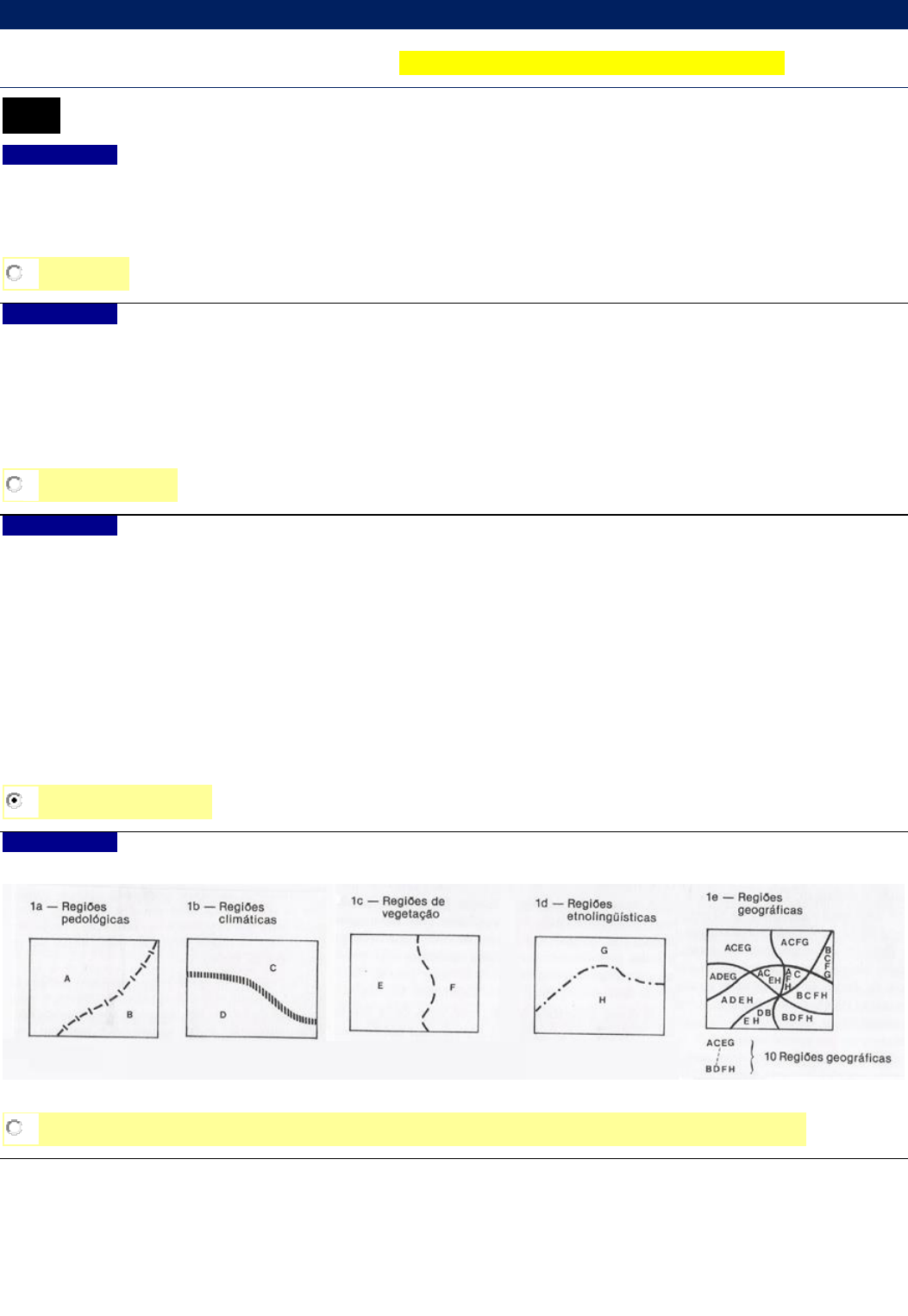 REGIONALIZAÇÃO DO BRASIL Cruzeiro do Sul Virtual – Geografia (2022) SilCBenevides AS-I PERGUNT A Sandra Lencione (2003), no livro Região e Geografia, afirma que: “A identidade dos homens com a região se tornou um problema central na Geografia Regional e Armand Frémont (1976), em sua obra La Region Espace Vecú, considera região como espaço vivido”. Tais afirmações revelam região como foco da escola geográfica de inspiração mais simbólica denominada: Humanista PERGUNT A Leia o texto a seguir. “A região pode ser vista como um resultado da lei do desenvolvimento desigual e combinado, caracterizada pela sua inserção na divisão nacional e internacional do trabalho e pelas relações de produção distintas [...] dos embates que se estabelecem entre as elites regionais e o capital externo à região e dos conflitos entre as diferentes classes que compõem a região” (CORRÊA, 1991, p. 45) Assinale a alternativa correspondente à abordagem geográfica associada à concepção de região apresentada no texto. Geografia Crítica PERGUNT A Leia com atenção a afirmação a seguir e responda ao que se pede. Segundo Haesbaert, no atual período da globalização, o conceito de região torna-se mais complexo e não há consenso sobre a existência da região ou não. Considerando o que se estudou na disciplina, pode-se afirmar que I- a região, com o processo de globalização, desaparece, porque o mundo, hoje, é global e homogêneo; II- se há um predomínio dos processos globais na economia e na informação, é certo também que ainda há heterogeneidades, fragmentações do espaço, regionalismos e regionalidades. III- há consenso de que não existe mais necessidade de usar a categoria região; basta tratar de espaço e território e, a partir dessas categorias, estudar Geografia. Está(ão) correta(s): apenas a afirmação II PERGUNT A Observe os esquemas abaixo. Esses esquemas caracterizam região segundo: a Geografia Possibilista e os esquemas representam as regiões propostas por Vidal de La Blache REGIONALIZAÇÃO DO BRASIL Cruzeiro do Sul Virtual – Geografia (2022) SilCBenevides AS-II PERGUNT A O geógrafo Pedro Pinchas Geiger, em 1967, propôs a divisão regional do Brasil em complexos regionais, que se tornou conhecida como regiões geoeconômicas. Sobre essas regiões, assinale a alternativa correta: A divisão regional proposta são três: Amazônia, Nordeste e Centro-Sul, baseando-se em aspectos históricos, econômicos e culturais. PERGUNT A Os geógrafos Milton Santos e Maria Laura Silveira propuseram uma nova forma de divisão regional do Brasil. Assinale a alternativa correta: A proposta dos autores divide o Brasil em “quatro brasis”, a saber: Amazônia, Centro-Oeste, Nordeste e Região Concentrada. PERGUNT A Trata-se de uma área individualizada em uma Unidade da Federação que apresenta formas de organização do espaço geográfico definidas pelas seguintes dimensões: o processo social como determinante, o quadro natural como condicionante e a rede de comunicação e de lugares como elemento de articulação espacial. Essas três dimensões possibilitam que o espaço delimitado dessa forma tenha uma identidade regional. Trata-se da definição dada pelo IBGE para: As mesorregiões. PERGUNT A Sobre as divisões propostas para o Brasil pelo IBGE, assinale a alternativa INCORRETA: Atualmente o Brasil é dividido em macrorregiões, são elas: Amazônia Legal, Nordeste e Centro-Sul. AS-III PERGUNT A Sobre a definição da região Amazônica é verdadeiro afirmar que: I - Atualmente, os estados que compõem a Amazônia Legal são: Acre, Amapá, Amazonas, Mato Grosso, Pará, Rondônia, Roraima, Tocantins e parte do Maranhão (oeste do meridiano 44˚). II - Para Milton Santos a região Amazônica é formada exclusivamente pelos estados da região Norte, definida pelo IBGE. III - Só existe uma forma de definir a região amazônica, que tem relação com a área ocupada pela floresta amazônica. Estão corretas: Apenas I PERGUNT A Leia as assertivas a seguir sobre o período dos governos militares em relação às políticas públicas para a Amazônia: I- A abertura da polêmica rodovia Transamazônica – cujas diretrizes eram a criação de facilidades de acesso às áreas em condições de exploração econômica e às faixas de solos mais favoráveis à implantação e desenvolvimento da agropecuária – simbolizava o gigantismo intrínseco à ideia do “Brasil potência” desenhada pelos mentores do plano geopolítico do governo militar. II- Eram vistas como soluções para reforçar a influência brasileira na região por meio de um maior povoamento e integração com o coração da economia brasileira. Sobre as afirmações assinale a alternativa correta: Ambas estão corretas. REGIONALIZAÇÃO DO BRASIL Cruzeiro do Sul Virtual – Geografia (2022) SilCBenevides PERGUNT A Sobre a região Leste-Sudeste do Pará, na região Amazônica, é verdadeiro afirmar que: I- Esta região é mais dotada de densidade técnica, com rodovias, portos e ferrovias que visam a facilitar o transporte de mercadorias da região, tendo como a principal centralidade a cidade de Marabá. II- Há também a maior usina hidroelétrica totalmente nacional que é Tucuruí, situada no rio Tocantins, no município de Tucuruí no sudeste do Pará. III- É uma região com pouca densidade técnica, e tem na agricultura de subsistência a principal atividade econômica, não possuindo, portanto, problemas ambientais. Estão corretas: Apenas I e II PERGUNT A Preencha as lacunas: Já na porção _______________ do Estado do Pará a dinâmica territorial está ainda muito atrelada aos rios, ao regime fluvial, do rio Tapajós e Rio Amazonas. Desse modo, nesta região inserida na mesorregião do Baixo Amazonas, cuja principal centralidade é a cidade de _______________ há inúmeras empresas de __________________ e do agronegócio que se apropriam dos portos existentes em detrimen