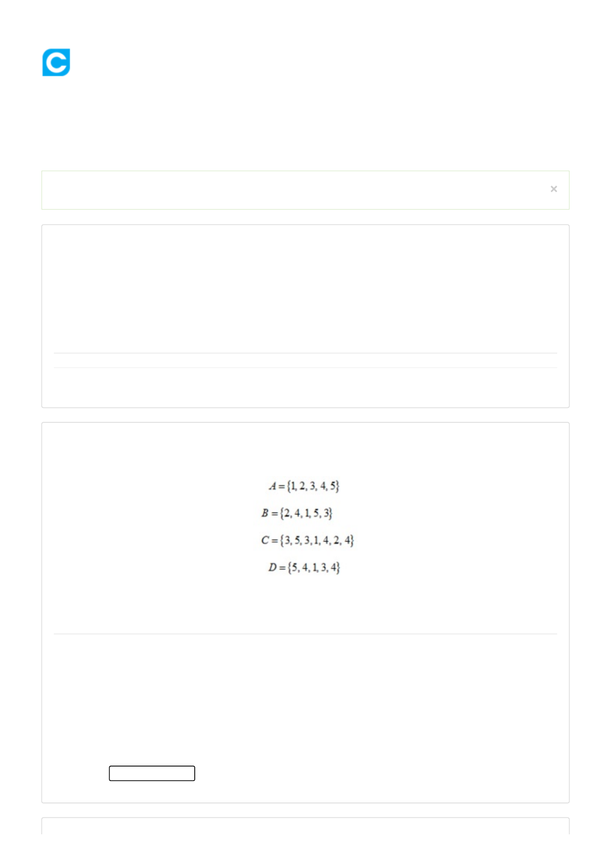 16/11/22, 18:17 Colaborar - Av - Subst. 2 - Raciocínio Lógico Matemático https://colaboraread.com.br/aluno/avaliacao/index/3426533201?atividadeDisciplinaId=13412734 1/3 Raciocínio Lógico Matemático (/aluno/timeli… Av - Subst. 2 - Raciocínio Lógico Matemático Sua avaliação foi confirmada com sucesso (/notific × Informações Adicionais Período: 15/11/2022 00:00 à 19/11/2022 23:59 Situação: Cadastrado Pontuação: 1500 Protocolo: 809888466 Avaliar Material 1) a) b) c) d) e) Texto base: Considere os conjuntos a seguir: Podemos considerar como conjuntos iguais: Alternativas: A e B. D e C. B e C. B e D. A, B e C. Alternativa assinalada https://colaboraread.com.br/aluno/timeline/index/3426533201?ofertaDisciplinaId=1859089 https://colaboraread.com.br/notificacao/index javascript:void(0); 16/11/22, 18:17 Colaborar - Av - Subst. 2 - Raciocínio Lógico Matemático https://colaboraread.com.br/aluno/avaliacao/index/3426533201?atividadeDisciplinaId=13412734 2/3 2) a) b) c) d) e) 3) a) b) c) d) e) 4) Texto base: Considere as seguintes afirmações: I. Existem conjuntos com um número finito e outros com um número infinito de elementos. II. Conjuntos são formados somente por elementos indivisíveis, não podendo ser formados por outros conjuntos. III. Dois conjuntos são considerados iguais se possuem os mesmos elementos. Podemos considerar corretas somente as afirmações: Alternativas: I. II. III. I e III. Alternativa assinalada I e II. Texto base: Alternativas: Alternativa assinalada Texto base: 16/11/22, 18:17 Colaborar - Av - Subst. 2 - Raciocínio Lógico Matemático https://colaboraread.com.br/aluno/avaliacao/index/3426533201?atividadeDisciplinaId=13412734 3/3 a) b) c) d) e) 5) a) b) c) d) e) Alternativas: {..., -3, -2, -1, 0} {..., -3, -2, -1} Alternativa assinalada {..., -3, -2, -1, 0, 1, 2, 3, ...} {0, 1, 2, 3, 4, ...} {1, 2, 3, 4, ...} Texto base: Considere os pontos A(2, -6) e B(-1, 1). De acordo com suas coordenadas, podemos dizer que eles estão localizados, respectivamente, nos quadrantes: Alternativas: 2º e 4º. 2º e 1º. 4º e 2º. Alternativa assinalada 3º e 4º. 1º e 3º.