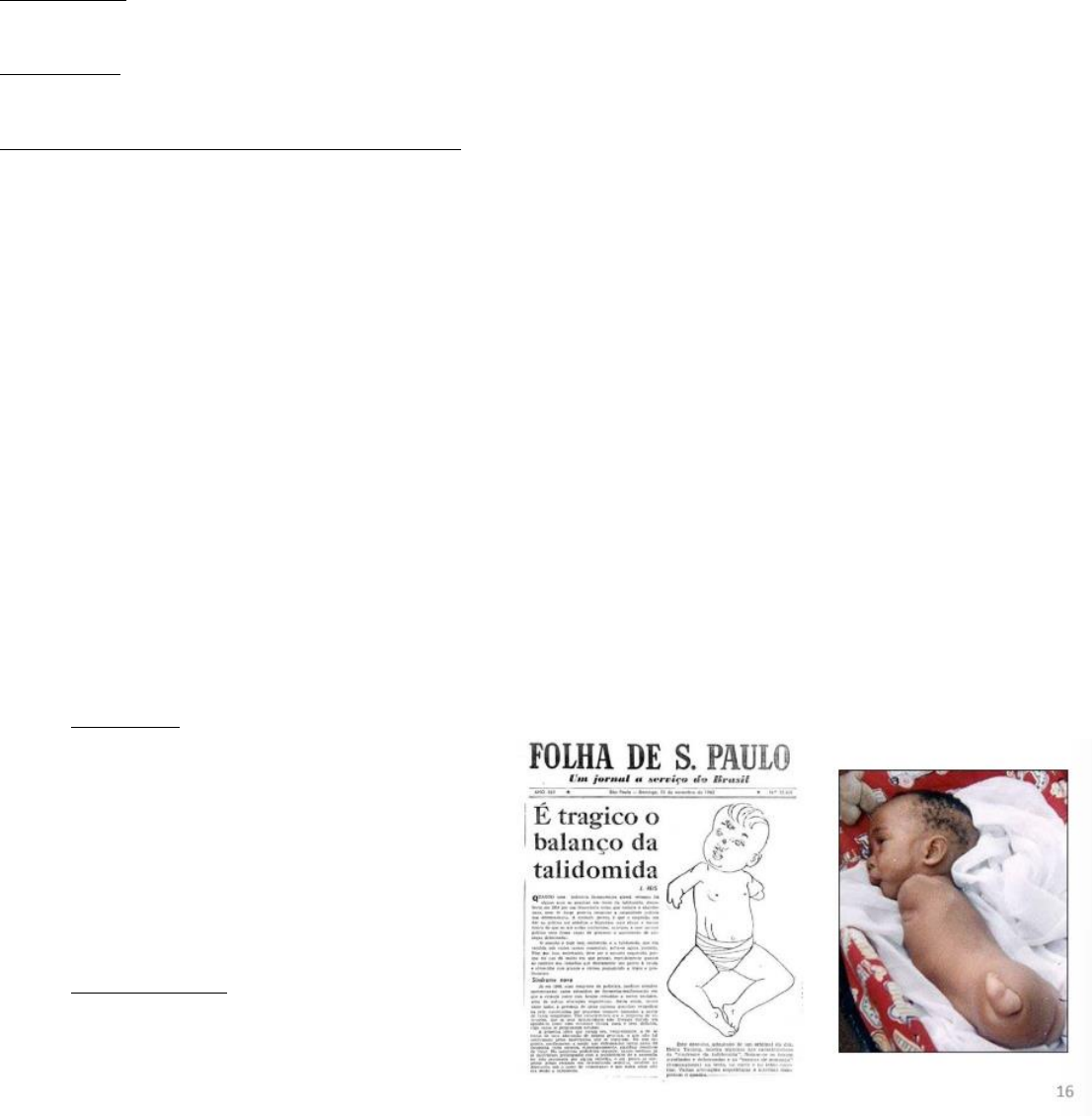 Embriologia II – Teratologia Conceitos gerais • Herança genética • Meio intrauterino • Meio ambiente ➔ Resultam em um desenvolvimento anormal ou normal Teratologia: estudo das malformações congênitas, suas manifestações e incidência e os mecanismos do desenvolvimento pré-natal anormal Teratógeno: qualquer agente capaz de produzir malformações ou aumentar a incidência de uma malformação na população (por exemplo: remédio, álcool) Defeitos congênitos ou malformação congênita: Todo defeito na constituição de algum órgão ou conjunto de órgãos que determine uma anomalia morfológica estrutural presente no nascimento Tipos: • Estruturais • Funcionais • Metabólicos • Comportamentais • Hereditários Histórico Em 1940, começamos a interpretação de fatores hereditários e veio um agente ambiental, o vírus da Rubéola. Possíveis fatores da rubéola congênita: Aborto ou graves malformações fetais como: surdez, microcefalia, meningoencefalite, púrpura, alterações nos olhos como cegueira, catarata, microftalmi e glaucoma, retardo mental, anemia hemolítica, problemas no fígado como fibrose e transformação de células gigantes hepáticas Na década de 1950, começou o problema com a talidomida • Talidomida - Os médicos prescreviam com muita frequência e foi a época que mais nasceu crianças com má formação - Sedativo e antiemético - Causa mal formações severas de membros - Causada porque o nosso corpo não absorve dextrogiro • Talidomida hoje - Medicamento registrado pela ANVISA, de uso controlado e de obtenção extremamente burocrática. Não é comercializada em farmácias e só está disponível para pacientes da rede pública. - Usada atualmente no tratamento de: • Mieloma múltiplo (câncer de um tipo de células da medula óssea chamadas de plasmócitos, responsáveis pela produção de anticorpos que combatem vírus e bactérias. Nesse caso, os plasmócitos são anormais e se multiplicam rapidamente, comprometendo a produção das outras células do sangue) • Hanseníase (alteração, diminuição ou perda da sensibilidade térmica, dolorosa, tátil e força muscular) • AIDS • Lúpus (é uma doença autoimune, ou seja, que ocorre quando o sistema imunológico do seu corpo ataca seus próprios tecidos e órgãos) Etiologia Principais causas dos defeitos congênitos: • Fatores genéticos: anormalidade cromossômicas • Fatores ambientais: fármacos, drogas, vírus • Herança multifatorial: fatores genéticos e ambientais em conjunto Fatores genéticos Numericamente, constituem as causas mais importantes de defeitos congênitos ➢ Anomalias cromossômicas: (quando você ganha um cromossomo a mais, ou perde, ou até mesmo perde um pedaço da cromátide etc) - Numéricas - Estruturais ➢ Genes mutantes (mutação) Anormalidades cromossômicas NUMÉRICAS (o erro é ocasionado na meiose) • Não disjunção → ocorrem durante a formação dos gametas na meiose I ou II. A não disjunção consiste em um erro na divisão celular, que faz com que uma célula fique com excesso ou falta de cromossomos - Gametogênese materna - Gametogênese paterna Exemplos de anomalias cromossômicas numéricas: • Síndrome de down • Síndrome de Edwards • Síndrome de patau • Síndrome de klinefelter • Síndrome de turner Anormalidades cromossômicas ESTRUTURAIS • Translocação - Transferência de um pedaço de um cromossomo para um outro cromossomo não homólogo • Delação - Quando um cromossomo é rompido e parte dele é perdida Exemplos de anomalias cromossômicas estruturais • Síndrome Cri du Chat “miado de gato” - Deleção braço curto cromossomo 5 → Grito semelhante a um miado, deficiência mental grave, defeitos no coração e microcefalia Genes mutantes • Uma mutação, geralmente envolvendo perda ou alteração de função de um gene, é qualquer alteração permanente e capaz de ser herdada na sequência do DNA genômico Exemplo de anomalias causadas por Genes mutantes: • Acondroplasia (Nanismo) - Mutação de G para A do gene FGFR3 (gene que codifica um receptor celular que tem função primordial no controle da maturação da cartilagem óssea) - Mutações neste gene resultam em função anômala do receptor por ele codificado. A consequência clínica é a formação de ossos mais curtos e de formato anômalo - Apresentam 50% de chance, em cada gestação, de apresentarem filho/a com a mesma condição - 80% das ocorrências NÃO é herdada de nenhum dos genitores e ocorre de maneira isolada na família - O risco de casal sem acondroplasia ter uma segunda criança com a condição é baixo Fatores ambientais Muitos agentes ambientais (teratógenos) podem causar alterações do desenvolvimento após a exposição materna a eles • Biológicos • Físicos • Químicos Estágio de desenvolvimento • A suscetibilidade a um teratógeno varia com a fase do desenvolvimento no momento da exposição e a fase mais vulnerável é no momento organogênico (4º a 8º semana e no final desse período, o embrião terá aspecto humano) Biológicos • Vírus da rubéola • Toxoplasmose • Citomegalovírus • Vírus da herpes simples • HIV • Varicela • Sífilis Toxoplasmose • Parasita: toxiplasma gondii (protozoário) - Ingestão de carne crua (porco) - Contatos com animais domésticos (gatos) e solo - Deficiência mental - Microftalmia - Microcefalia - Hidrocefalia - Catarata congênita Físicos • Radiação • Mudanças bruscas de temperatura • Campos eletromagnéticos • Ondas ultra-som • Exercícios físicos Exemplo de fatores físicos: - Mudanças bruscas de temperatura. Febre > 40º por mais de 1 dia em torno de 50º dia de gestação Químicos • Medicamentos • Agrotóxicos • Contaminantes ambientais • Aditivos alimentares • Drogas de abuso Teratógenos humanos Nicotina • Parto prematuro • RCIU (restrição de crescimento intrauterino) • Deficiências car