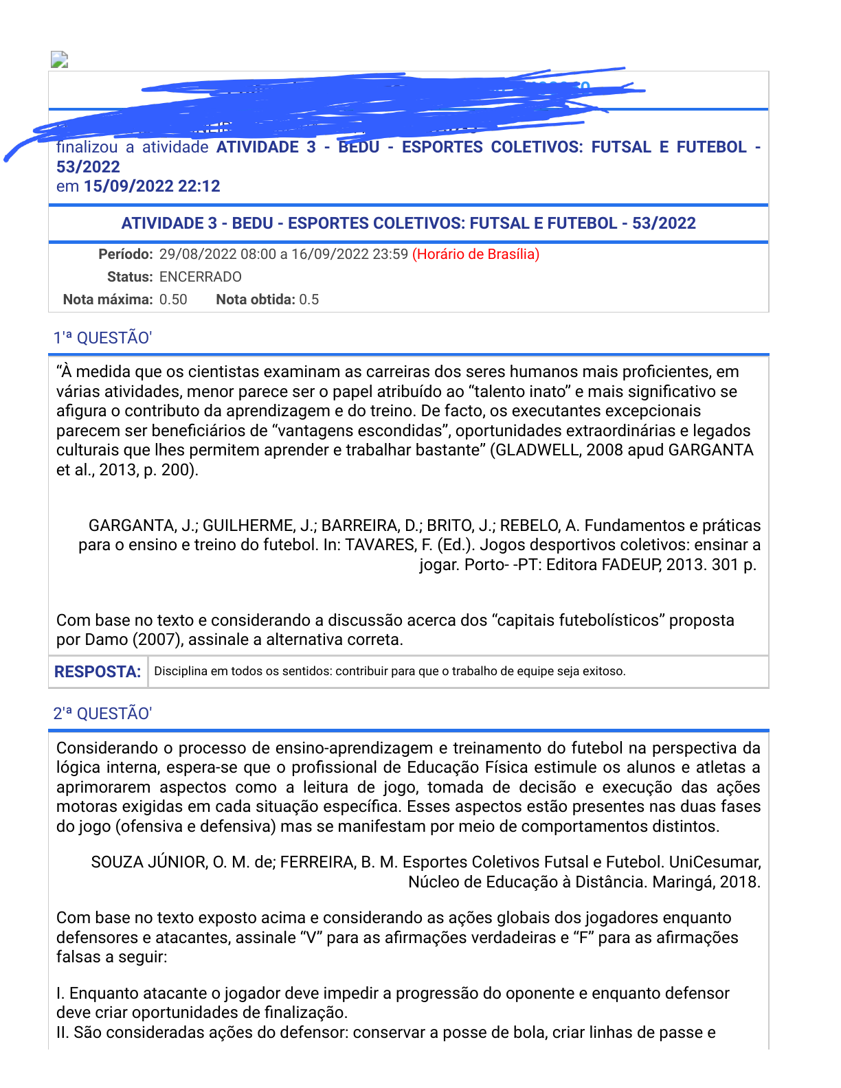 Considerando o processo de ensino-aprendizagem e treinamento do futebol na perspectiva da lógica interna, espera-se que o profissional de Educação Física estimule os alunos e atletas a aprimorarem aspectos como a leitura de jogo, tomada de decisão e execução das ações motoras exigidas em cada situação específica. Com base no texto exposto acima e considerando as ações globais dos jogadores enquanto defensores e atacantes, assinale “V” para as afirmacoes verdadeiras e “F” para as afirmações falsas a seguir: I. Enquanto atacante o jogador deve impedir a progressão do oponente e enquanto defensor deve criar oportunidades de finalização. II. São consideradas ações do defensor: conservar a posse de bola, criar linhas de passe e progredir pelo campo do oponente. III. São consideradas ações do atacante: proteger o gol, reduzir o espaço de jogo e impedir a progressão do oponente. IV. As ações globais dos jogadores enquanto atacantes são realizadas somente no plano da organização. V. As ações globais dos jogadores enquanto defensores são realizadas somente no plano da informação.