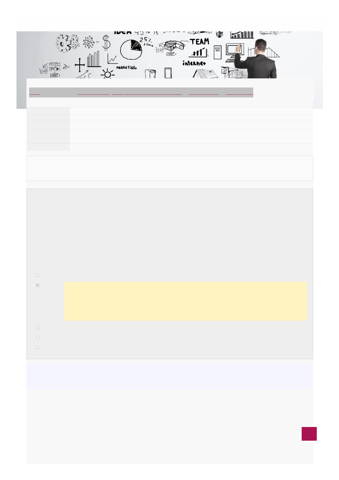 18/11/2022 20:52 Prova - Grau B: Revisão da tentativa https://eadgraduacao.ftec.com.br/mod/quiz/review.php?attempt=917110&cmid=405072 1/9 Painel / Meus cursos / 2022ED - Estratégias Empresariais - G91-1214EAD3EXT / Grau B e Grau C / Prova - Grau B Iniciado em terça, 8 Nov 2022, 12:01 Estado Finalizada Concluída em terça, 8 Nov 2022, 12:24 Tempo empregado 22 minutos 53 segundos Avaliar 5,80 de um máximo de 10,00(58%) Questão 1 Correto Atingiu 2,00 de 2,00 A formulação estratégica abrange uma série de atividades que a alta administração deve realizar no sentido de alcançar resultados consistentes. O conjunto de atividades pode ser dividido em alguns passos, como os apresentados a seguir. I - Analisar oportunidades e ameaças do ambiente interno. II - Analisar os pontos fortes e fracos do ambiente externo. III - Estabelecer a missão organizacional e seus objetivos gerais. IV - Formular estratégias a partir da análise dos ambientes interno e externo. Estão corretos APENAS os passos: Escolha uma opção: a. II e III. b. III e IV. Muito bem, você acertou. Somente III e IV estão corretas, pois I e II apresentam os seguintes erros: Analisar oportunidades e ameaças do ambiente interno. O correto seria ambiente externo, onde se encontram as oportunidades e ameaças. II - Analisar os pontos fortes e fracos do ambiente externo. (novamente o erro está no tipo de ambiente, pois pontos fortes e fracos encontramos no ambiente Interno) c. I e II. d. I e IV. e. I e III. Sua resposta está correta. A resposta correta é: III e IV. https://eadgraduacao.ftec.com.br/course/view.php?id=5205 https://eadgraduacao.ftec.com.br/my/ https://eadgraduacao.ftec.com.br/course/view.php?id=5205 https://eadgraduacao.ftec.com.br/course/view.php?id=5205§ion=8 https://eadgraduacao.ftec.com.br/mod/quiz/view.php?id=405072 18/11/2022 20:52 Prova - Grau B: Revisão da tentativa https://eadgraduacao.ftec.com.br/mod/quiz/review.php?attempt=917110&cmid=405072 2/9 Questão 2 Incorreto Atingiu 0,00 de 0,60 Questão 3 Correto Atingiu 0,60 de 0,60 Observe a figura a seguir, que apresenta o processo estratégico. Analise as afirmações a seguir sobre o processo estratégico apresentado na figura anterior: I. A intenção estratégia está representada pela missão, visão e valores da empresa II. A análise externa representa somente as forças competitivas do setor onde a empresa atua III. A análise interna apresenta as forças e fraquezas da empresa É correto apenas o que se afirma em: Escolha uma opção: a. Apenas I. b. I e III. c. Apenas III. d. II e III. e. I e II. Sua resposta está incorreta. A resposta correta é: I e III. As editoras e livrarias acompanham o crescimento do mercado de jogos digitais e muitas livrarias incluíram jogos digitais em seu portfólio de produtos. Setor farmacêutico, podemos encontrar farmácias que produzem ou comercializam medicações homeopáticas e manipuladas, bem como farmácias que revendem os medicamentos alopáticos oriundos de laboratórios da indústria farmacêutica. A partir do modelo de cinco forças de Porter e da caracterização da relação entre livros e jogos digitais no mercado, conclui-se que se trata de: Escolha uma opção: a. ameaça de substitutos. b. ameaça de complementadores. c. ameaça de entrada. d. ameaça de compradores. e. ameaça de rivalidade. Sua resposta está correta. A resposta correta é: ameaça de substitutos. 18/11/2022 20:52 Prova - Grau B: Revisão da tentativa https://eadgraduacao.ftec.com.br/mod/quiz/review.php?attempt=917110&cmid=405072 3/9 Questão 4 Incorreto Atingiu 0,00 de 0,60 Questão 5 Correto Atingiu 2,00 de 2,00 Uma rede paulistana de hotéis acaba de arrecadar 435 milhões de reais para seu primeiro fundo de investimentos em hotéis, criado no fim de 2011, em parceria com uma gestora de investimentos. É o primeiro fundo criado para comprar hotéis inteiros no Brasil. Nas próximas semanas, esse recurso financeiro vai ser usado para comprar seis empreendimentos e integrá-los à rede de 25 hotéis, que hoje fatura 255 milhões de reais. Outros 20 empreendimentos estão no radar do fundo em todas as regiões do Brasil, com exceção do Norte do país. (LETHBRIDGE, T. Exame, São Paulo, ano 46, n. 1017, p. 19, 30 mai. 2012 (adaptado). As organizações produtivas costumam definir como objetivo principal o aumento nas vendas, o incremento nos lucros, o aumento na participação de mercado ou, ainda, outras medidas de desempenho relacionadas ao crescimento e ao desenvolvimento do negócio. Metas de crescimento podem ser perseguidas por meio de estratégias diversas. Que estratégia foi utilizada pela rede de hotéis de que trata o caso acima para promover seu crescimento? Escolha uma opção: a. Integração horizontal. b. Joint Venture. c. Fusão. d. Diversificação. e. Integração vertical. Sua resposta está incorreta. A resposta correta é: Integração horizontal. Uma empresa vende assinaturas de transmissões online de eventos esportivos e culturais exclusivamente para smartphones. Em meio a diversas mudanças tecnológicas e de hábitos de consumo, como o advento da televisão pay per view e o crescimento do mercado de smartphones e tablets, os executivos dessa empresa realizaram uma pesquisa de mercado que apontou que as pessoas não compram mais de uma mídia para um mesmo evento. Um diagnóstico estratégico realizado por meio de uma análise SWOT, identificou as forças e fraquezas e as ameaças e oportunidades para a empresa nesse cenário. Com base nessa situação hipotética, avalie o diagnóstico estratégico, realizado por meio de análise SWOT, descrito nas afirmações a seguir: I. A televisão pay per view é uma concorrente da empresa e representa uma ameaça ao seu negócio. II. A atuação da empresa com a venda de assinaturas de transmissões online para smartphones representa uma oportunidade para o seu negócio. III. O crescimento do mercado de smartphones é um ponto forte para a empresa. É